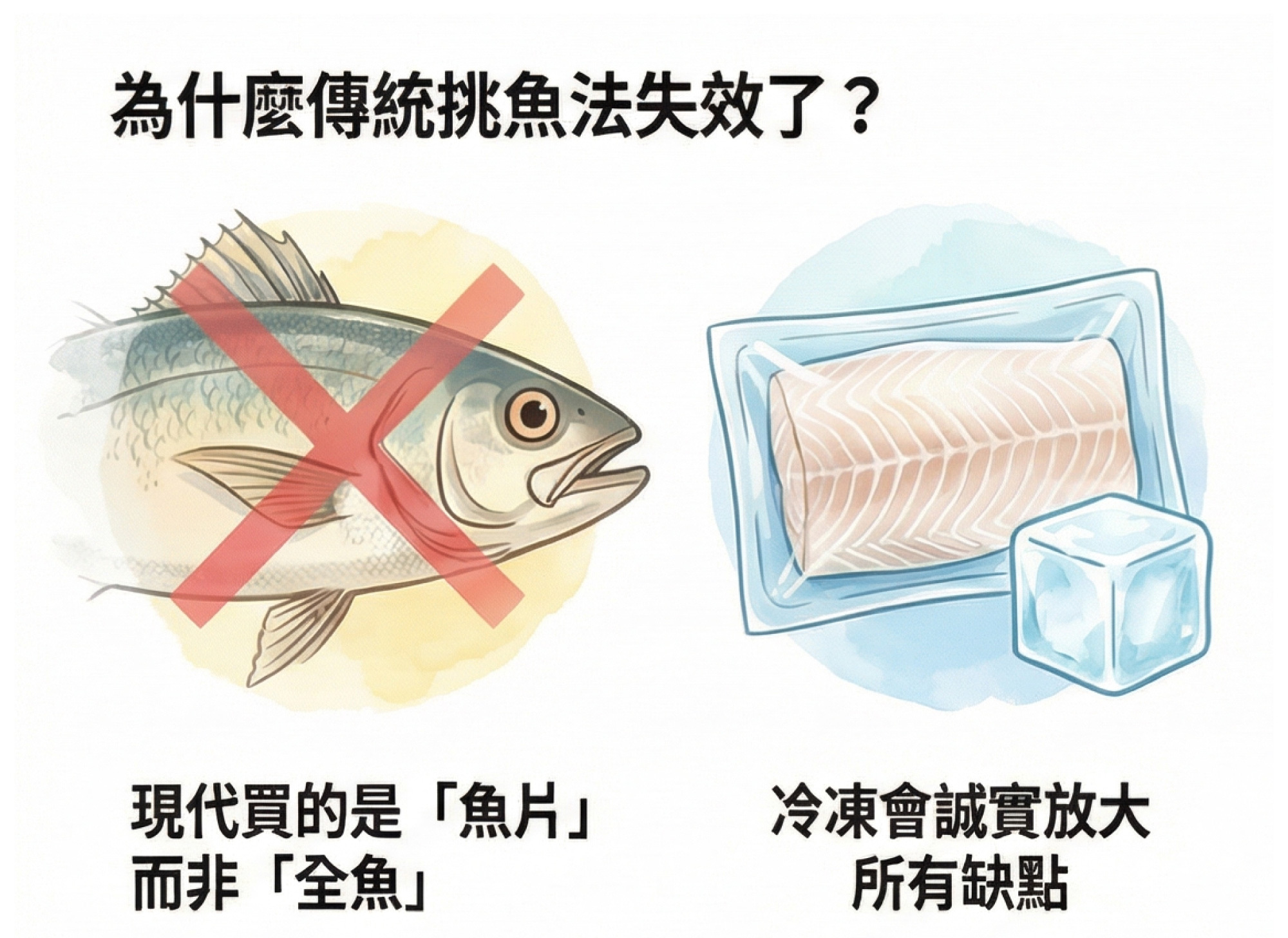 但我想老實說一句——現在大家買的,根本不是整條魚,是魚片。你到底要看哪一顆眼睛?又要去哪裡翻人家的腮幫子?老實講,看外表真的沒什麼用。
