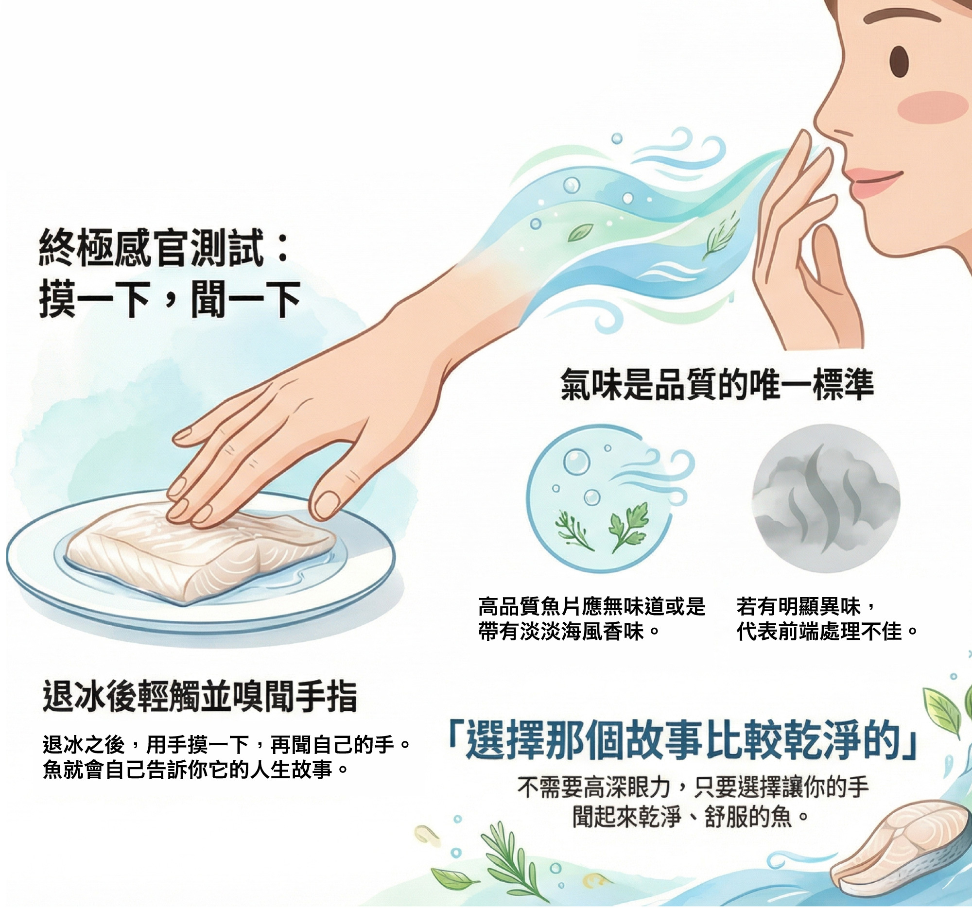 摸一下、聞一下,魚就會自己告訴你它的人生故事。而你,只要選擇那個故事比較乾淨的,就好了。