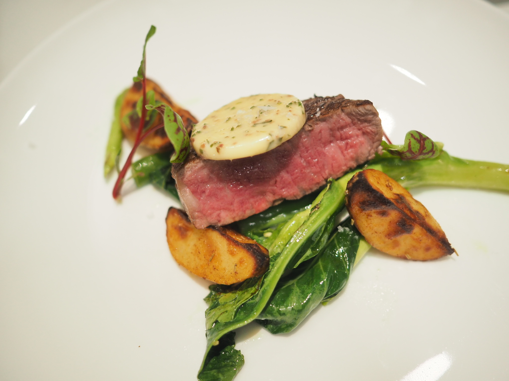 這道牛肉料理是西餐經典的風味搭配,選用澳洲安格斯黑牛菲力牛排,是來自澳洲純淨牧場以穀飼養殖的安格斯牛,牛肉風味純淨香氣十足,而菲力部位脂肪含量較其他部位低,品嘗起來不膩口,搭配鯷魚奶油增添鹹香豐厚的氣味正好!還有做為配餐的肯瓊烤洋芋,就跟餐廳完整的一客牛排餐點一樣,美味又能飽餐一頓。