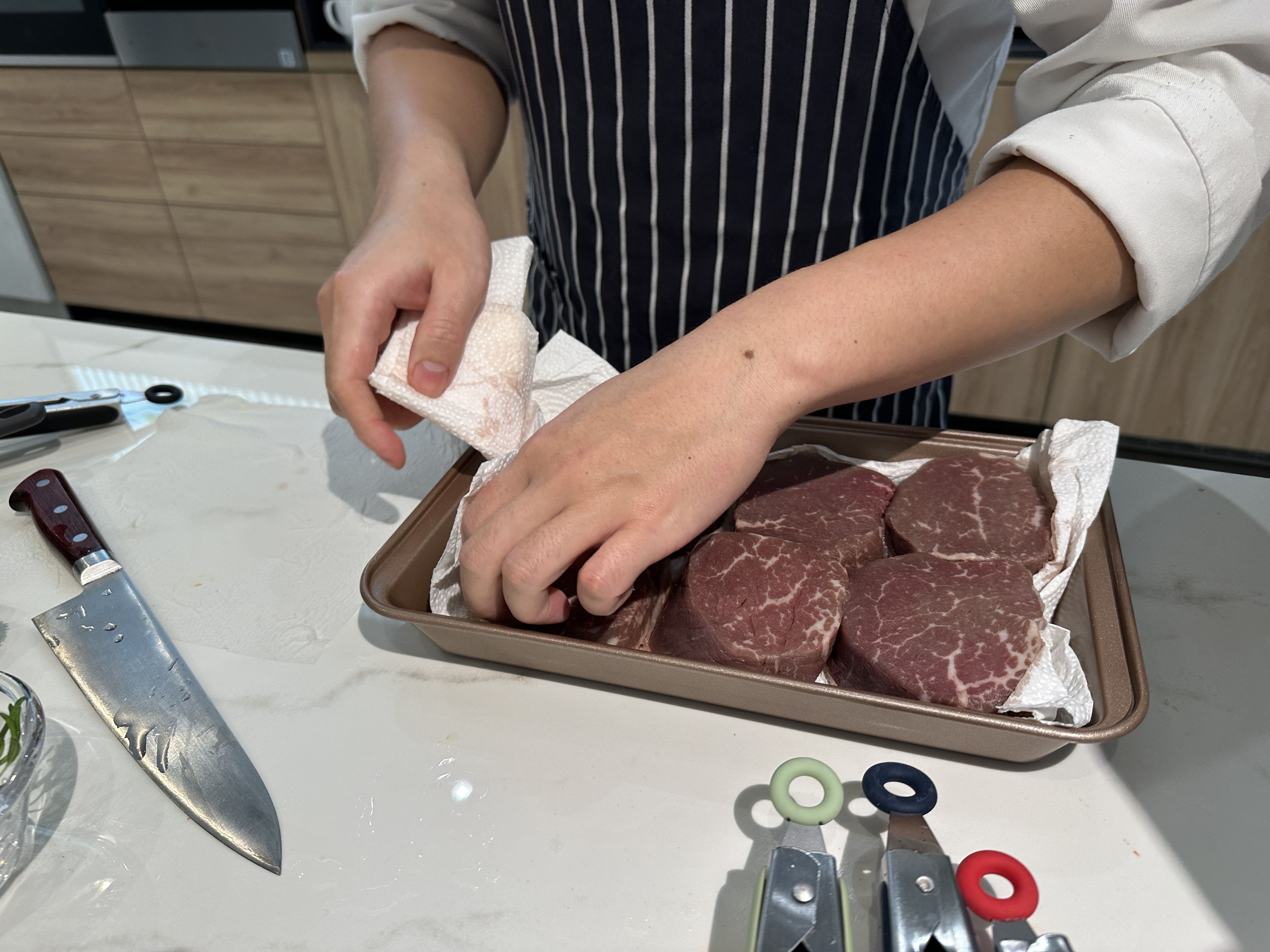 1.牛排取出擦乾血水並撒上鹽及橄欖油