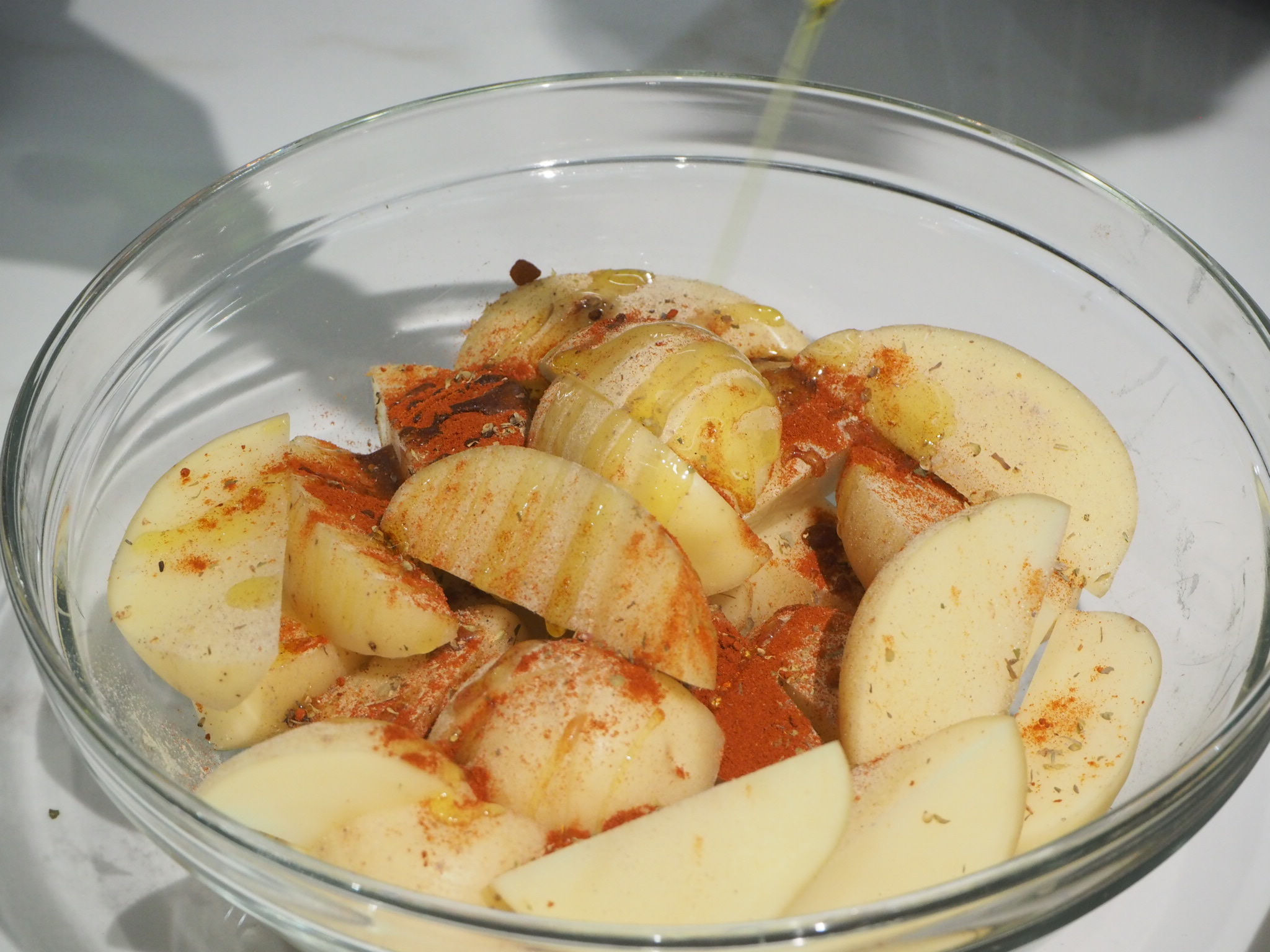 2.拌入紅椒粉、鹽、胡椒、百里香及義式香料等,再淋上橄欖油