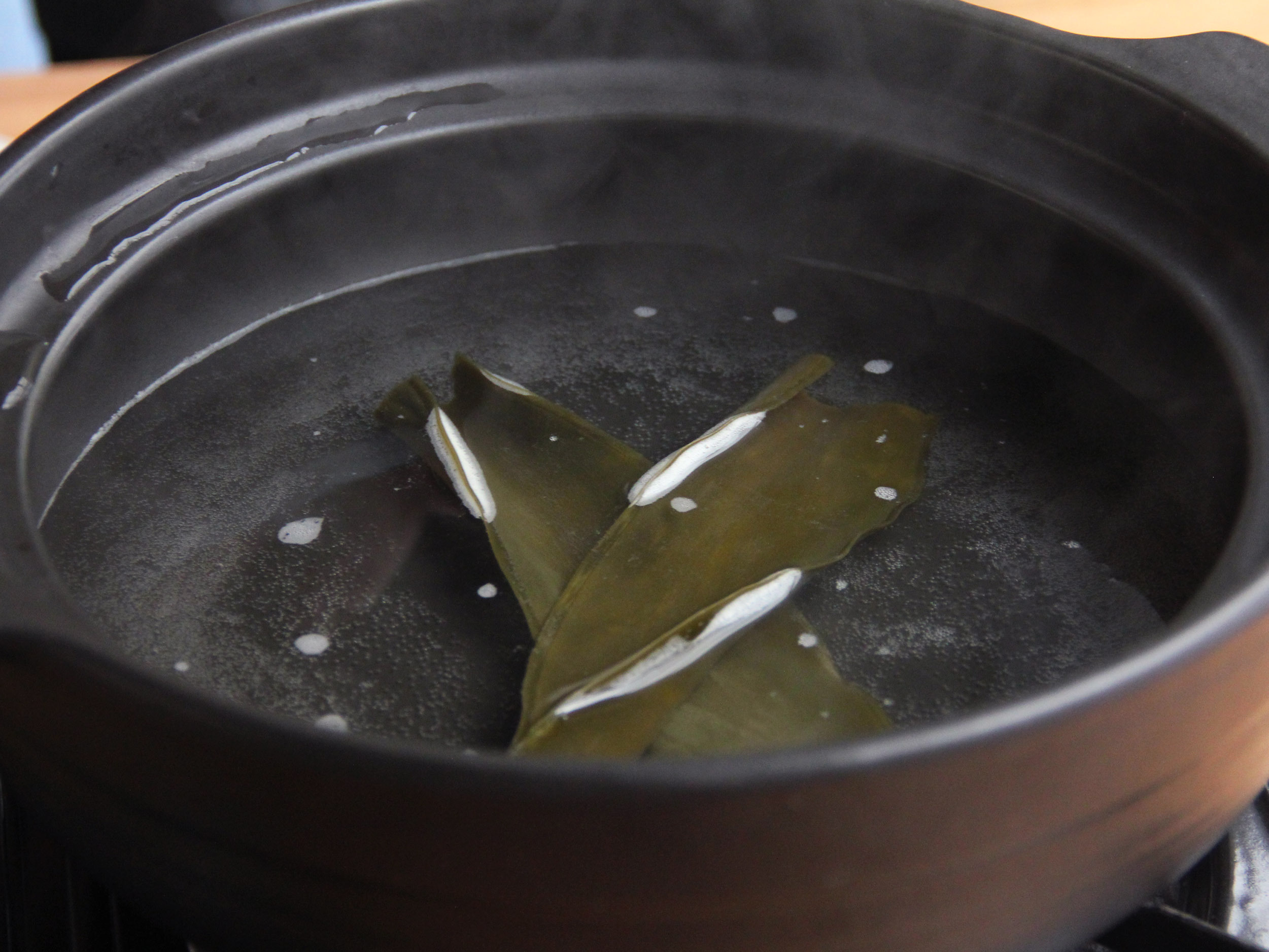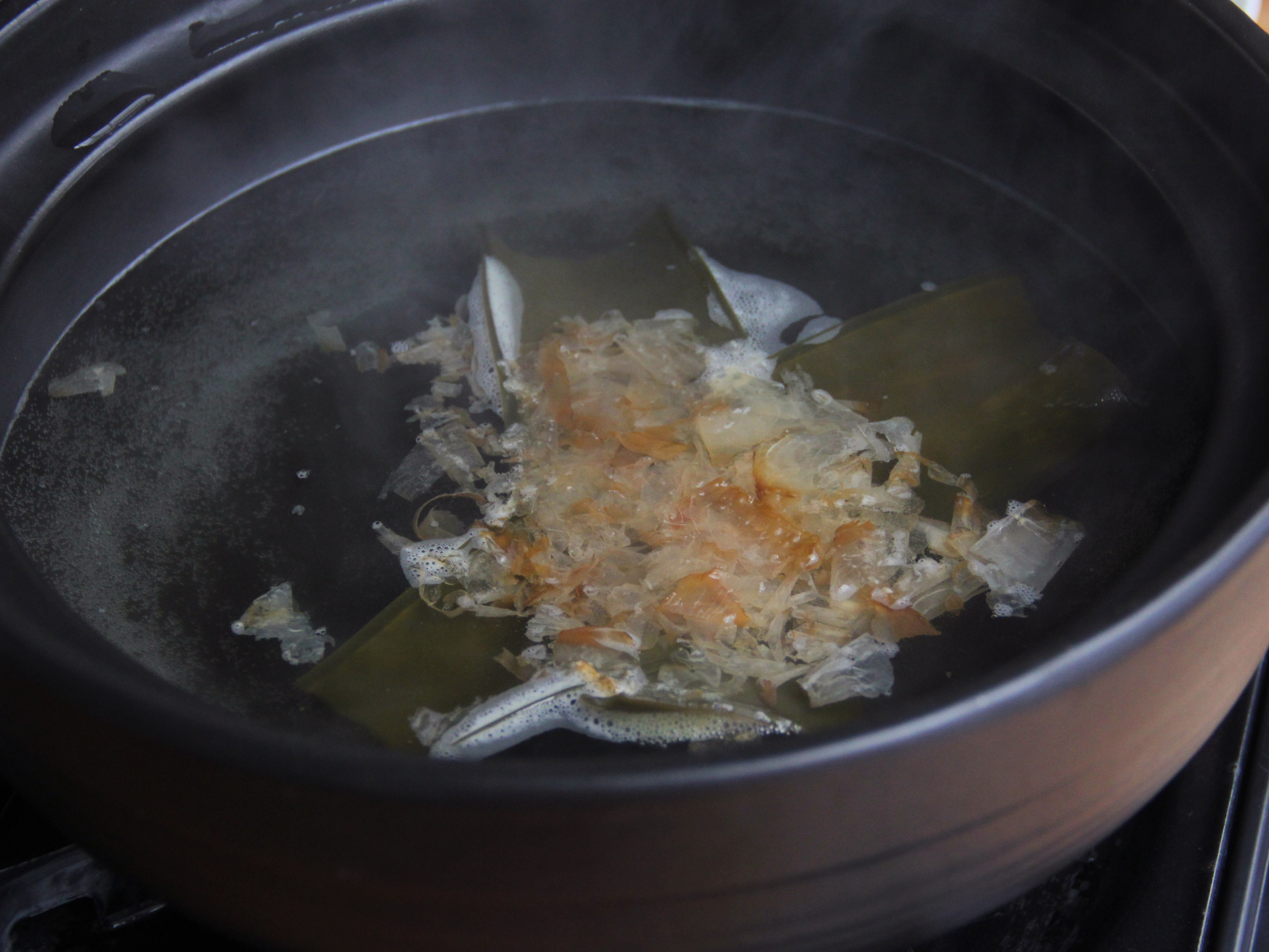 1.冷水放入昆布,以中火加熱至小泡後,關火