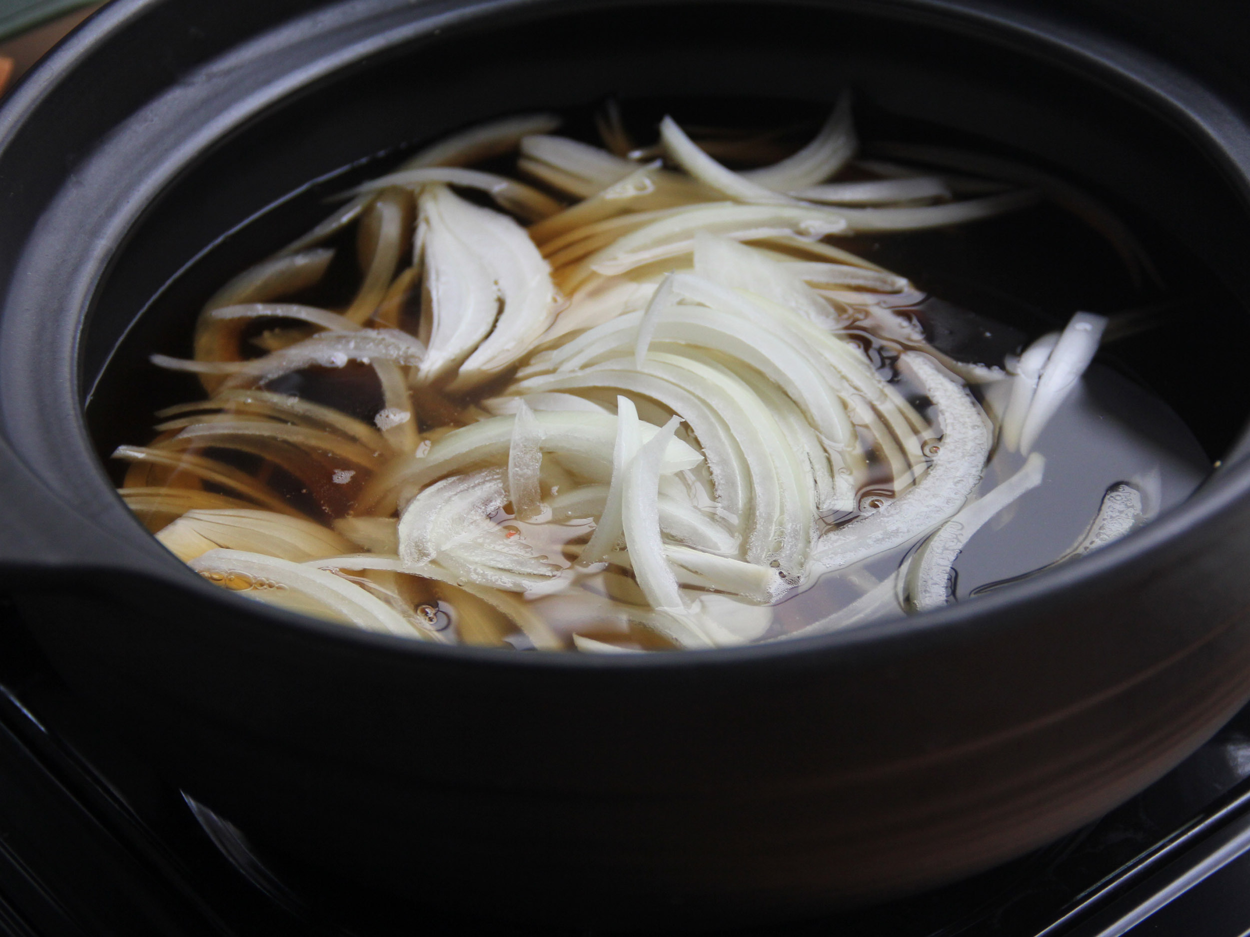 2.步驟1加入醬油、味琳、糖、米酒並放入半顆洋蔥,小火煮10分鐘,即完成壽喜燒湯汁