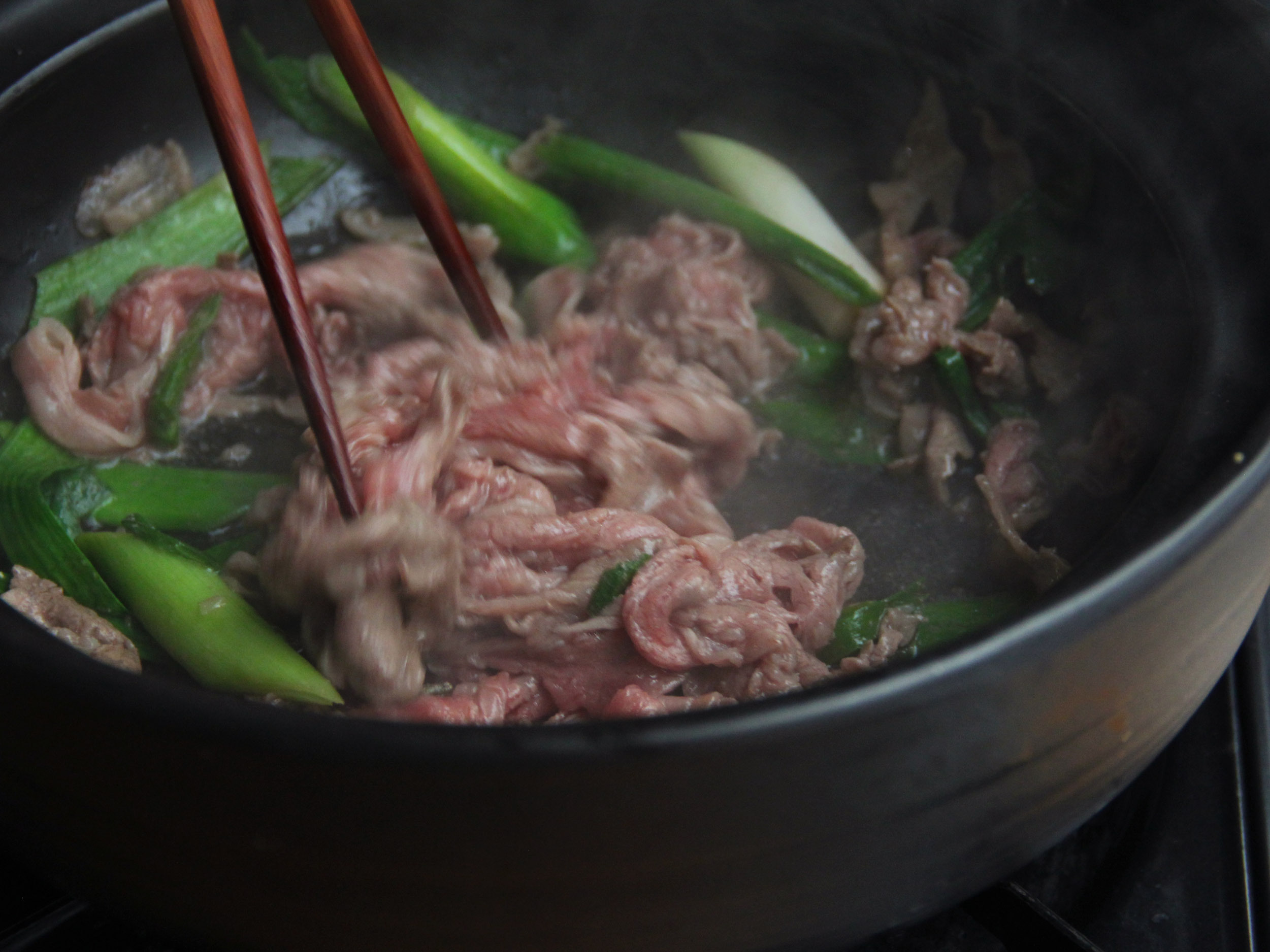 3.放入蒜苗及一半牛肉、黑胡椒、鹽、少量壽喜燒湯汁炒至半熟拿起