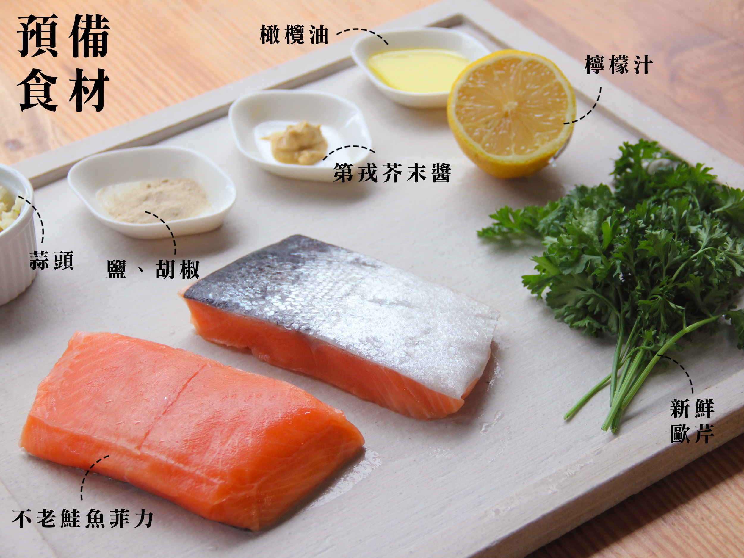這道料理最棒的地方就是簡單、快速,三步驟完成一道法式烤鮭魚。只需要準備不老鮭菲力和醬汁材料,