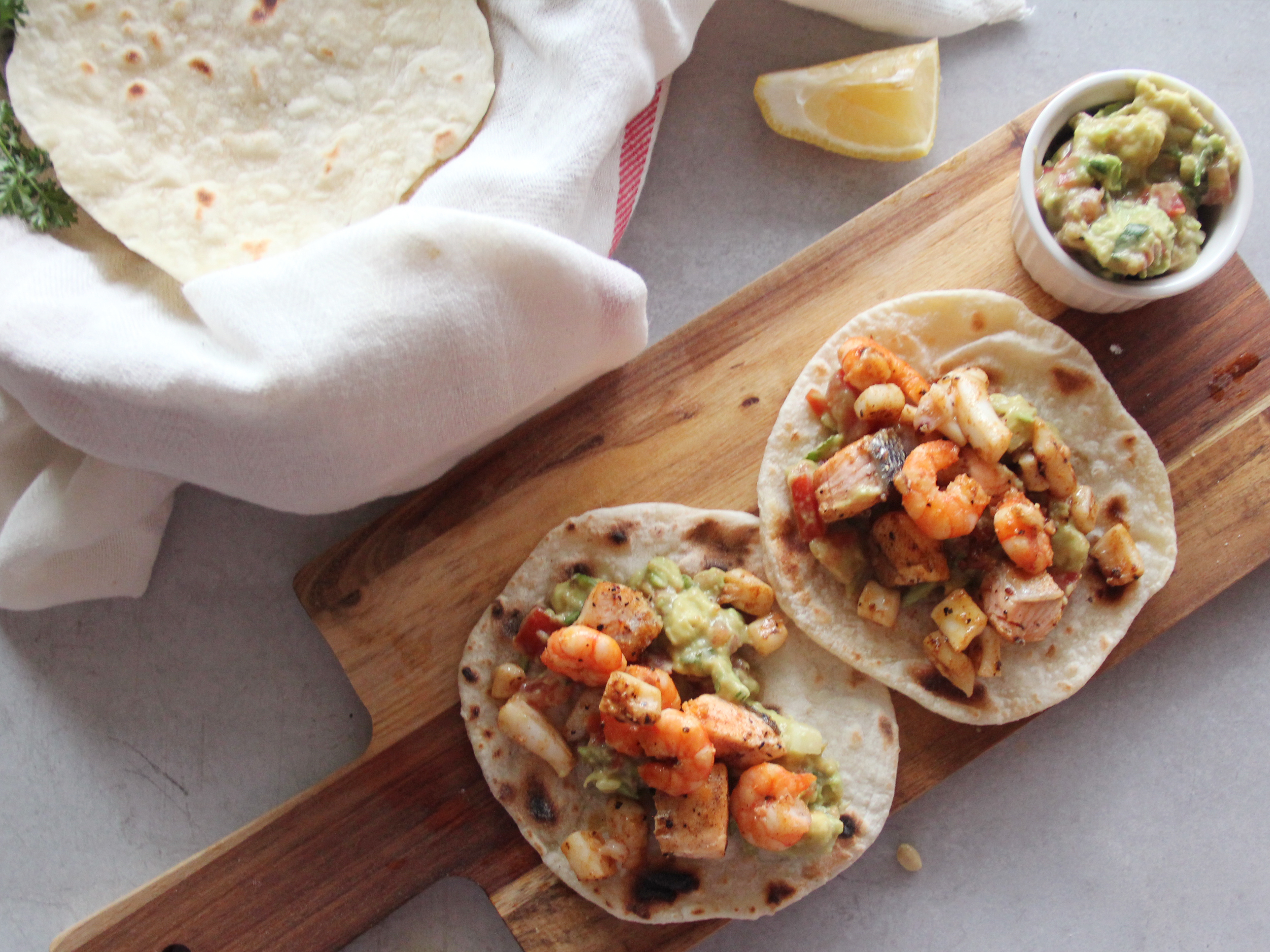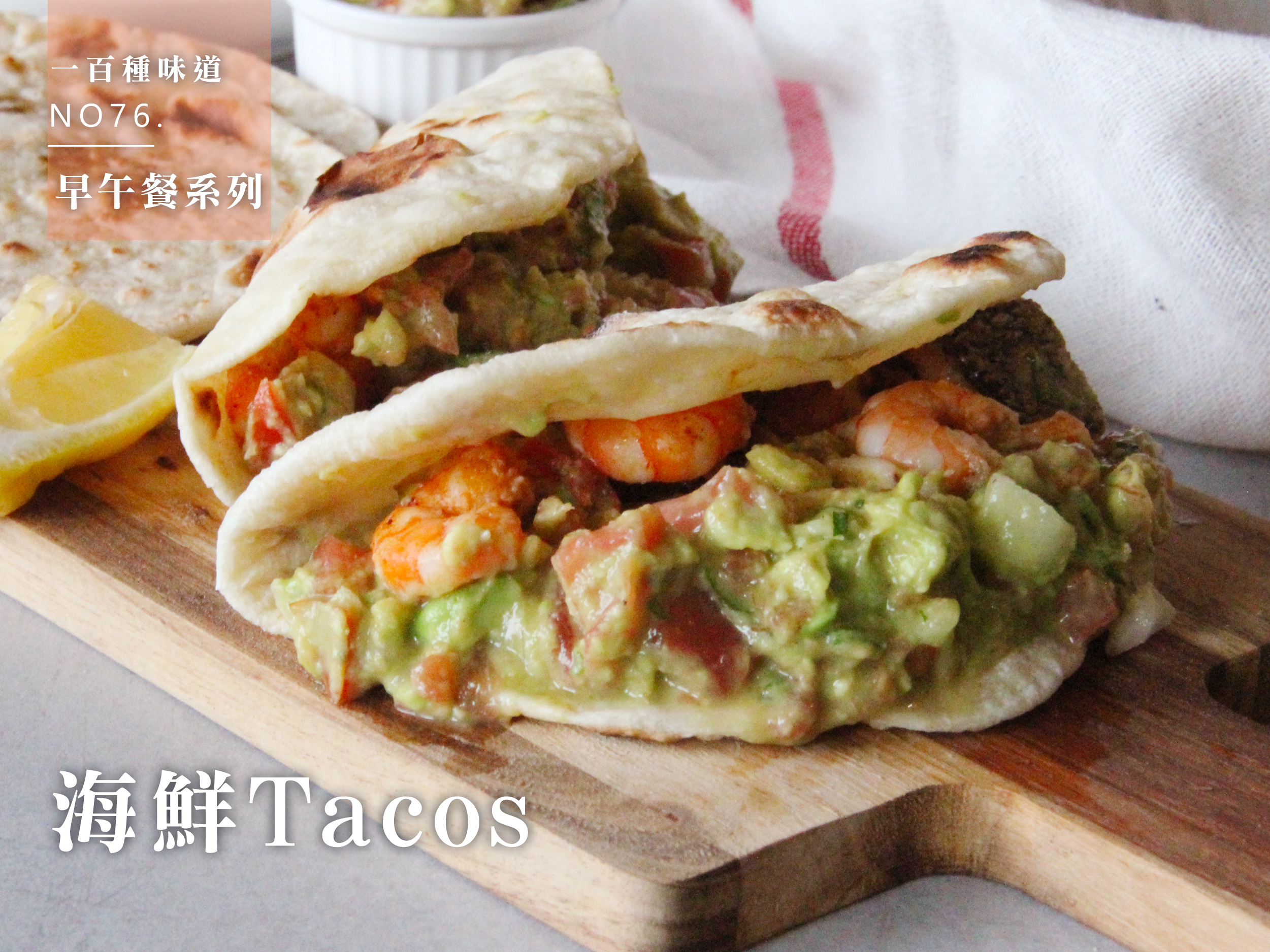 取墨西哥薄餅,夾入餡料淋上酪梨醬,完成
