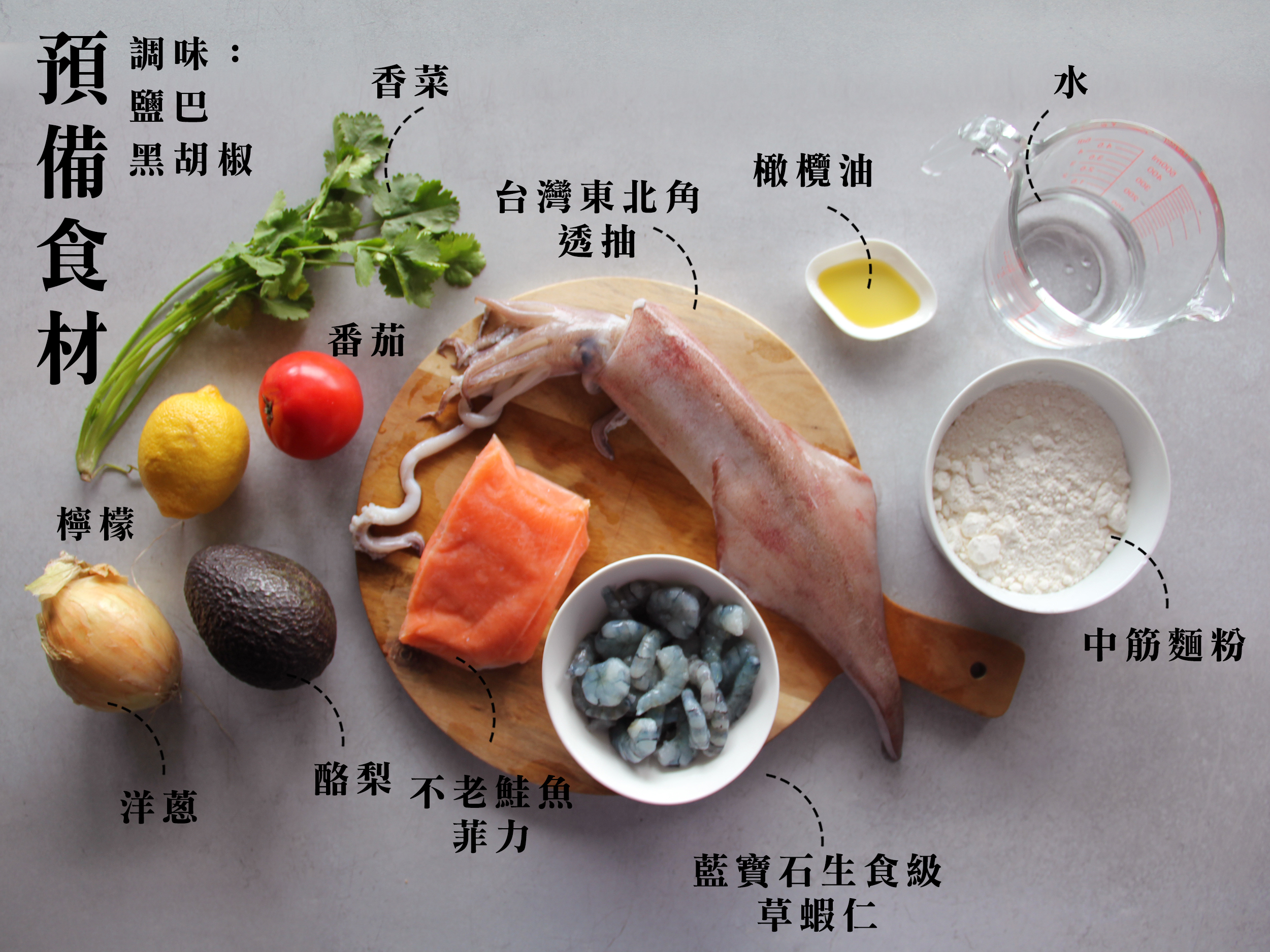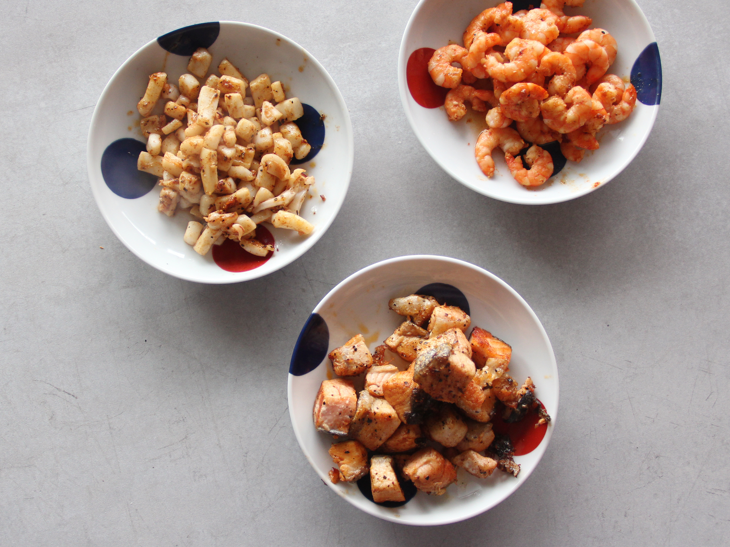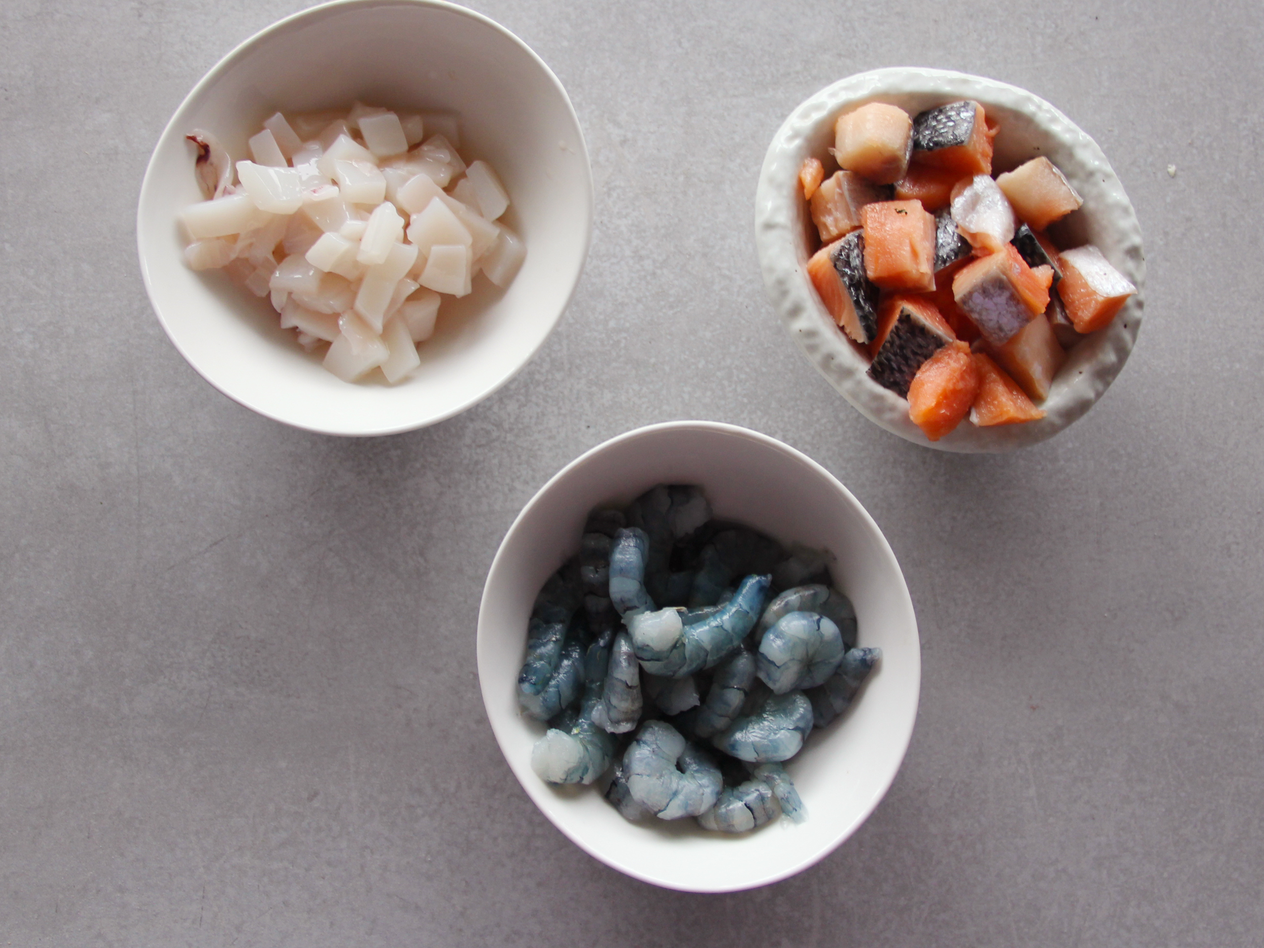下油熱鍋,用中大火分別把鮭魚、透抽、蝦仁炒熟,用鹽、胡椒、紅椒粉調味