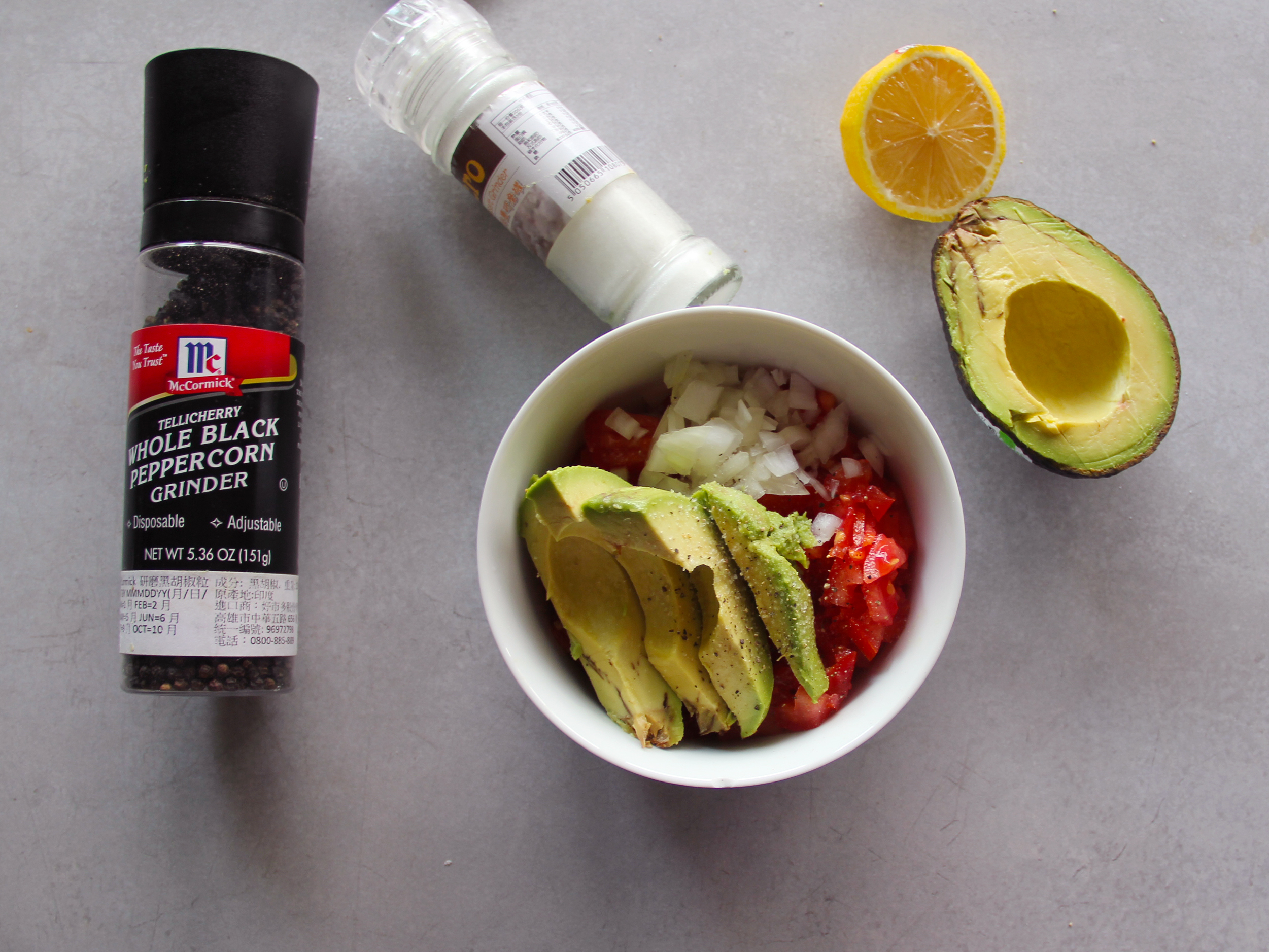 番茄與洋蔥切丁,酪梨切片,放入調理碗