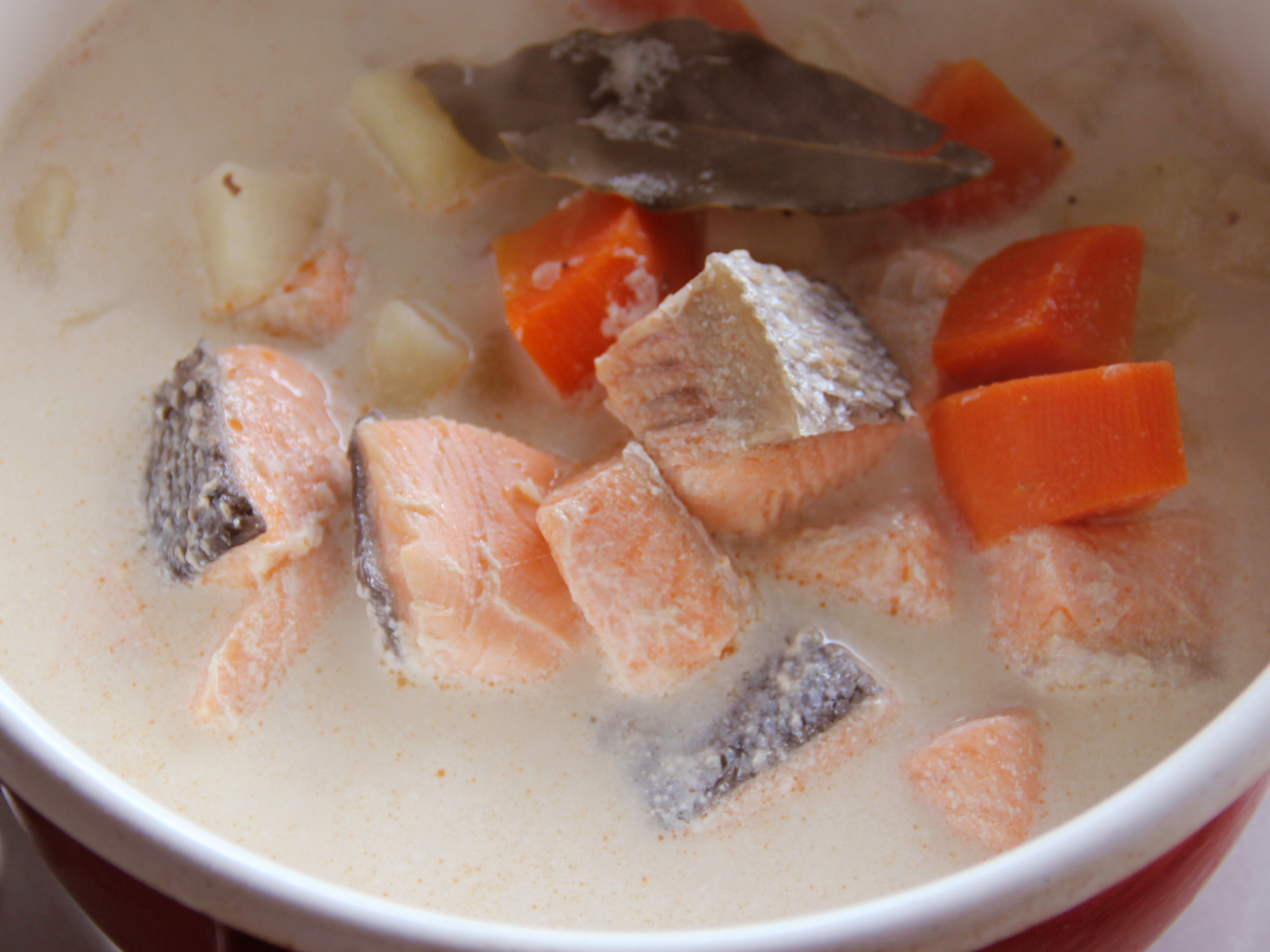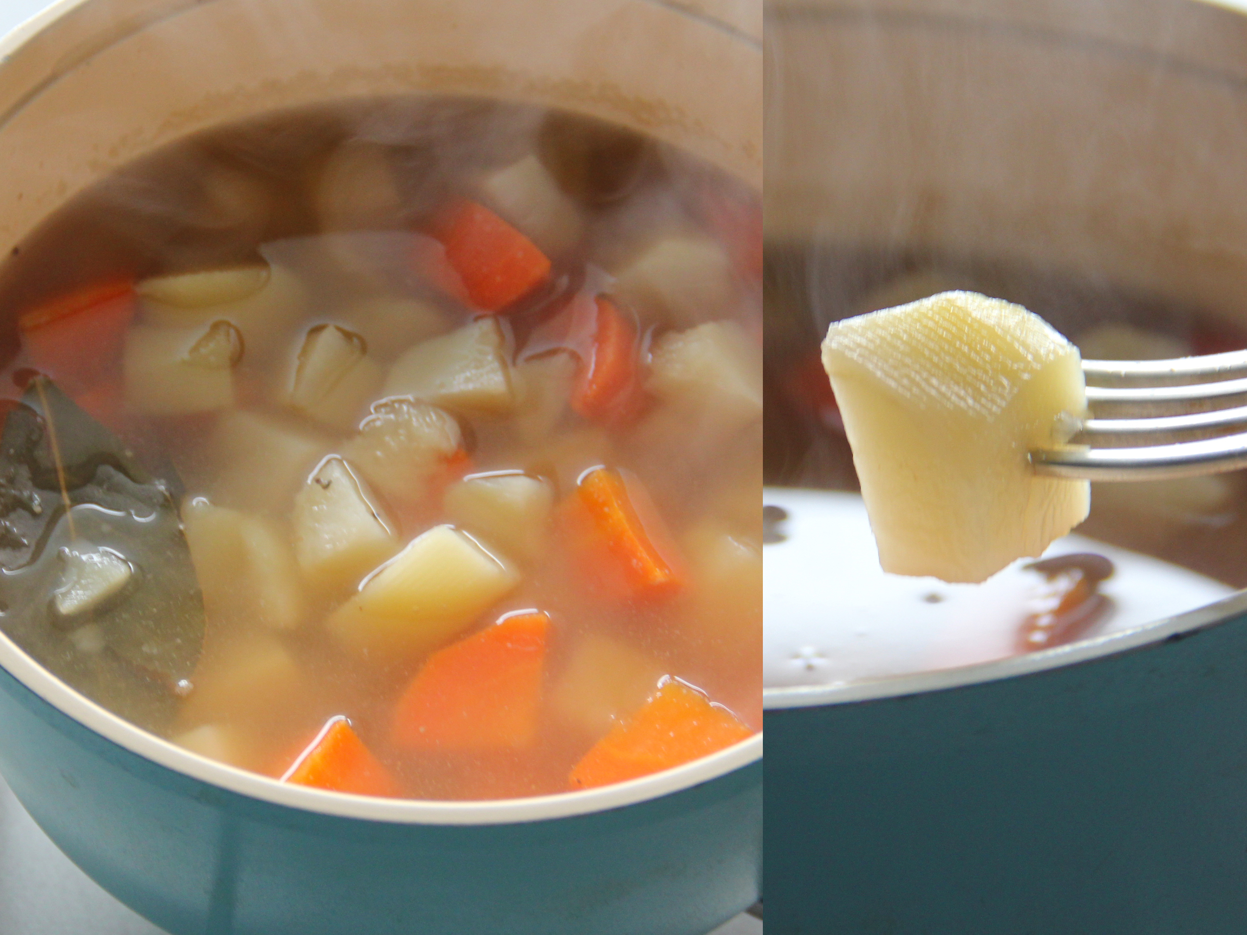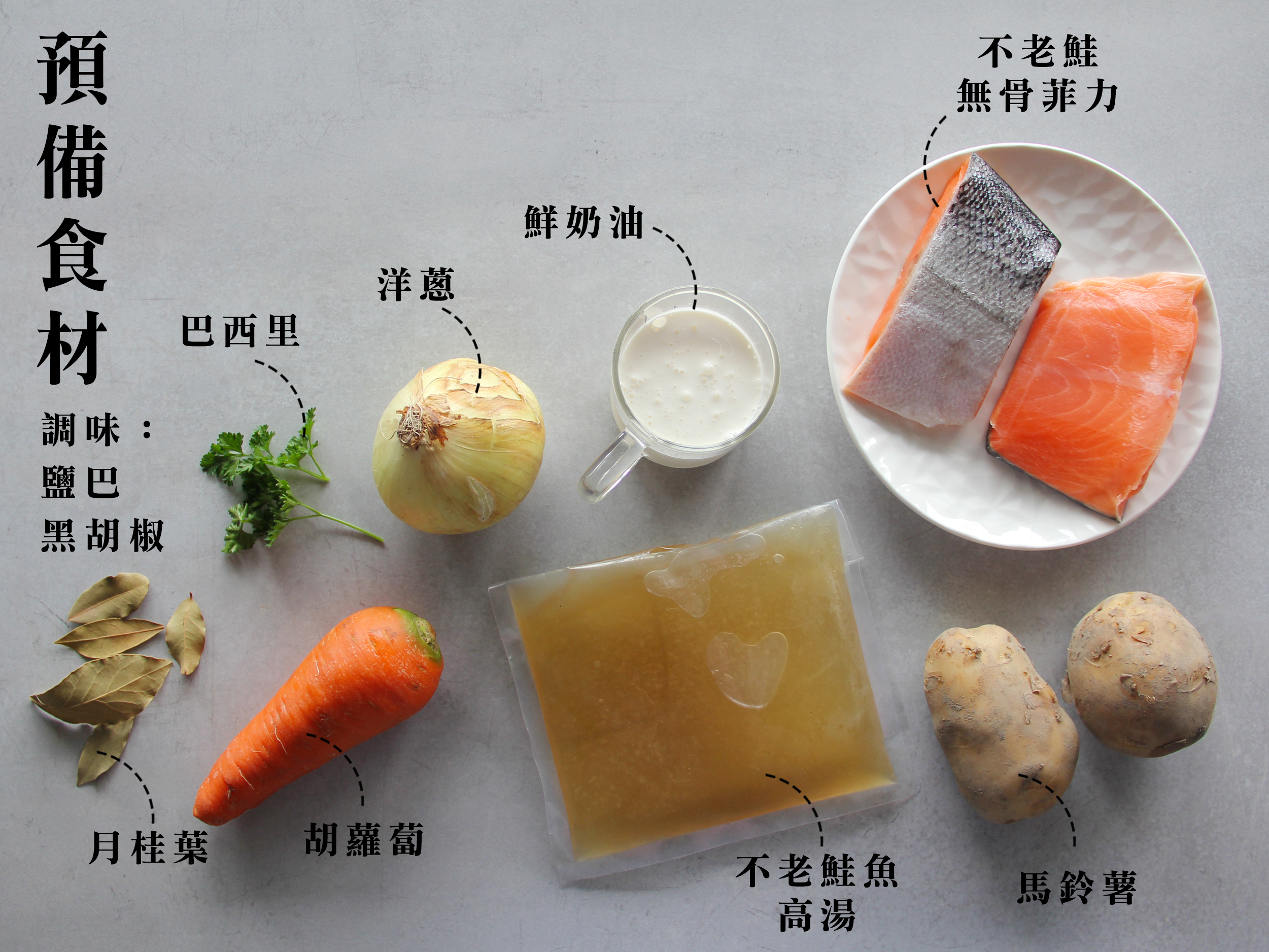 將不老鮭魚高湯放入內鍋,在爐火上煮沸後,放進鹽、黑、胡椒粒及月桂葉,轉中小火續煮;待再度沸騰,加入馬鈴薯和胡蘿蔔,確認馬鈴薯是否煮透(用叉子是否能穿透確認)