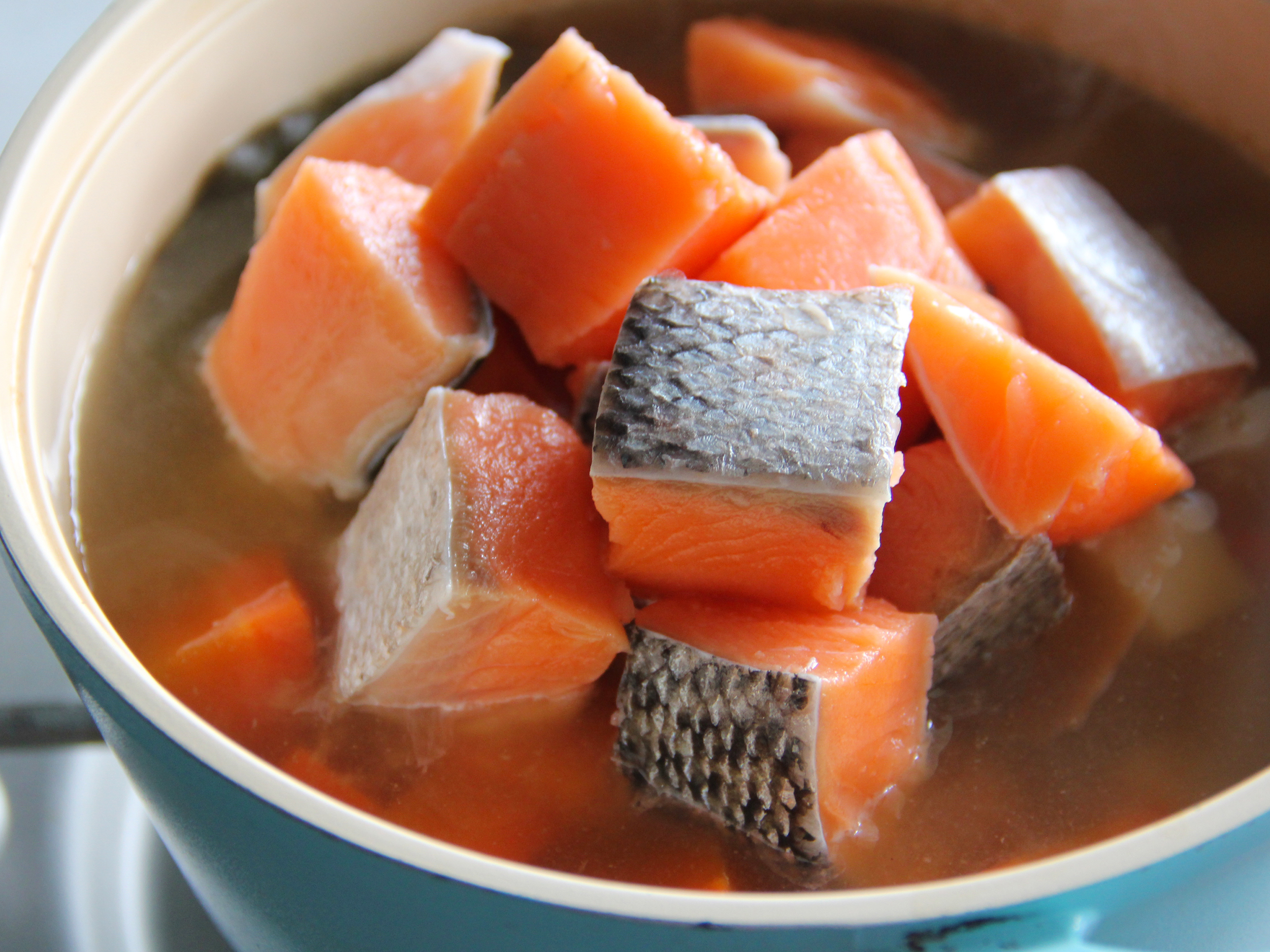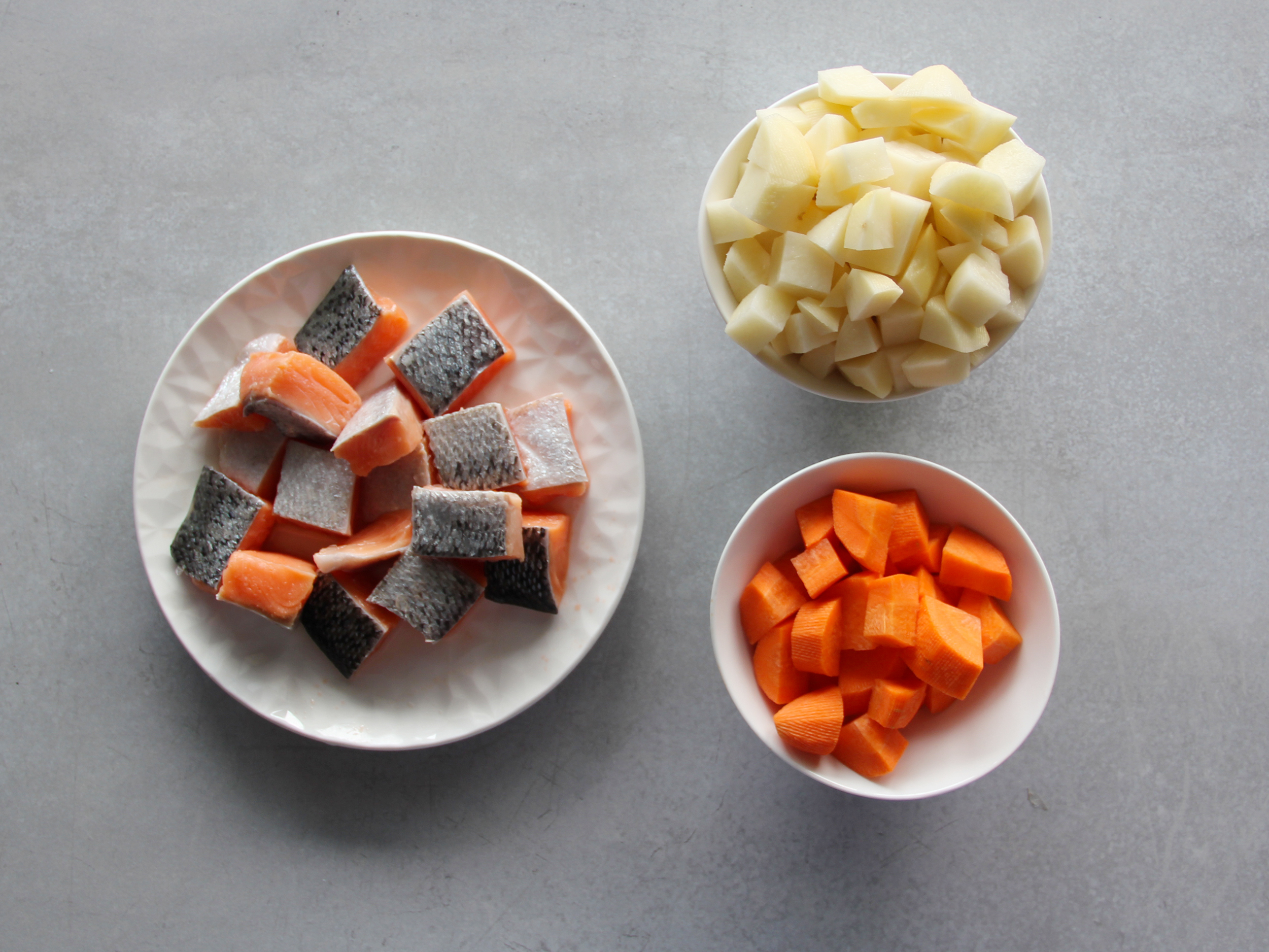 將馬鈴薯、胡蘿蔔去皮洗淨,連同鮭魚皆切成一口大小備用。