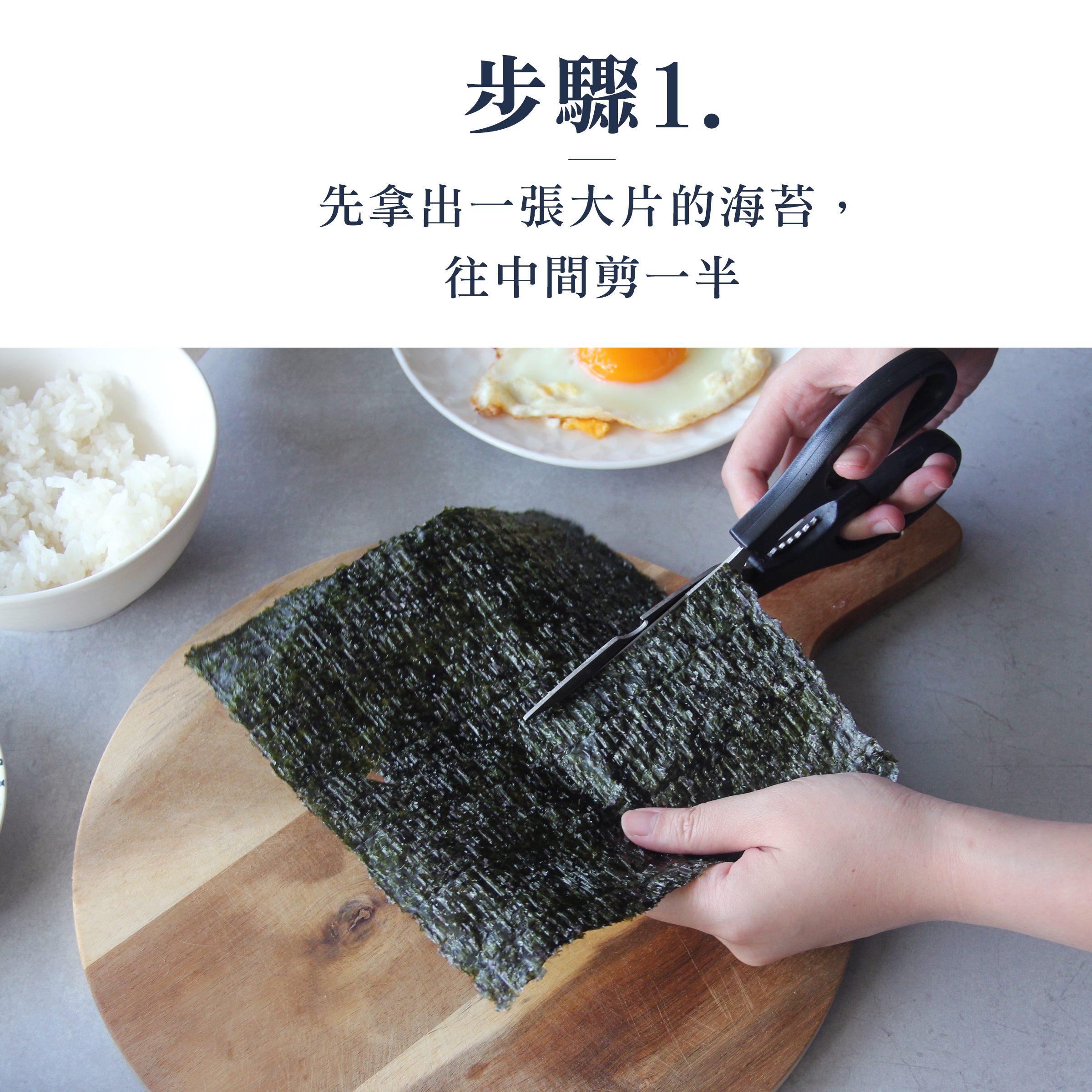 1.先拿出一張大片的海苔,往中間剪一半