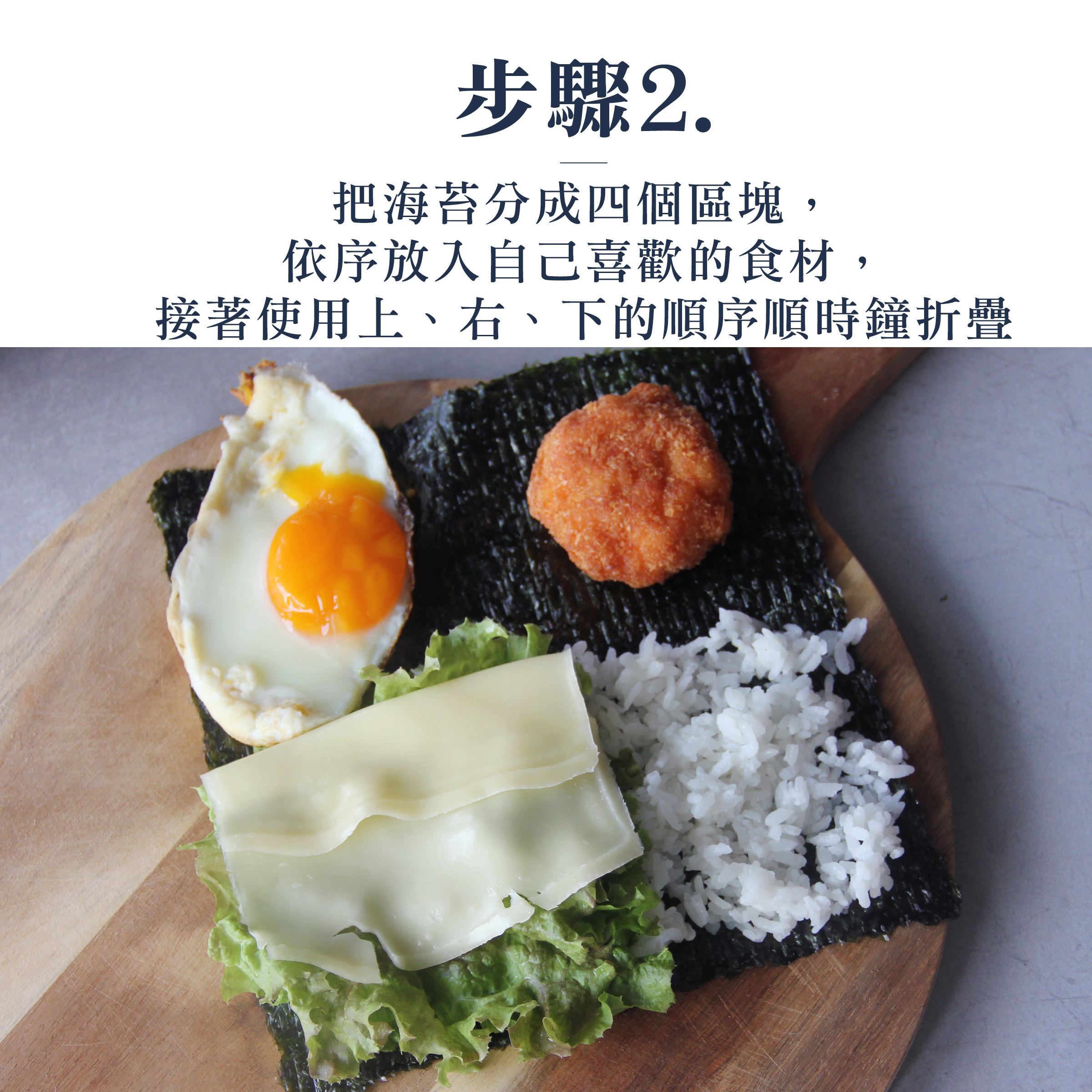 2.把海苔分成四個區塊,依序放入自己喜歡的食材,接著使用上、右、下的順序順時鐘折疊