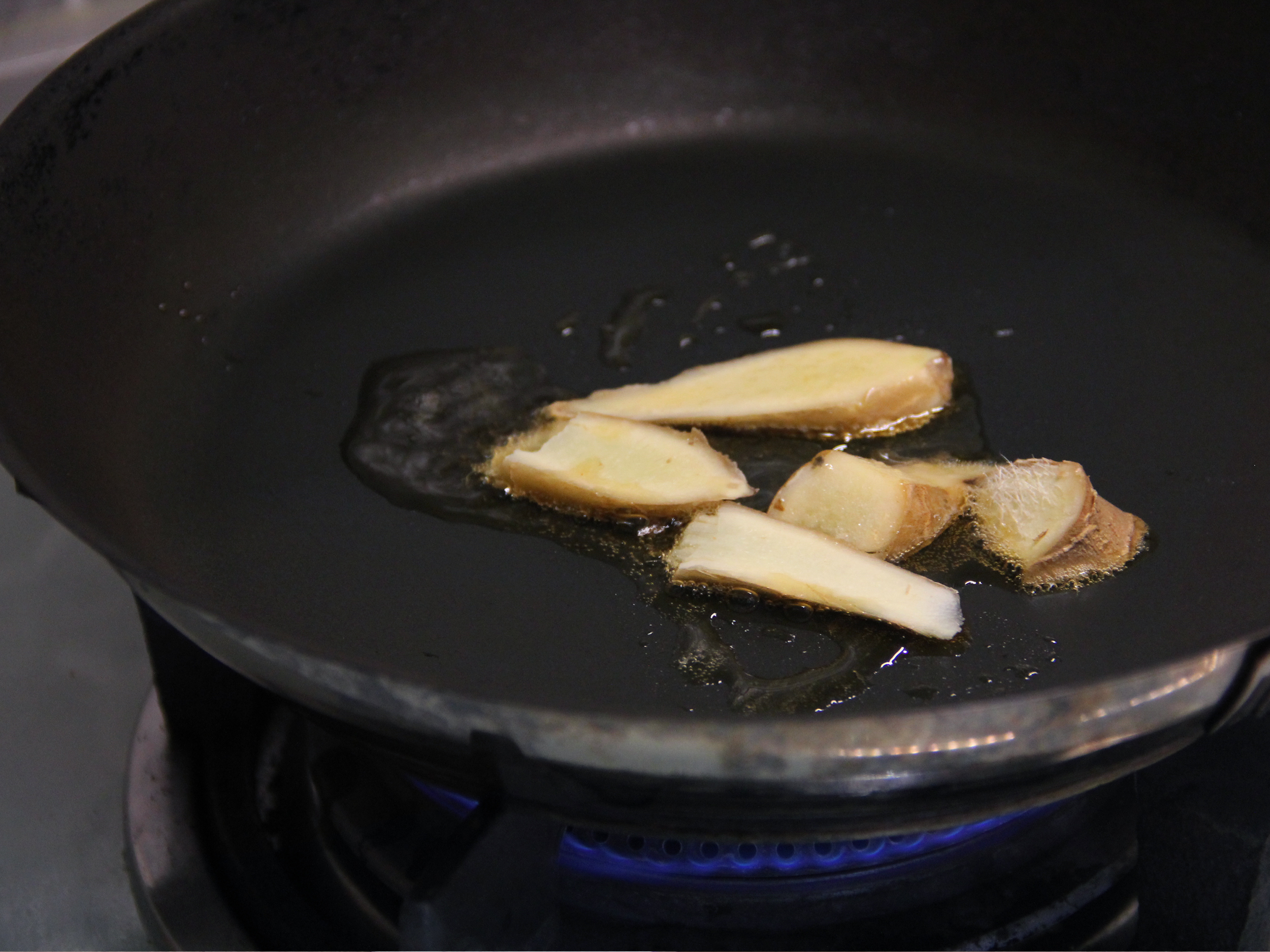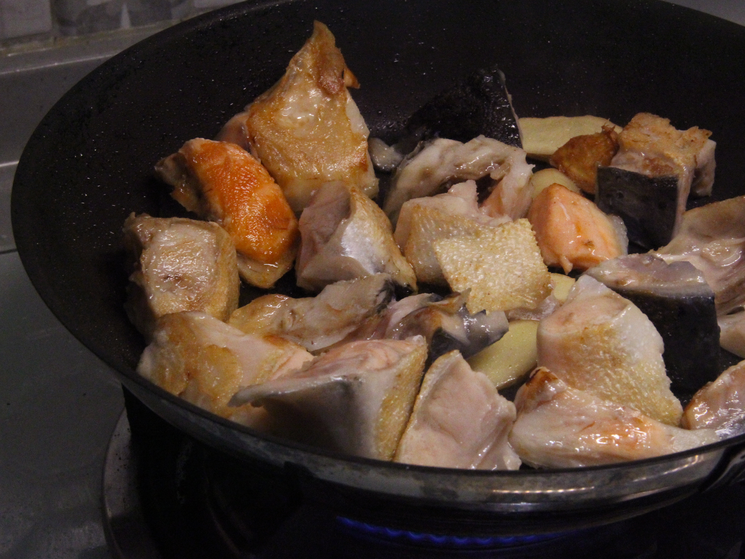 放入魚頭塊煎至金黃色藉此定型並逼出油脂