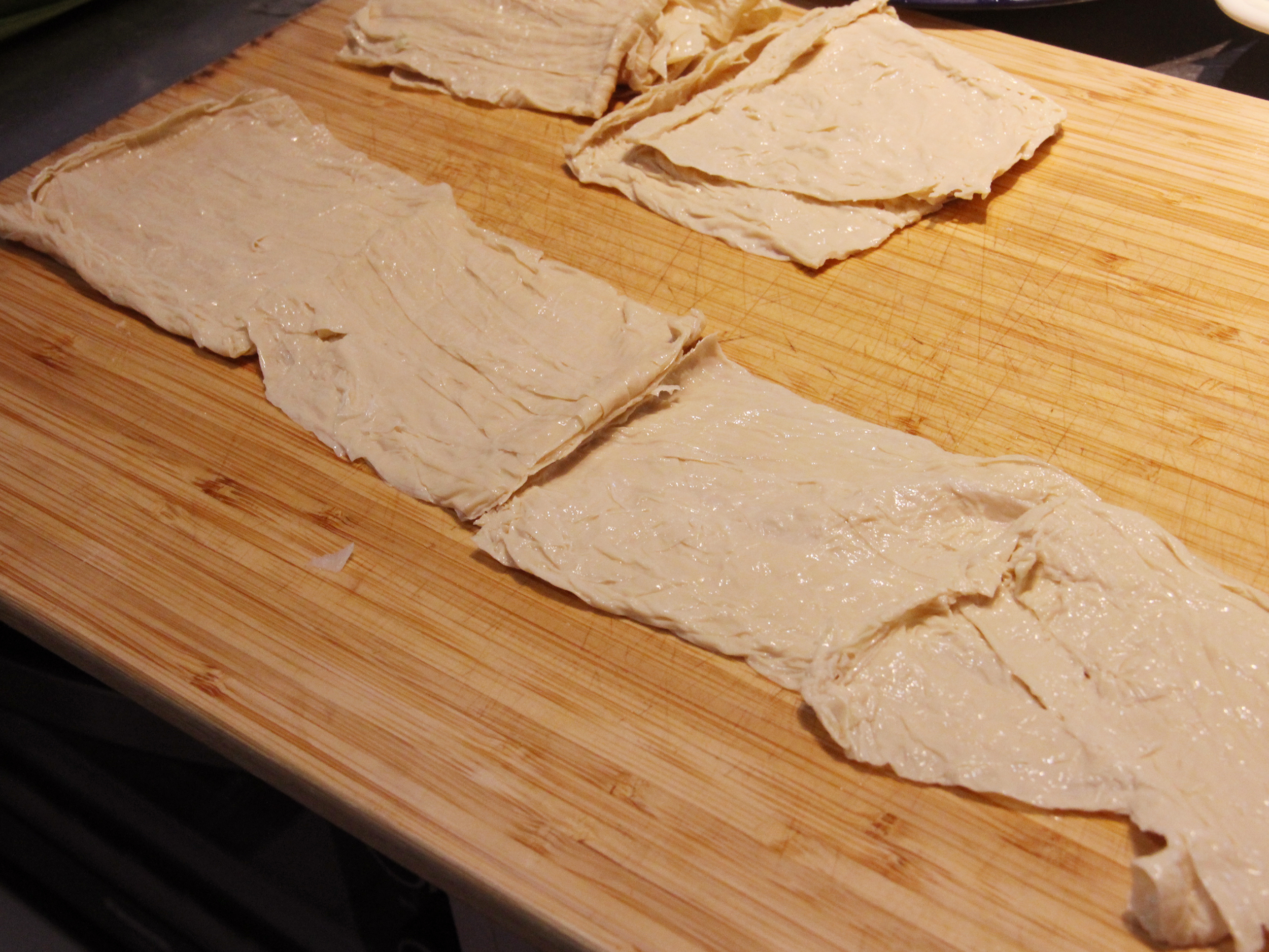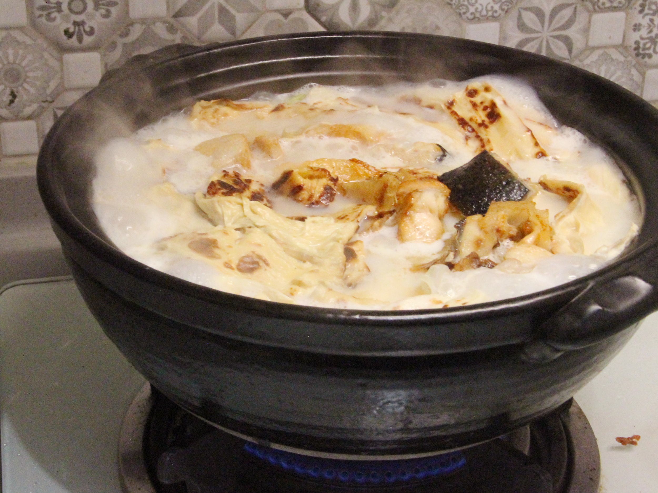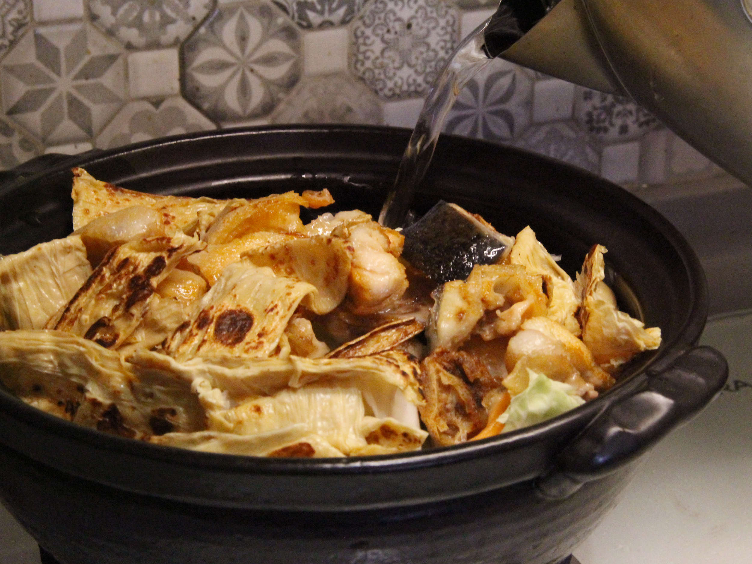再將豆皮、鮭魚頭放入,加進約鍋容量1/2-2/3的水