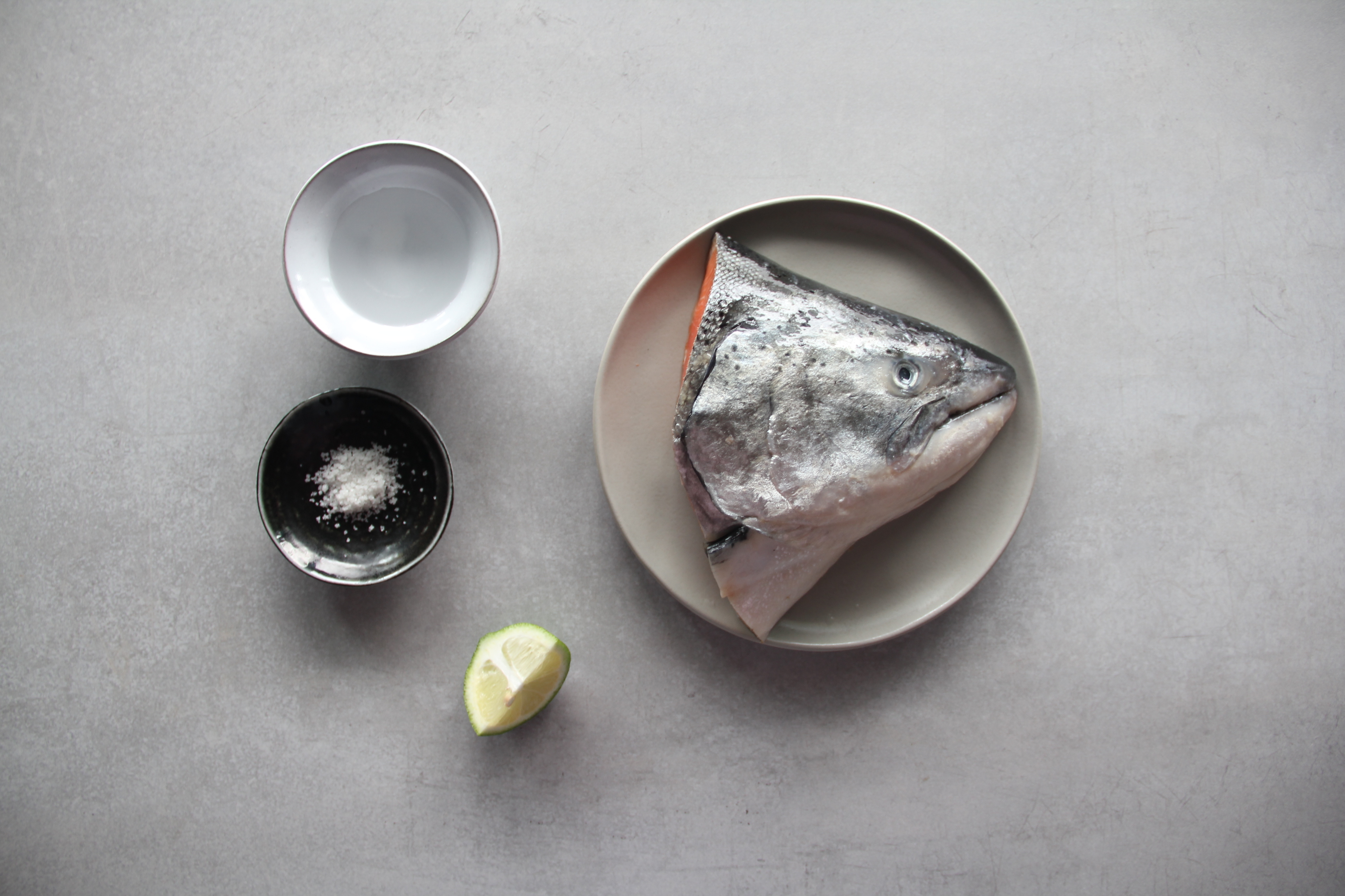 步驟1.鮭魚頭清洗後,用紙巾擦乾,倒米酒與半顆檸檬擠汁上去幫他抹一抹