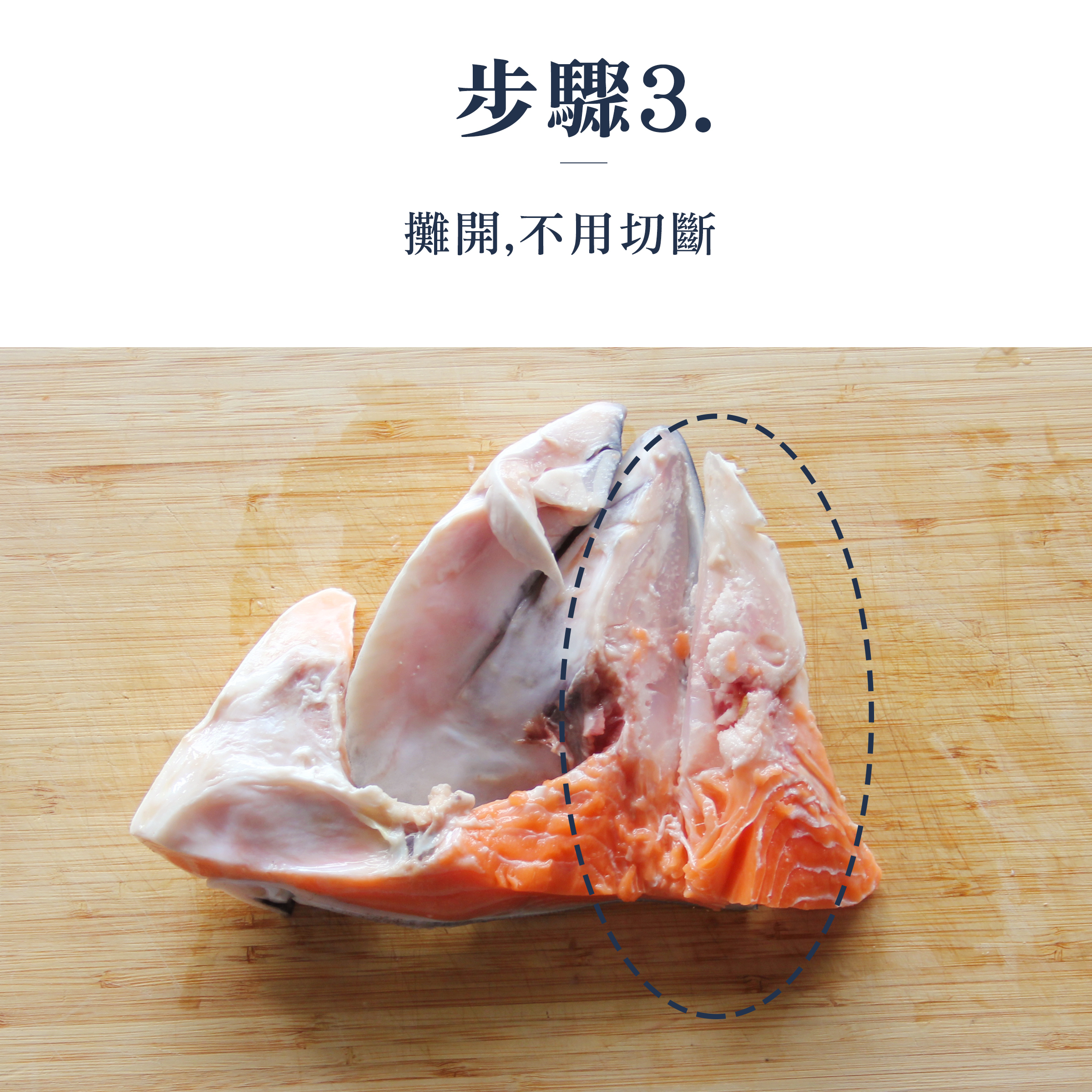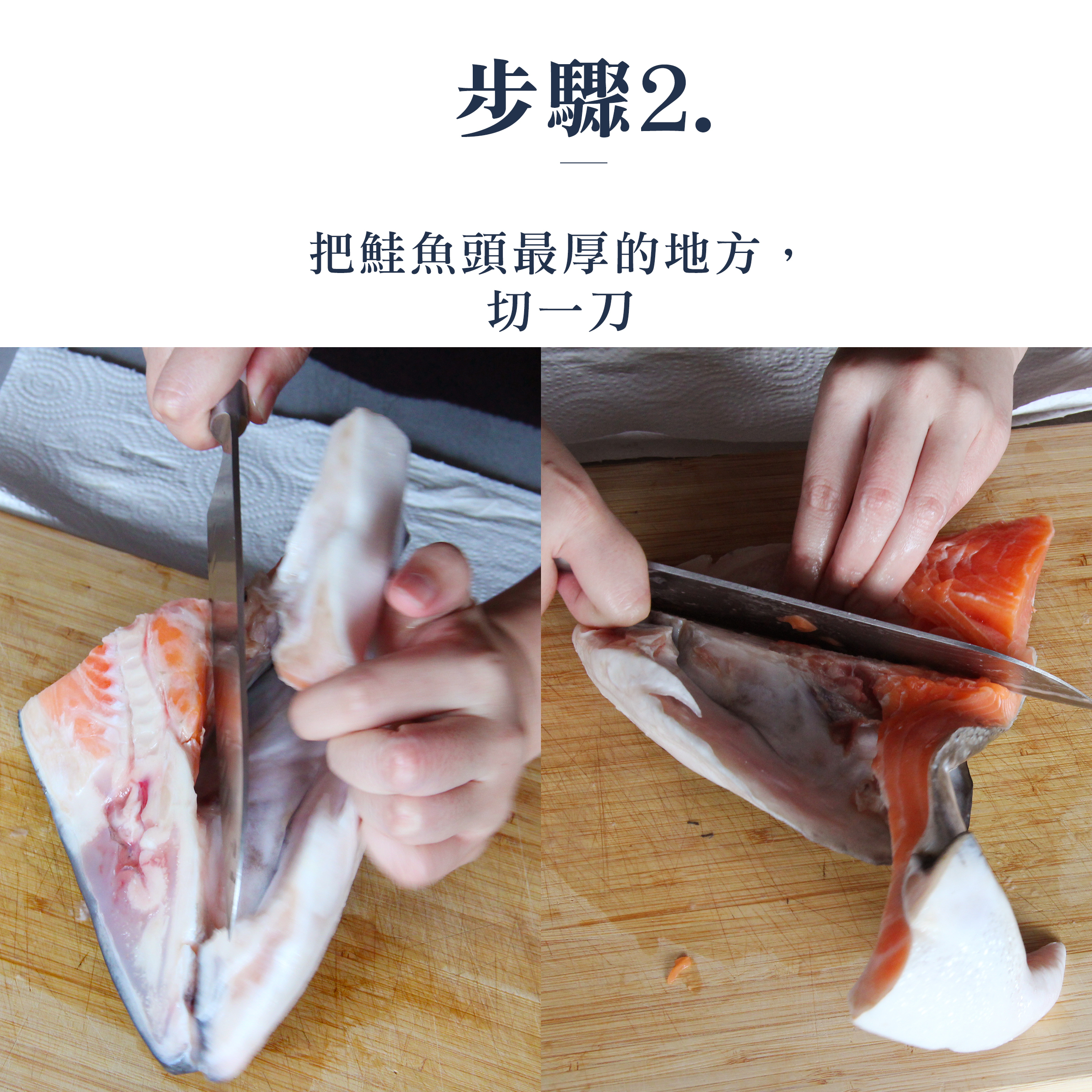步驟2.把鮭魚頭最厚的地方,切一刀,攤開