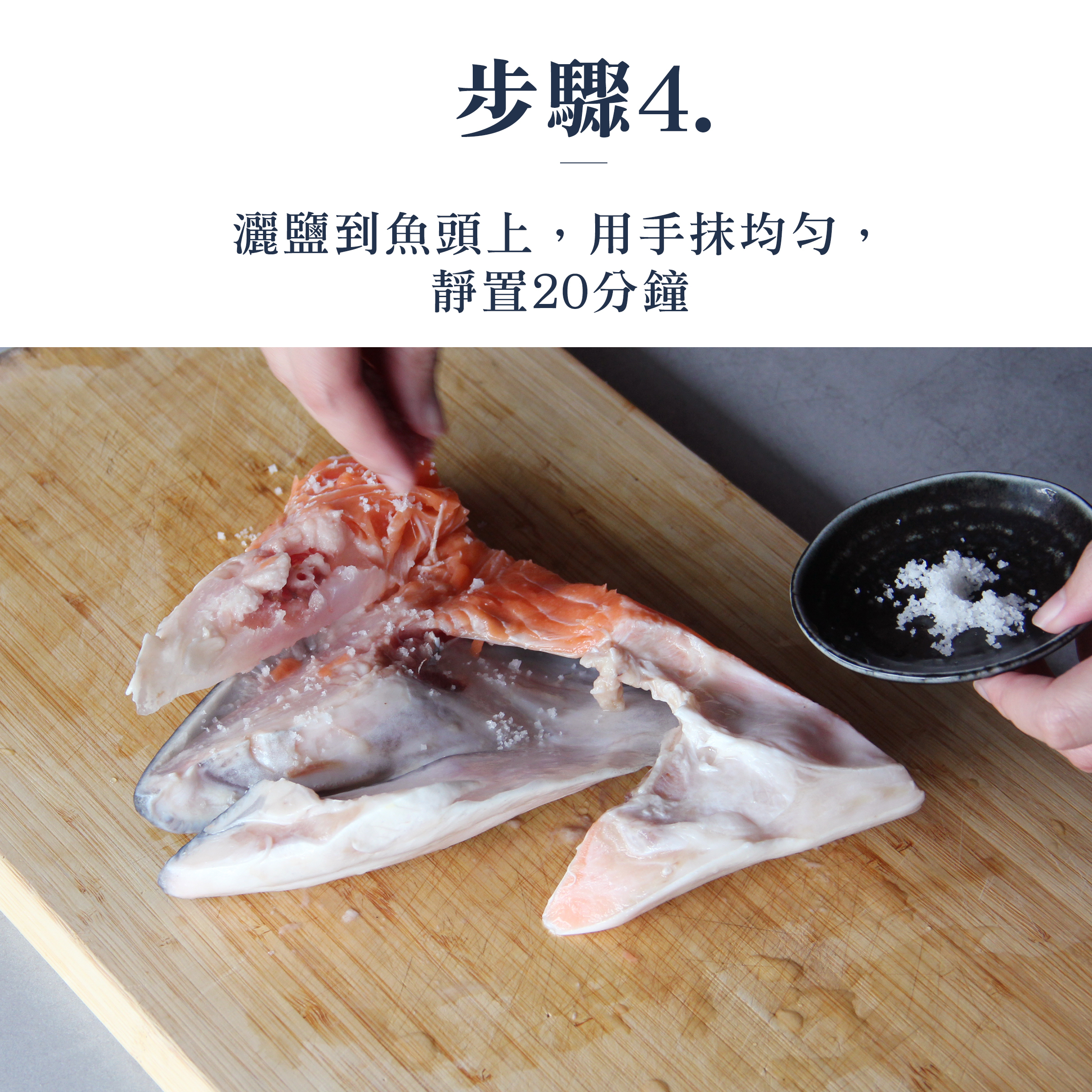 步驟3.灑鹽到魚頭上,用手抹均勻,靜置20分鐘