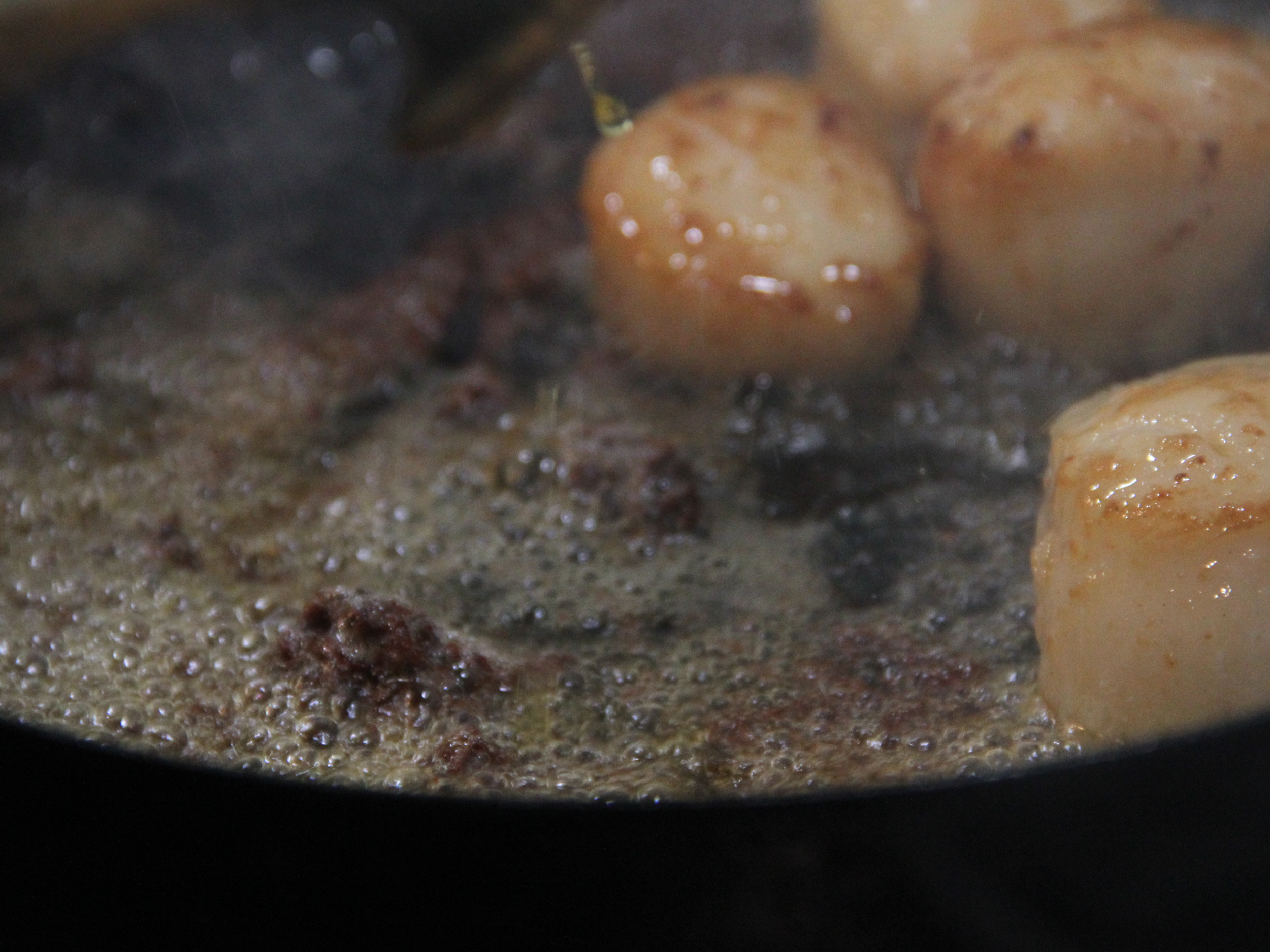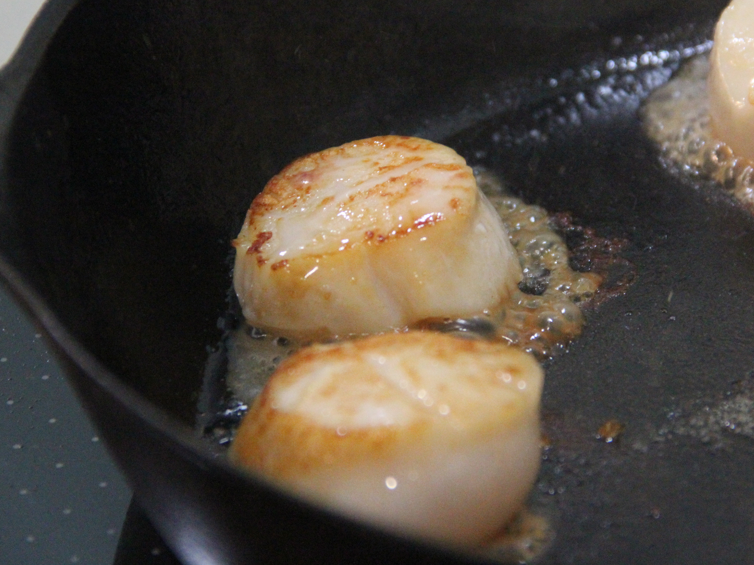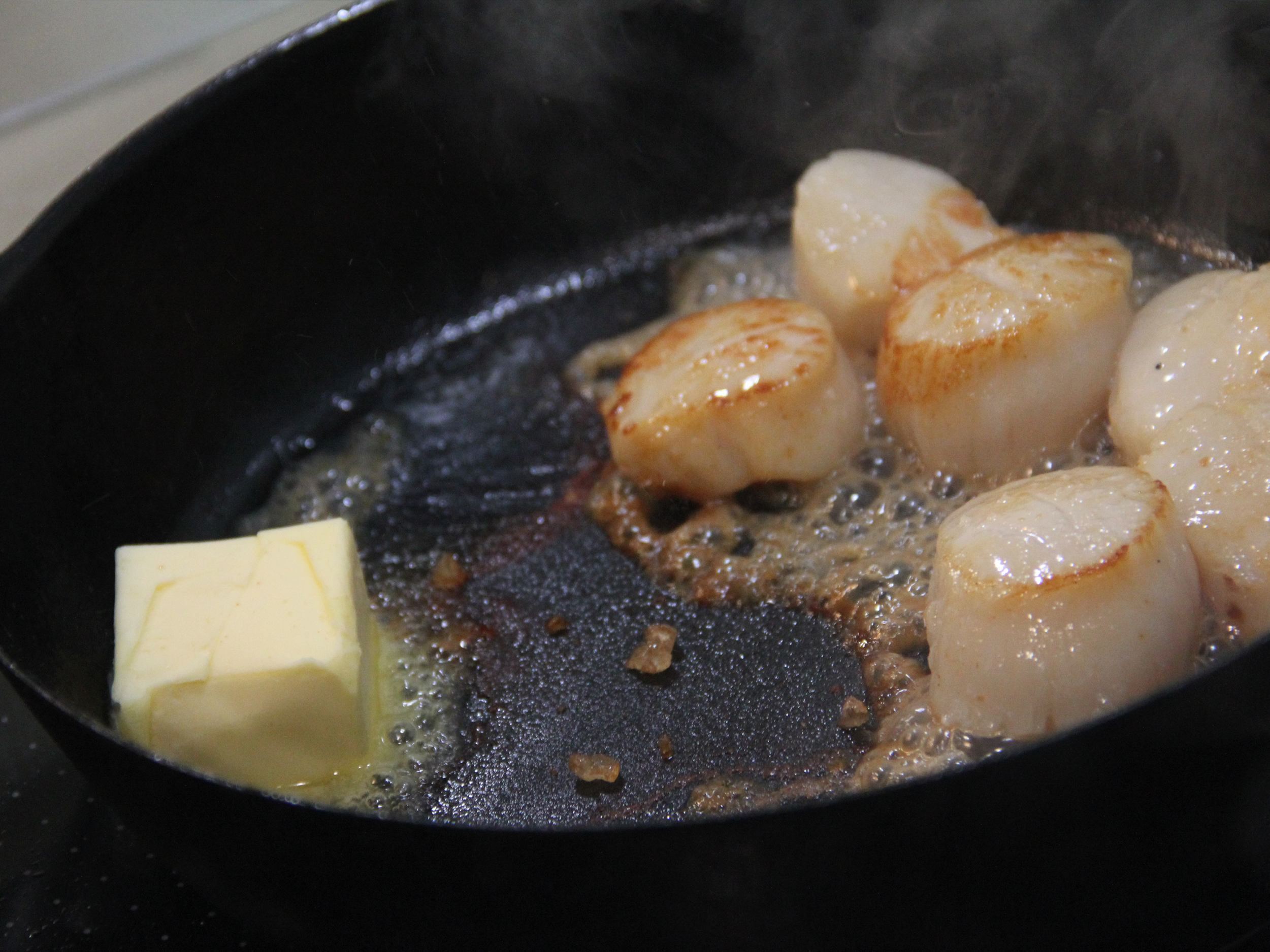 融化後,開始澆淋干貝,直到奶油焦糖化繼續淋上干貝,總共約30-45秒