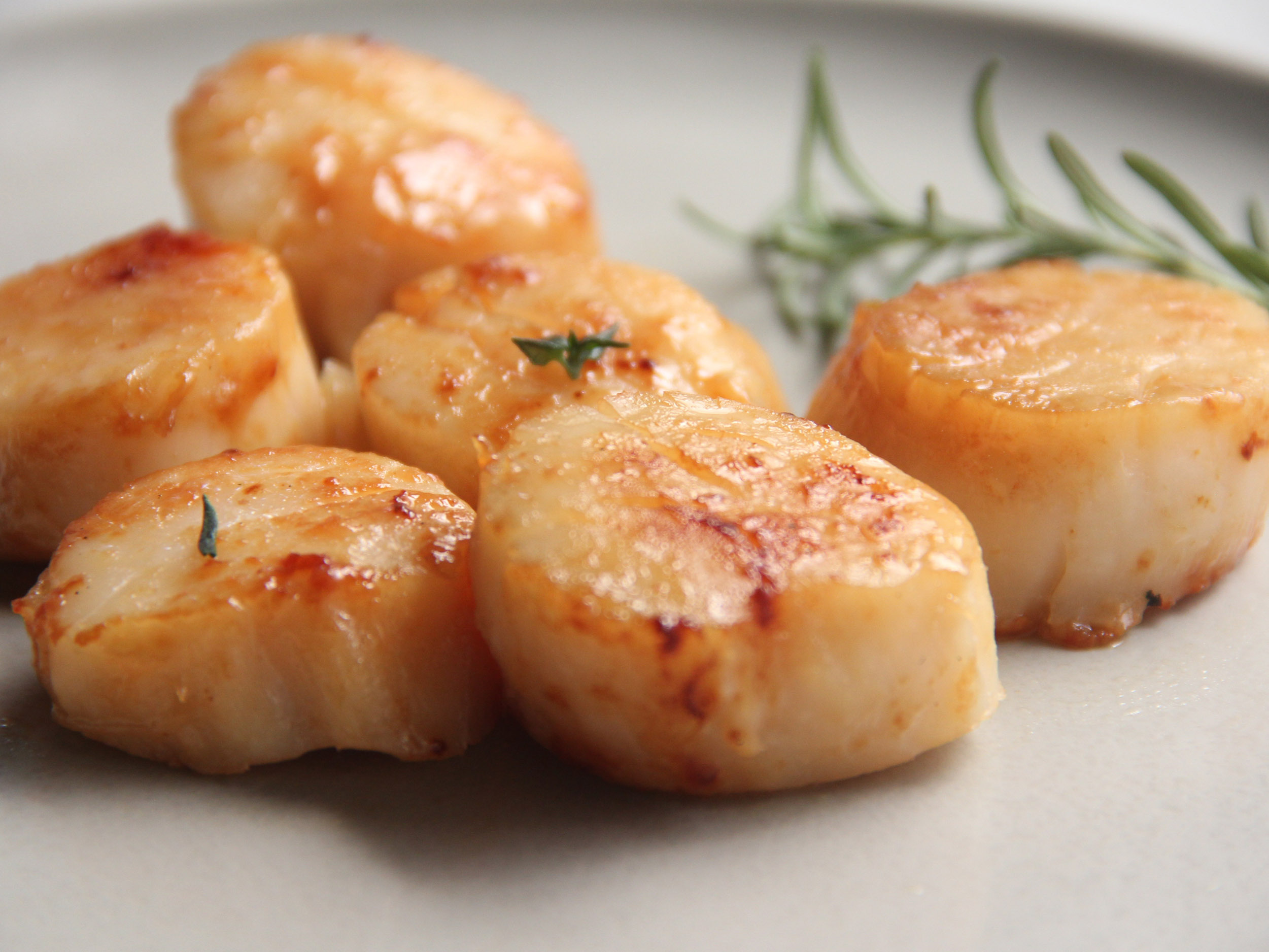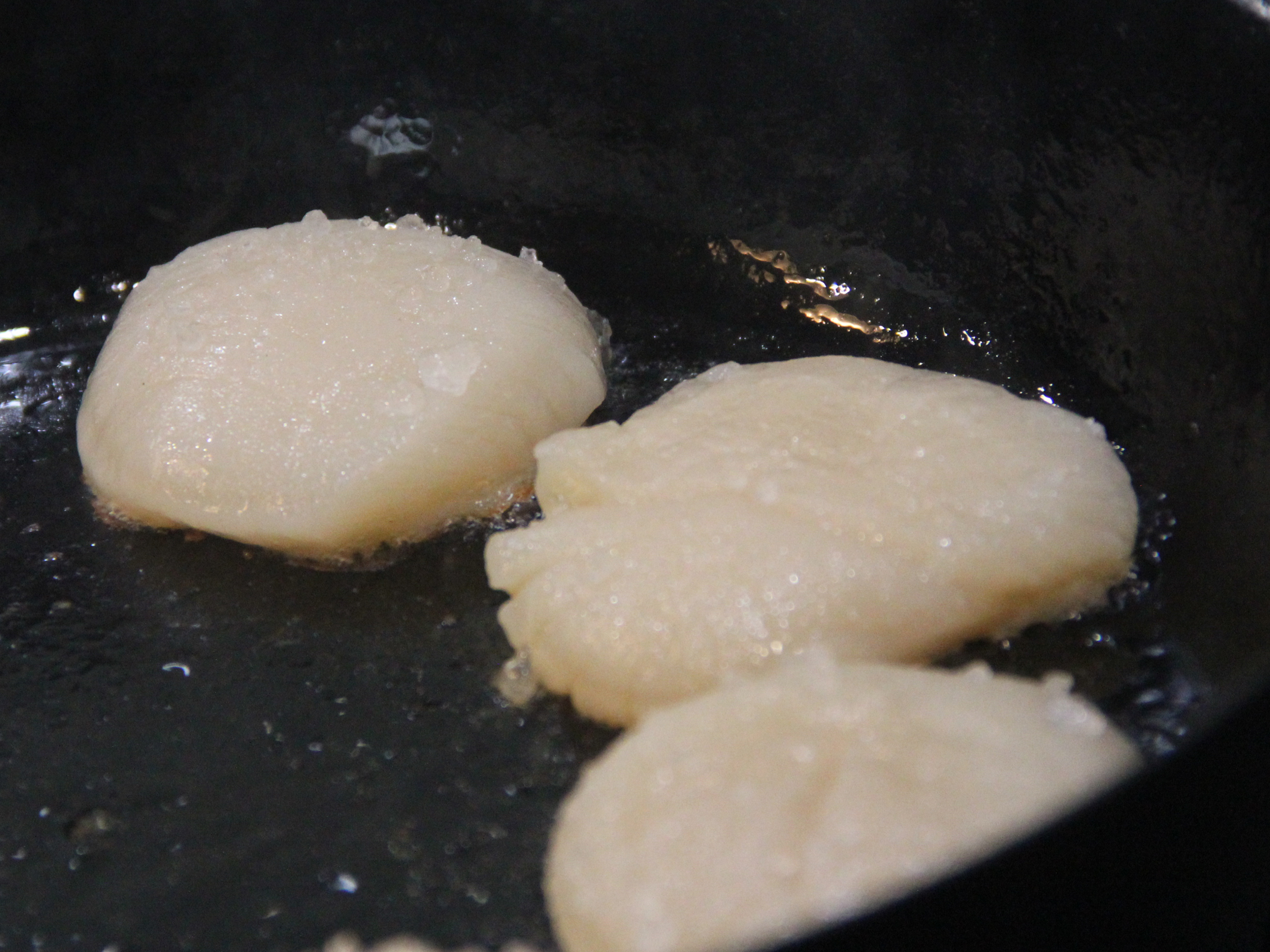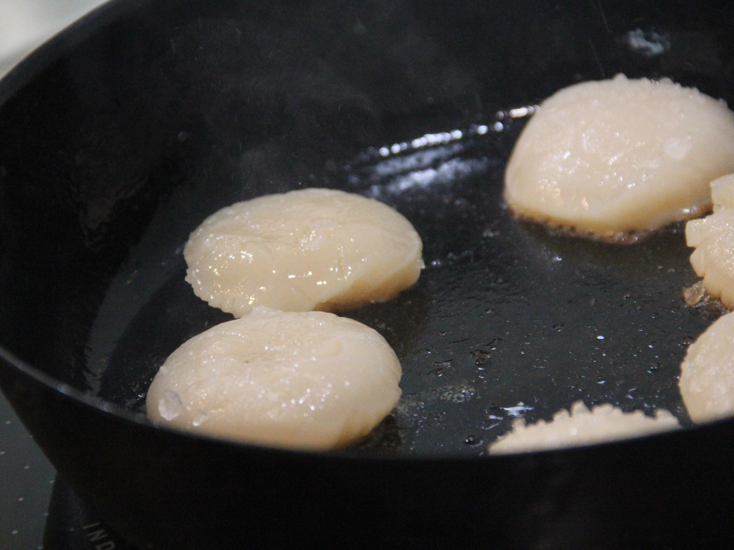 融化後,開始澆淋干貝,直到奶油焦糖化繼續淋上干貝,總共約30-45秒