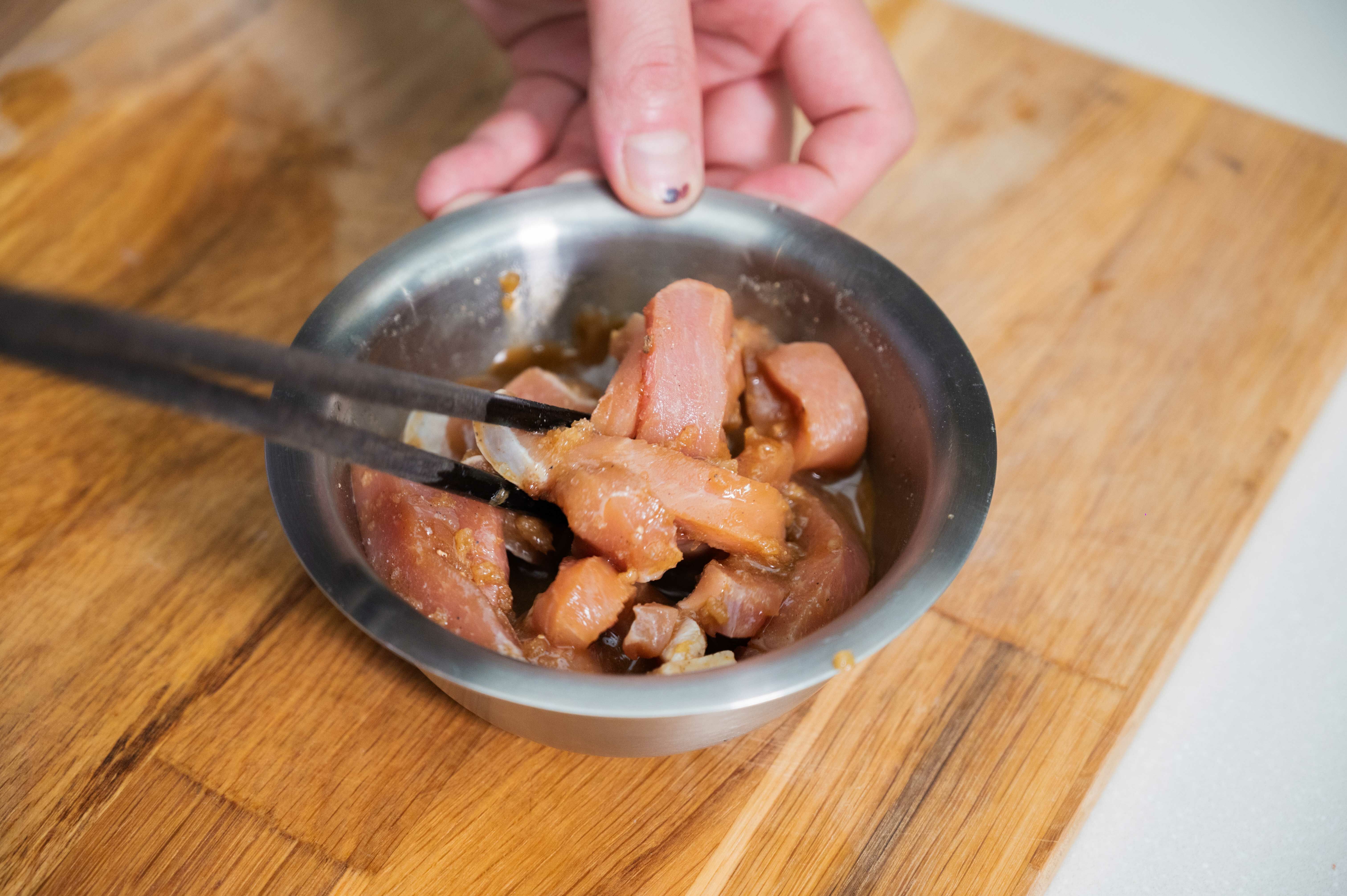 2.切條後放入盆中,將醃料米酒、醬油、烏醋、蒜泥、白胡椒、砂糖依序混合倒入與肉條拌勻