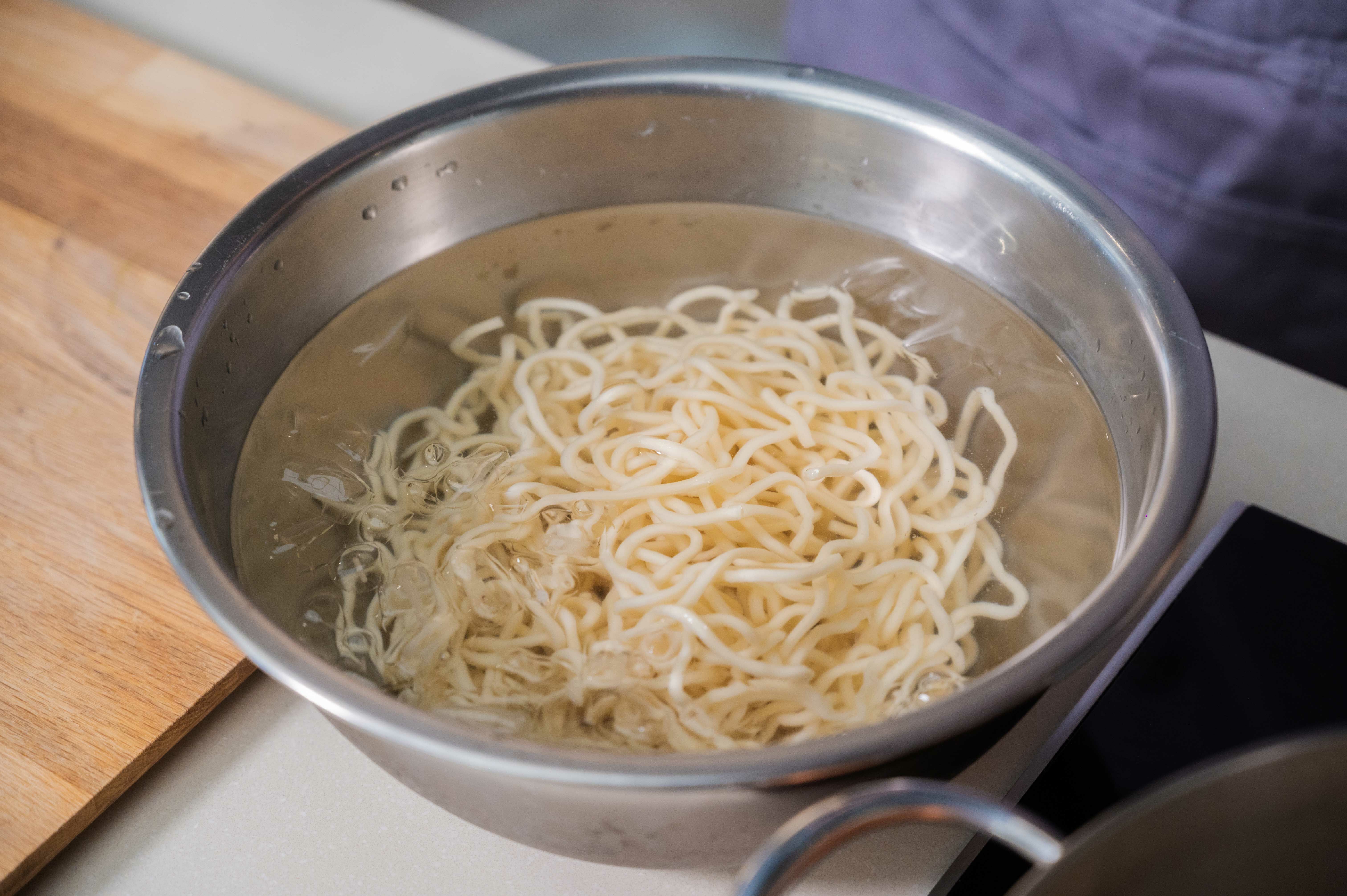 3.將水煮滾後,下麵條,點水兩次後,撈起麵條泡入冰塊水