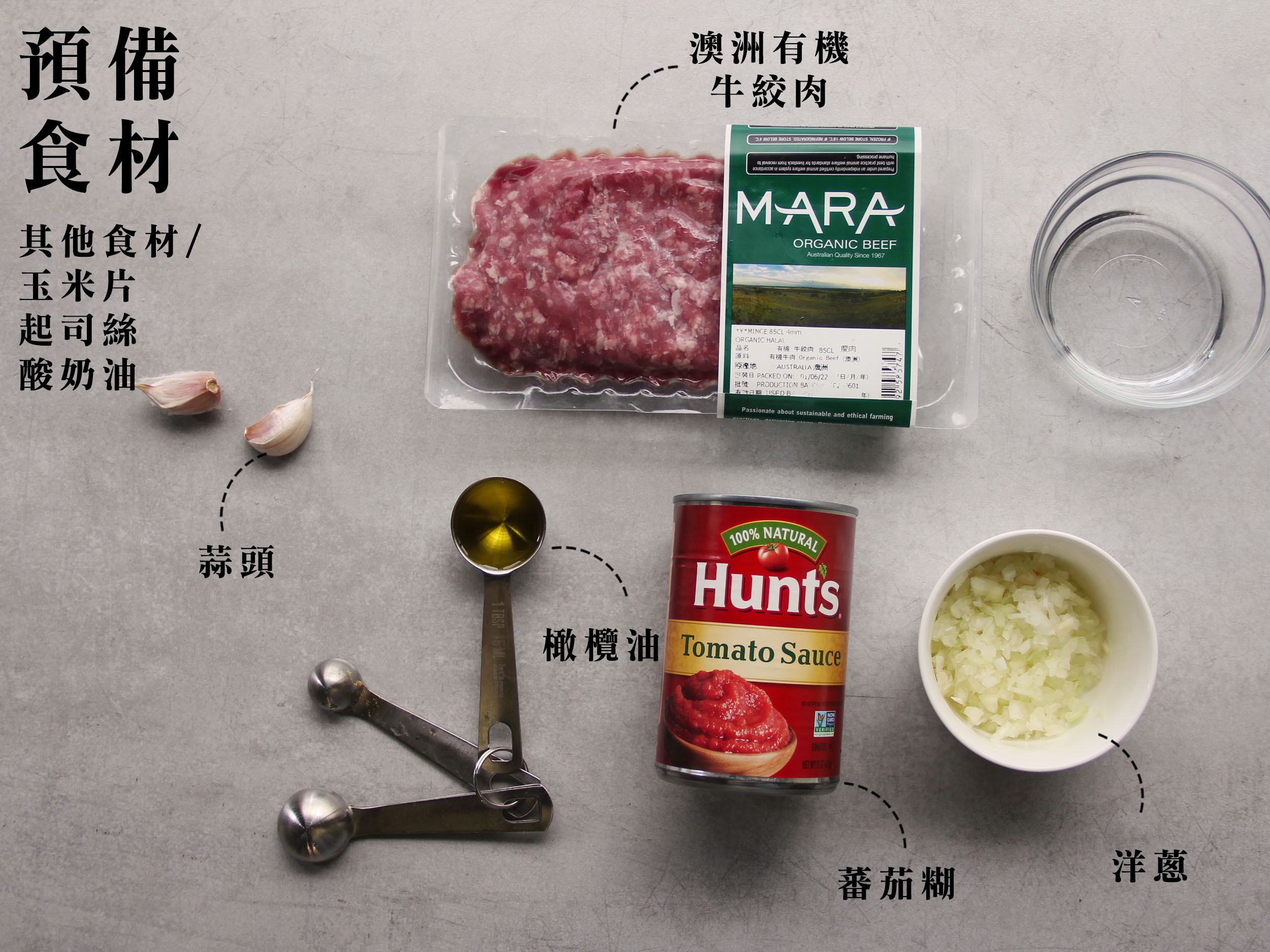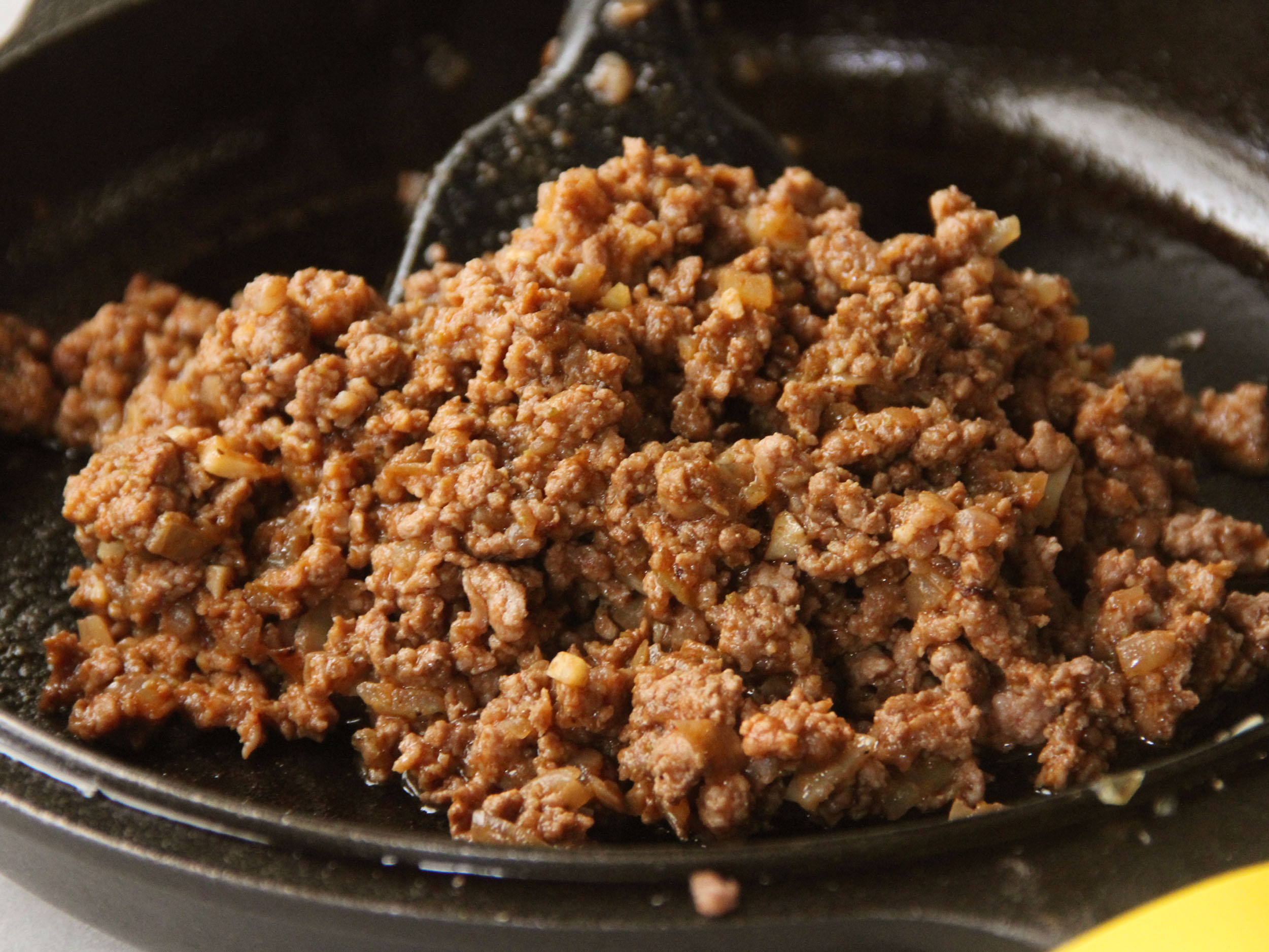 在煎鍋中用高溫加熱油。加入大蒜和洋蔥,煮至半透明。加入牛肉並煮熟,邊走邊打碎。牛肉煮熟後,加入B)、番茄糊和水。再煮 2 分鐘,然後放在一邊。