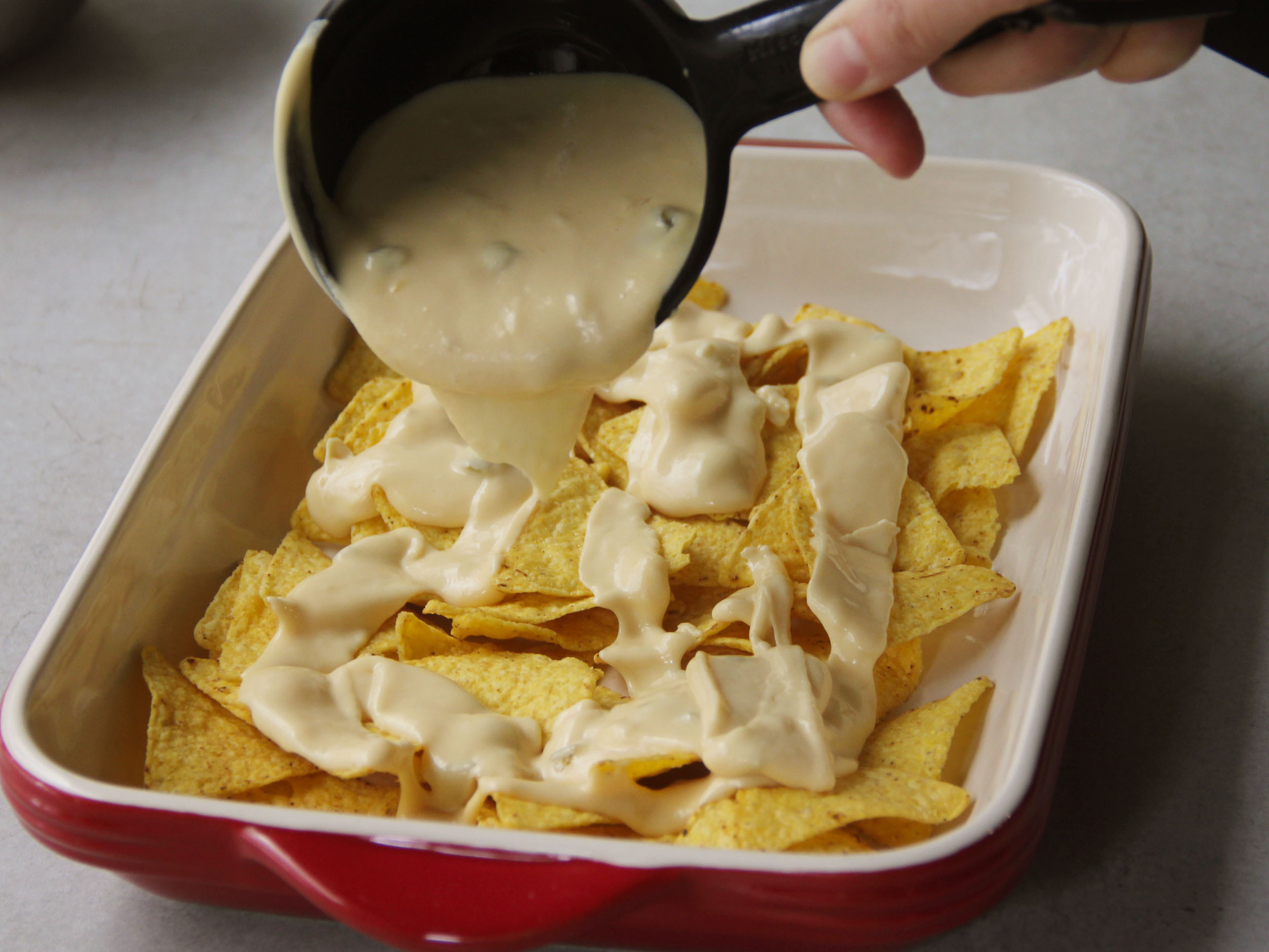 Step 2.將一半的玉米片單層鋪在烤盤上,淋上大約一杯起司醬