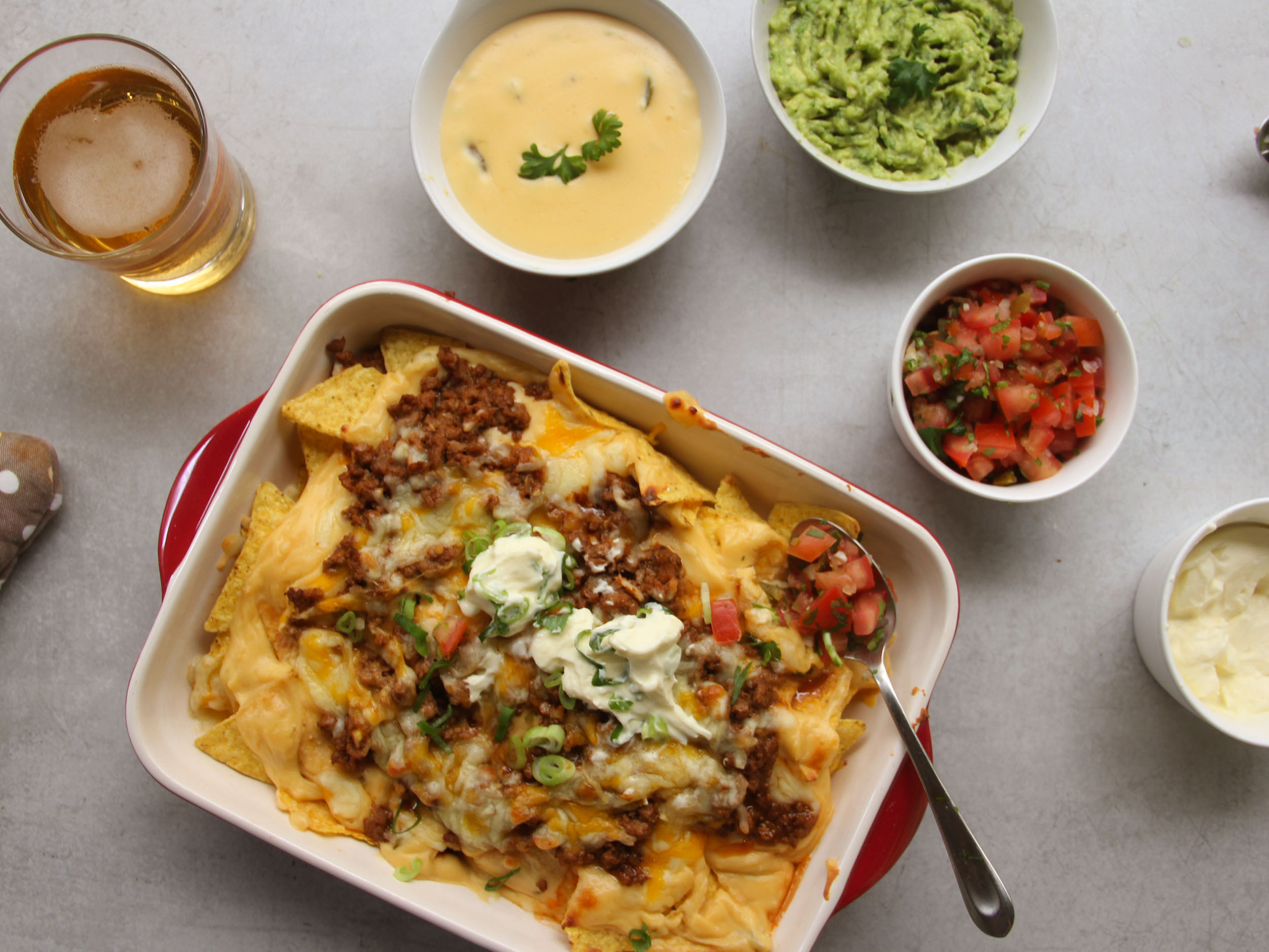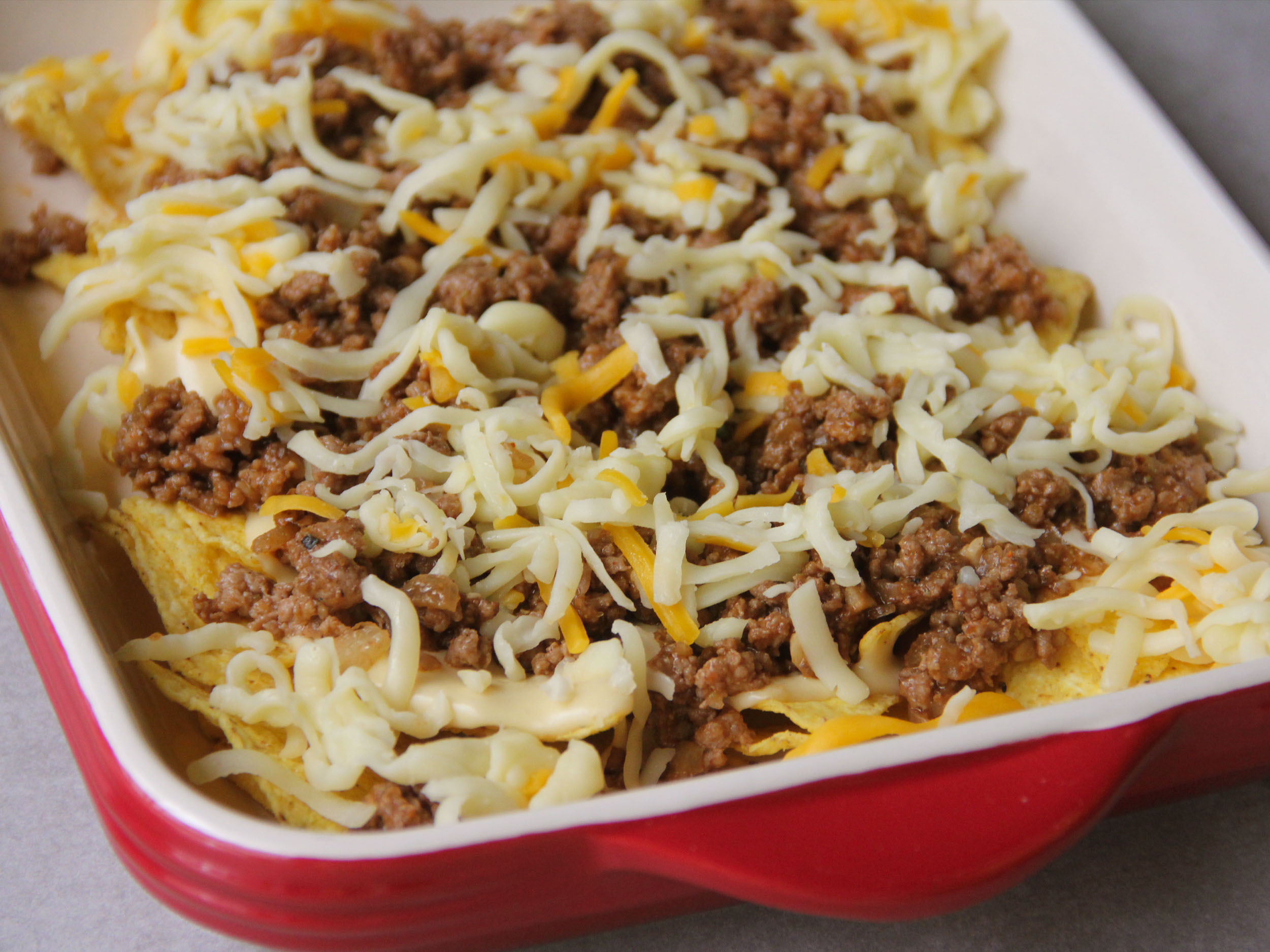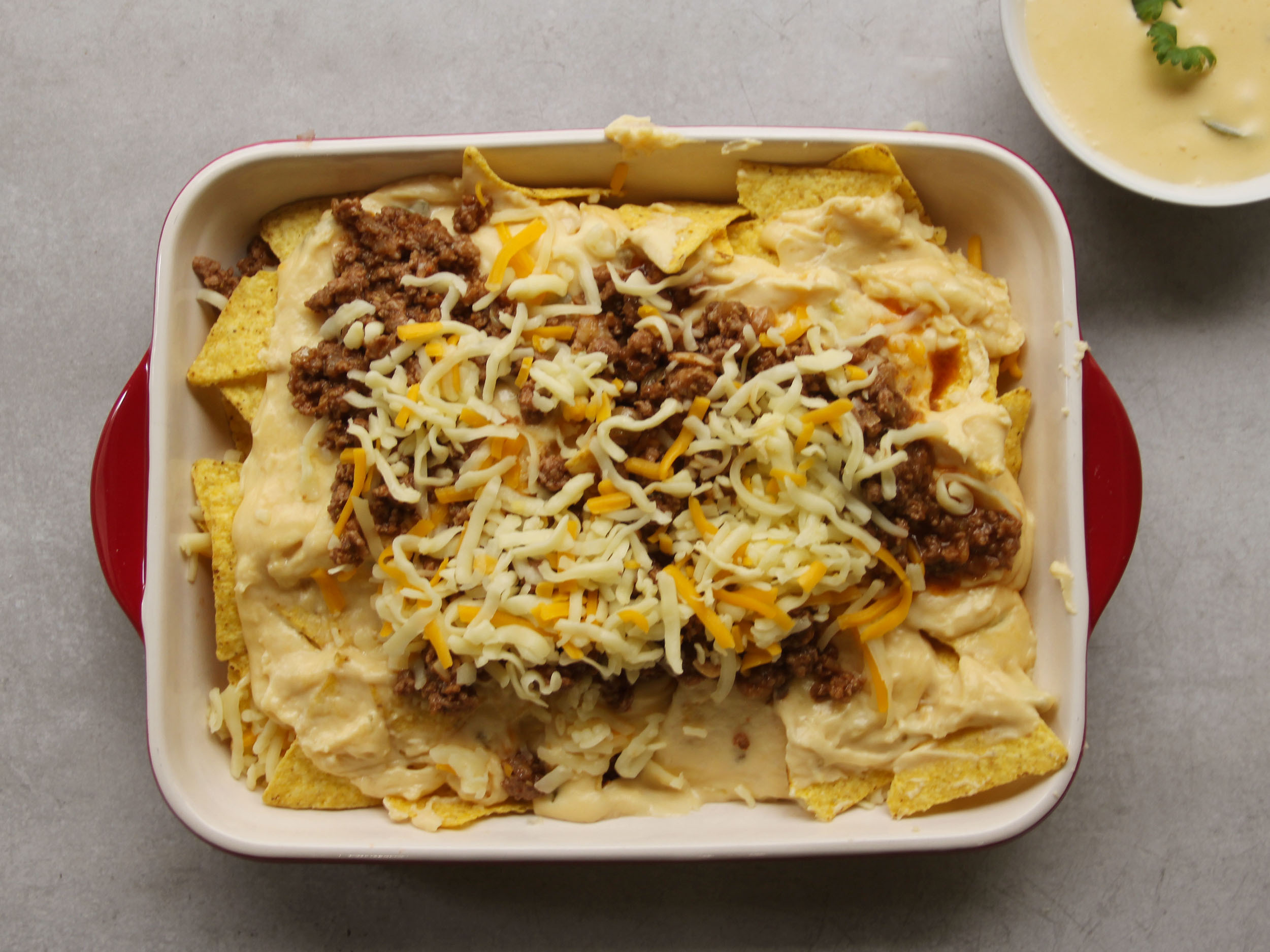 Step 4.撒上剩餘的玉米片,再次淋上起司醬、牛肉,起司絲。確保起司醬覆蓋所有的玉米片上