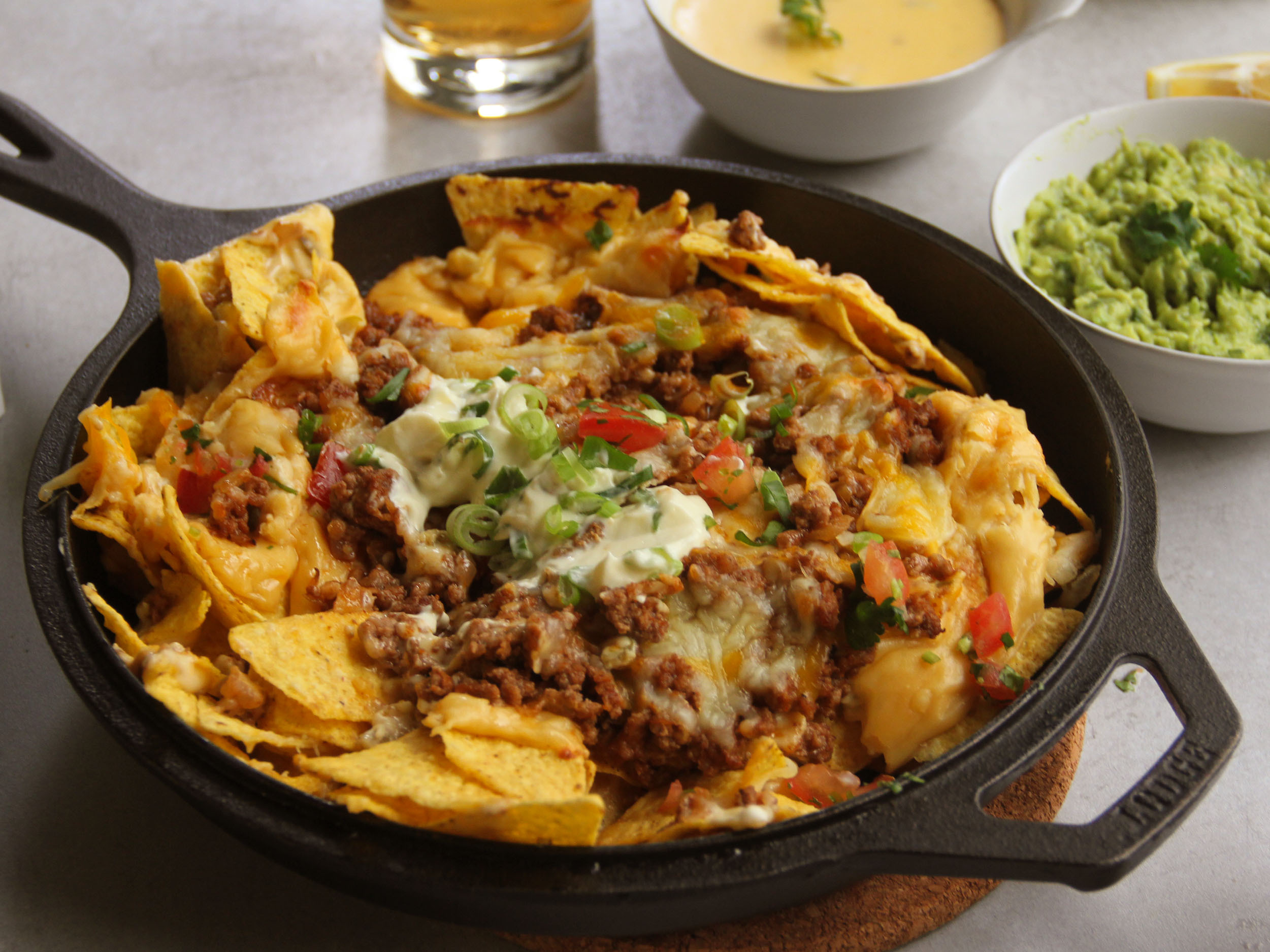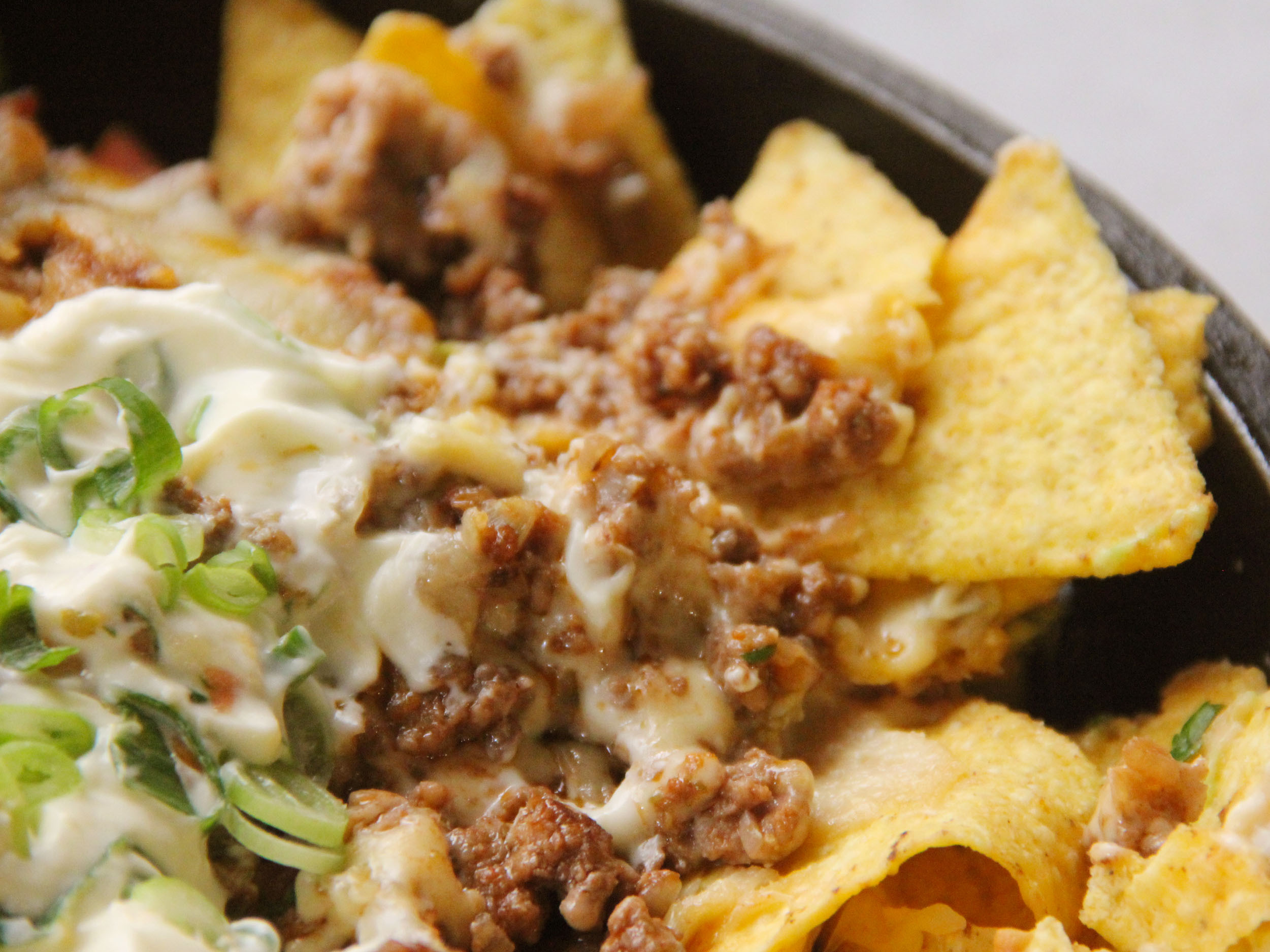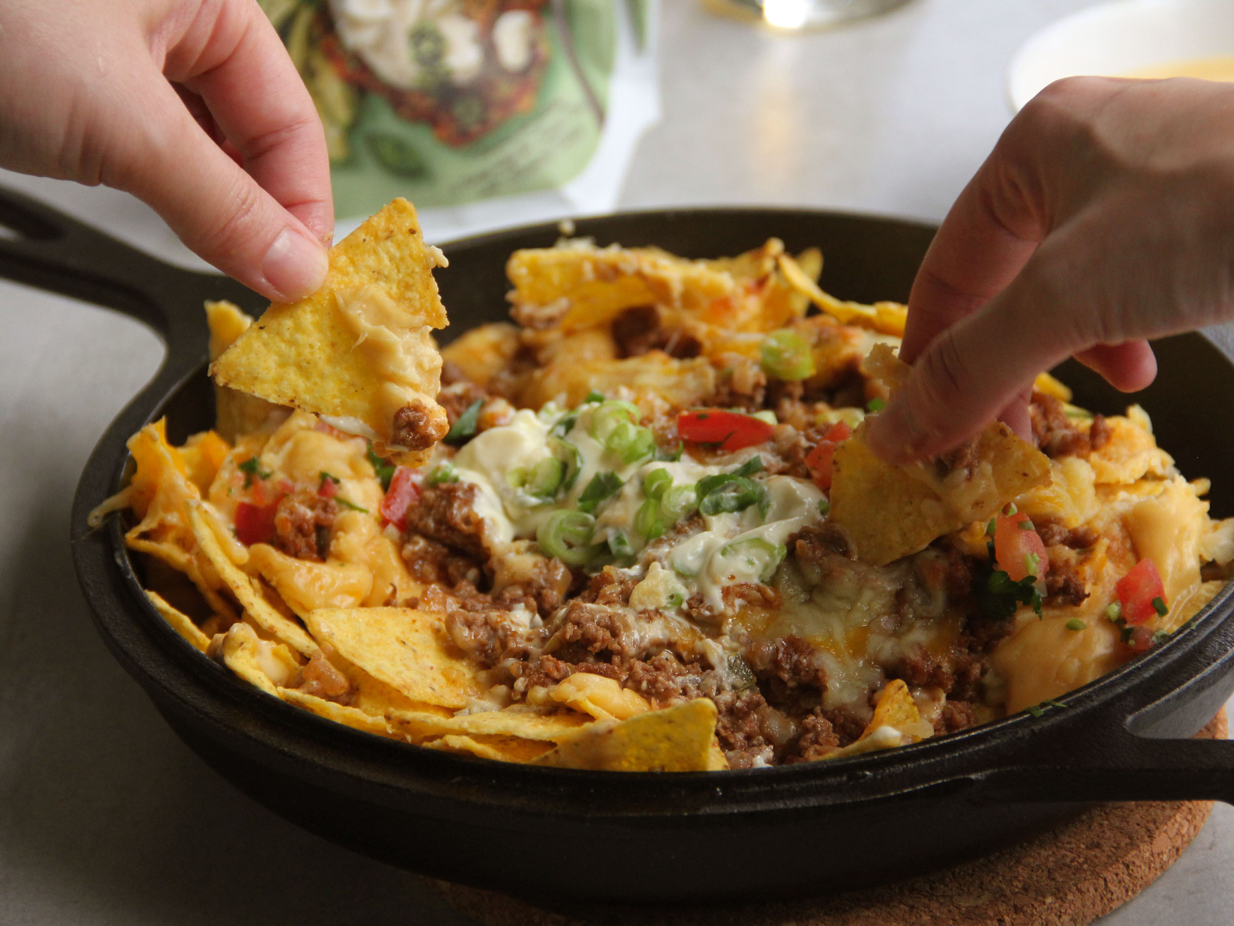 Step 4.撒上剩餘的玉米片,再次淋上起司醬、牛肉,起司絲。確保起司醬覆蓋所有的玉米片上
