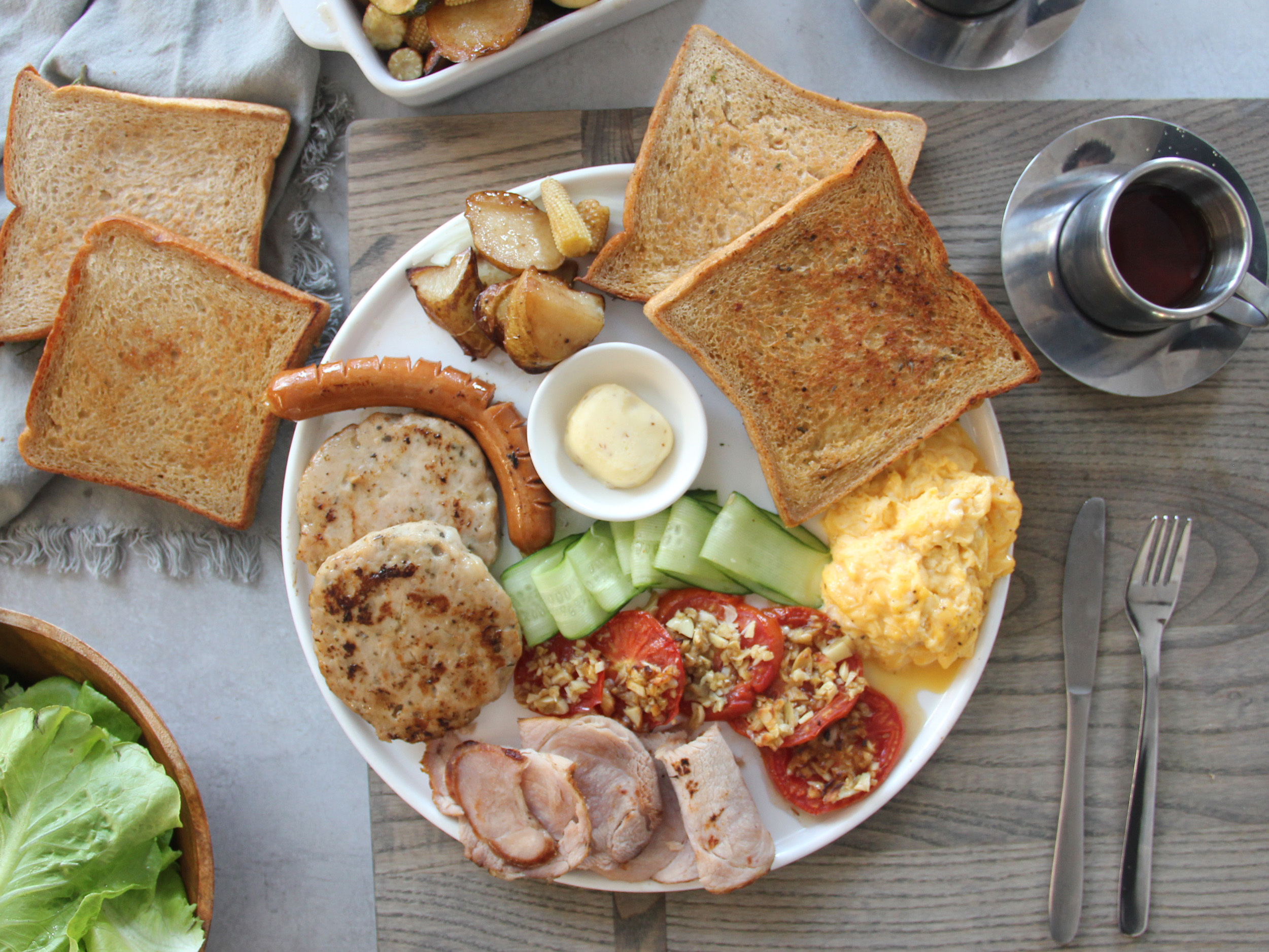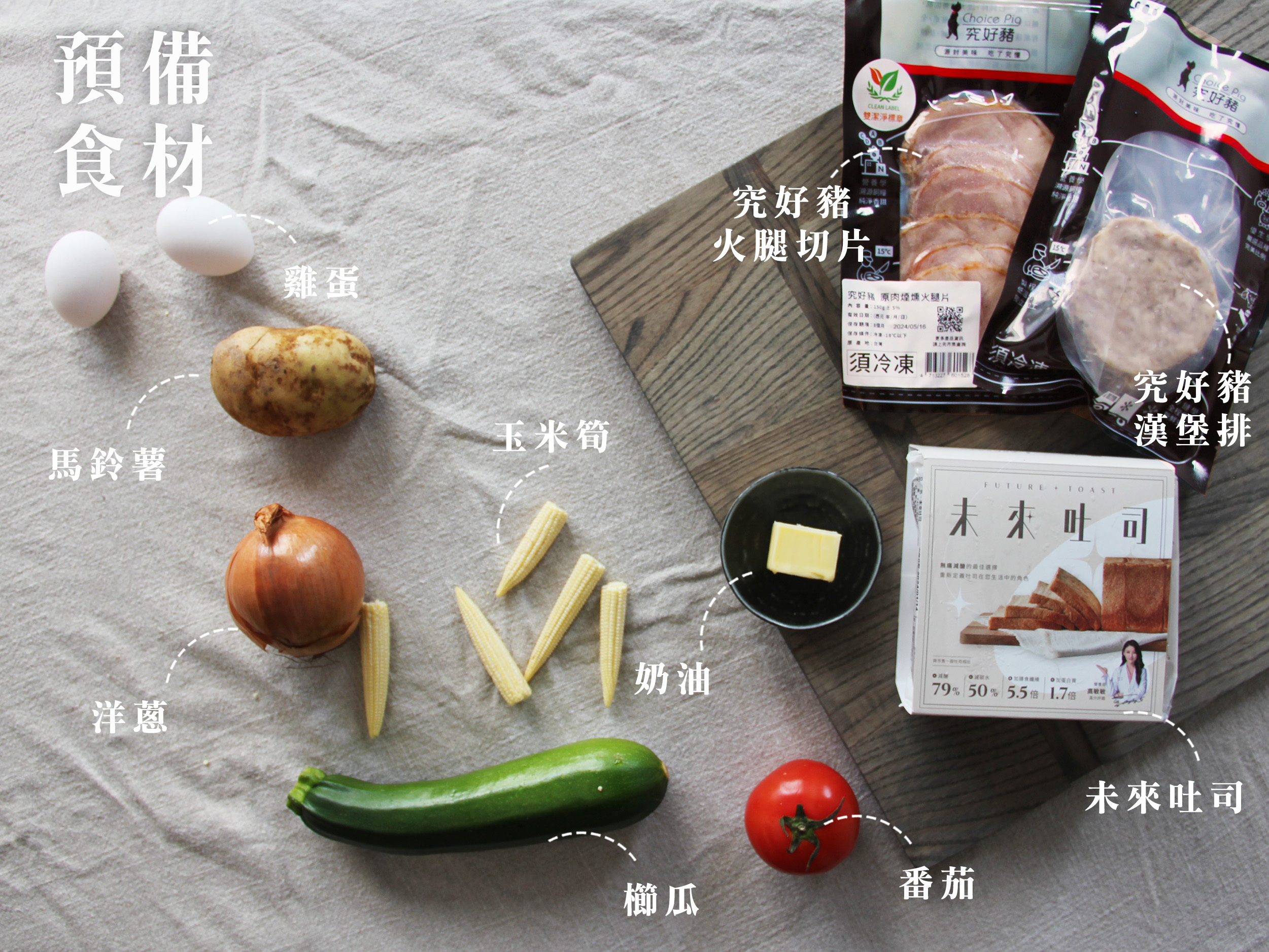 Step 6:將炒蛋、吐司、漢堡排、火腿片、烤蔬菜依喜好擺放至盤中即完成。