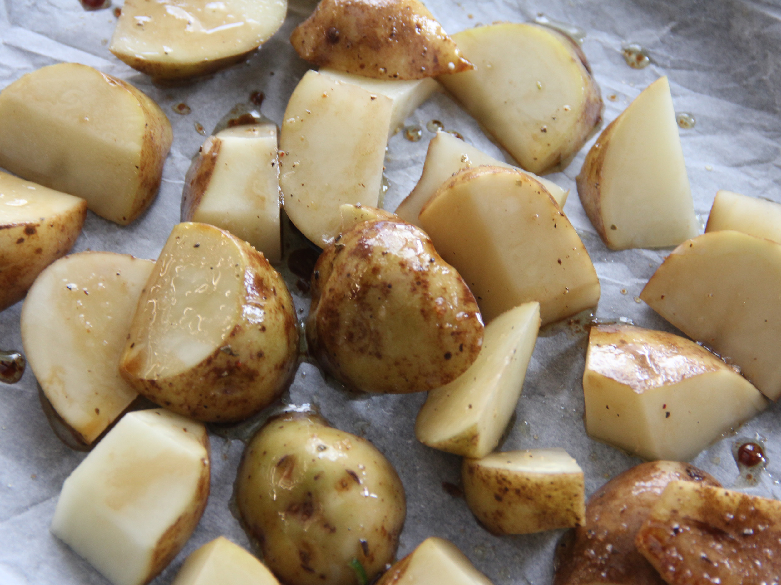 Step 2: 在烤盤鋪上烘焙紙,先放入馬鈴薯至烤箱10~15分鐘左右