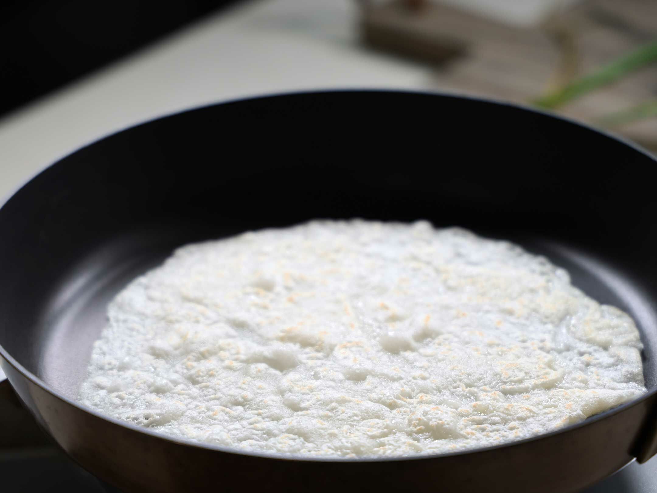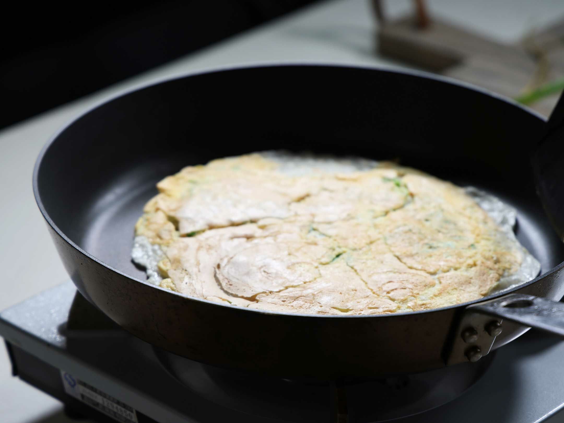 2.鍋子溫度不能太熱,放少許油,將調好的粉漿倒入鍋中,不要移動粉漿,以小火煎到外緣略有金黃變硬的程度再翻面煎。可以依照個人喜好程度煎,煎越久會越酥脆,但要注意火侯不要焦掉唷! 煎好的粉漿蛋餅皮先起鍋,放在盤子中備用