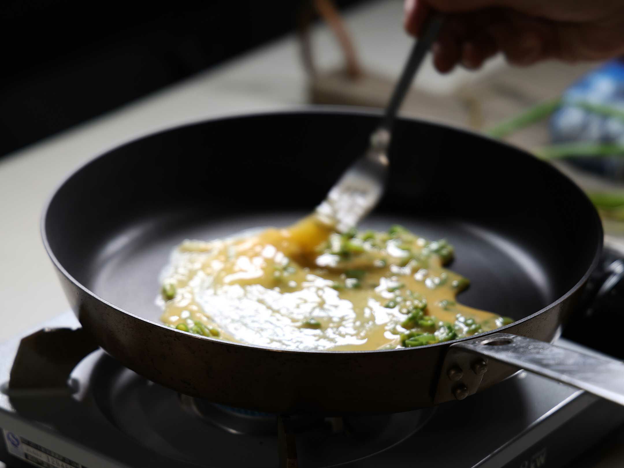 3. 熱油鍋放少許油,將蛋和蔥花打散倒入鍋中