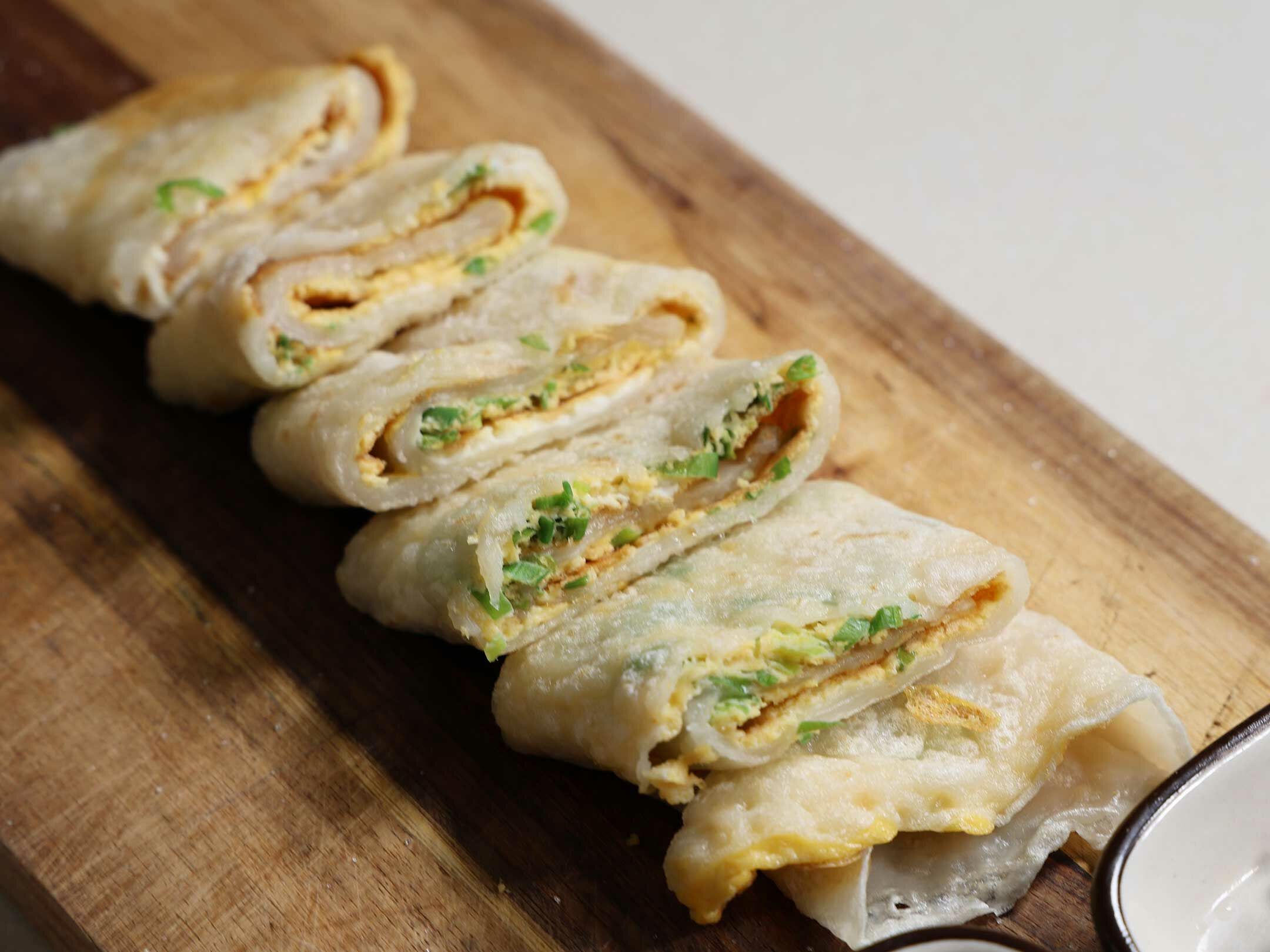 5.將蛋餅捲起後即可切片裝盤,加上自已喜歡沾的醬,這樣就完成了!