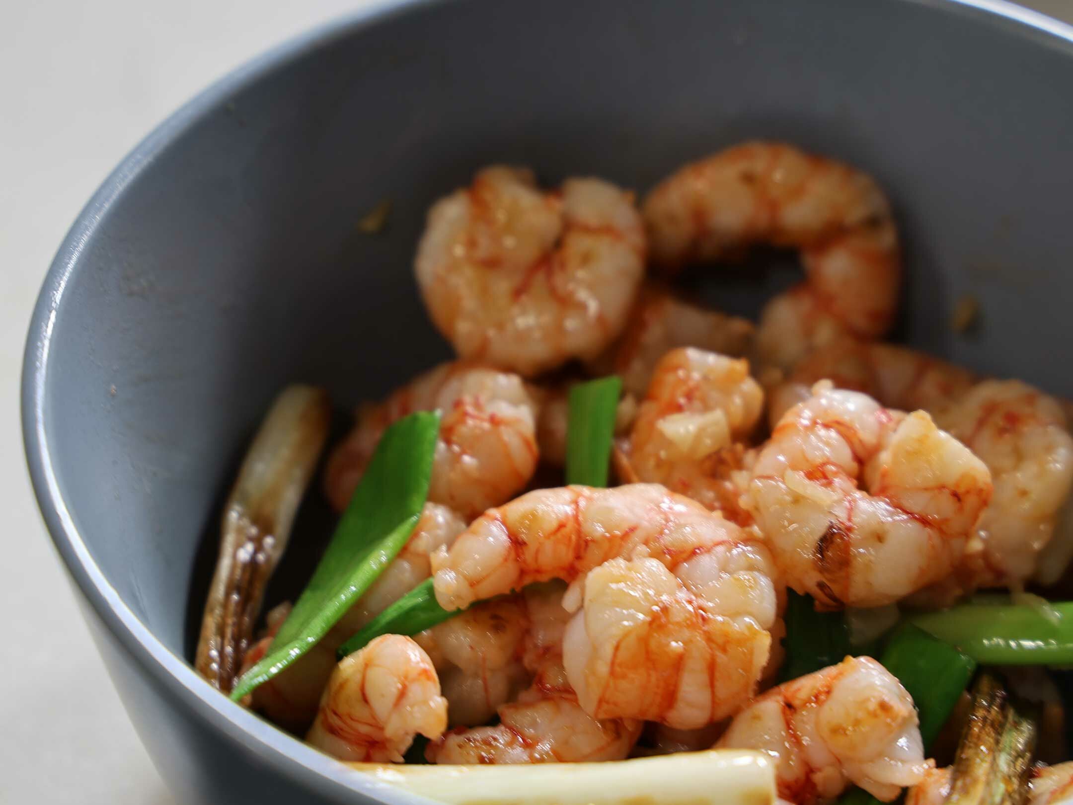 2. 平底鍋熱油,加入蔥白煎至金黃香氣釋出。 放入胭脂蝦仁,快速翻炒至變色。