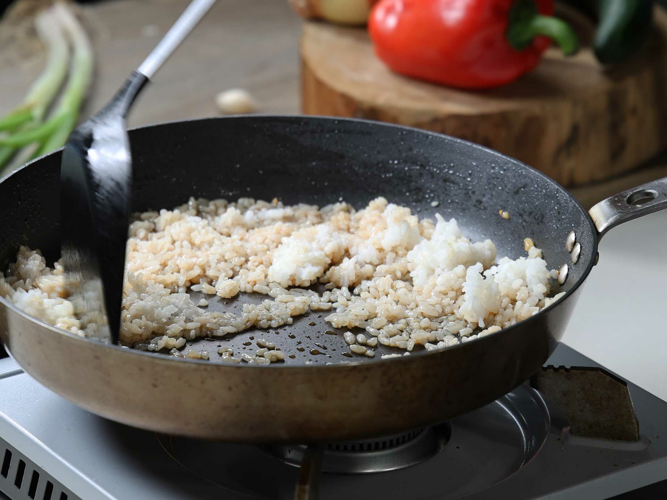 4.原鍋倒入米酒和醬油,再加入糖調味,拌炒均勻,加入少許胡椒和鹽調味,隨後加入少許水煮開。 將白飯倒入鍋中,與醬汁混合拌炒至每粒飯均吸收醬汁,收汁至飯粒飽滿晶亮。