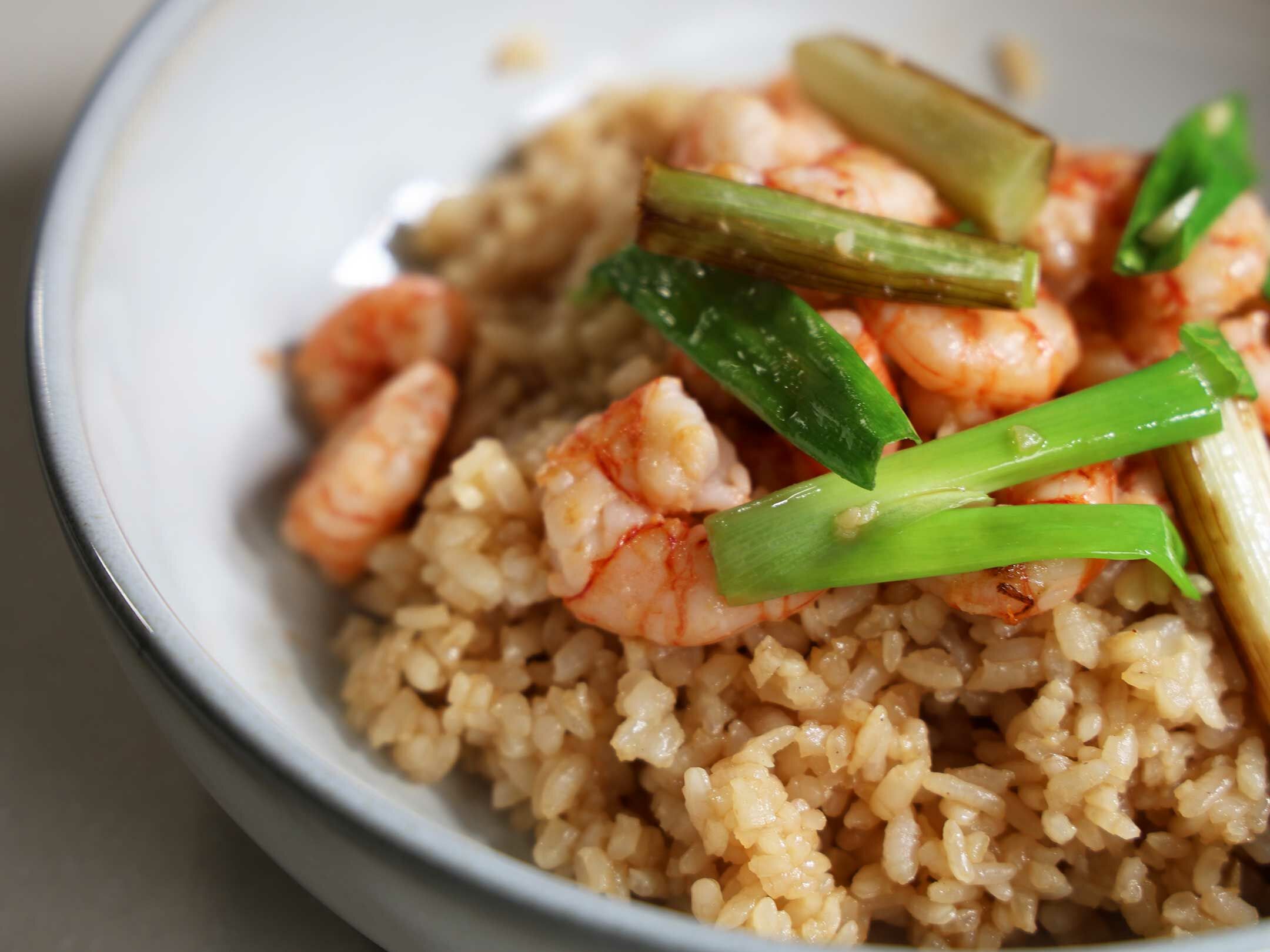 5.飯盛盤後鋪上炒好的胭脂蝦仁與蔥段,一道香氣撲鼻的胭脂蝦香蔥飯就完成了!