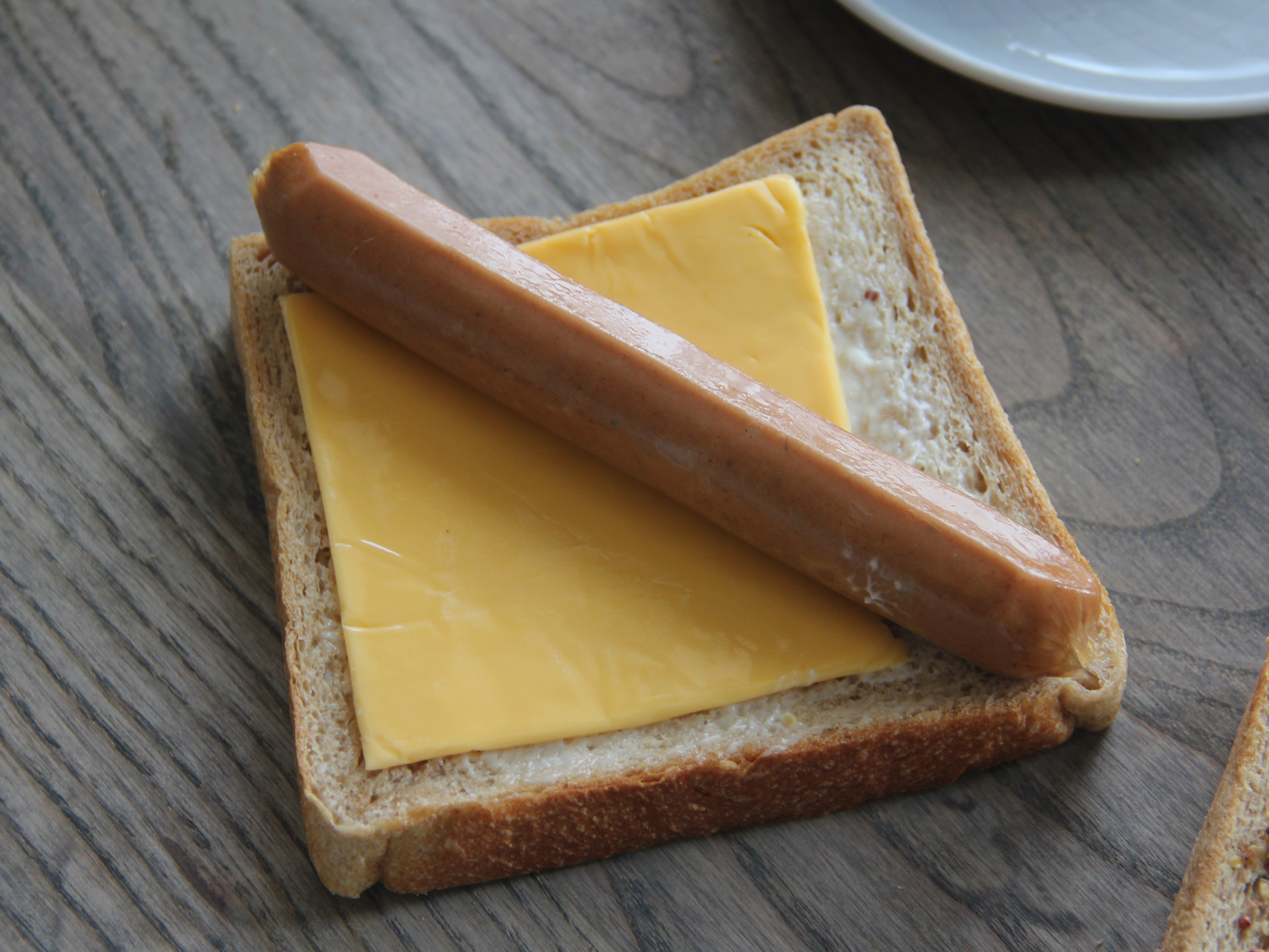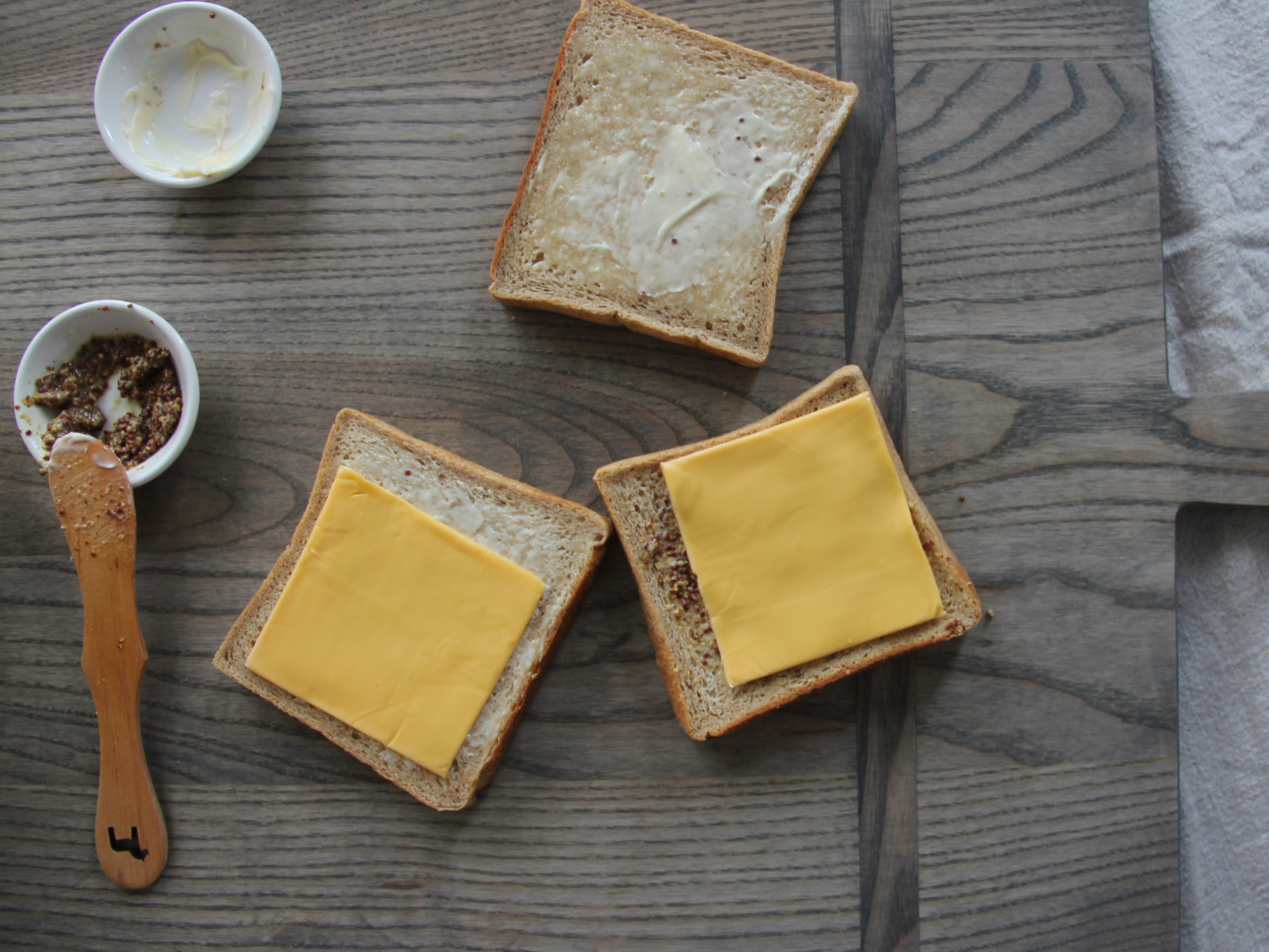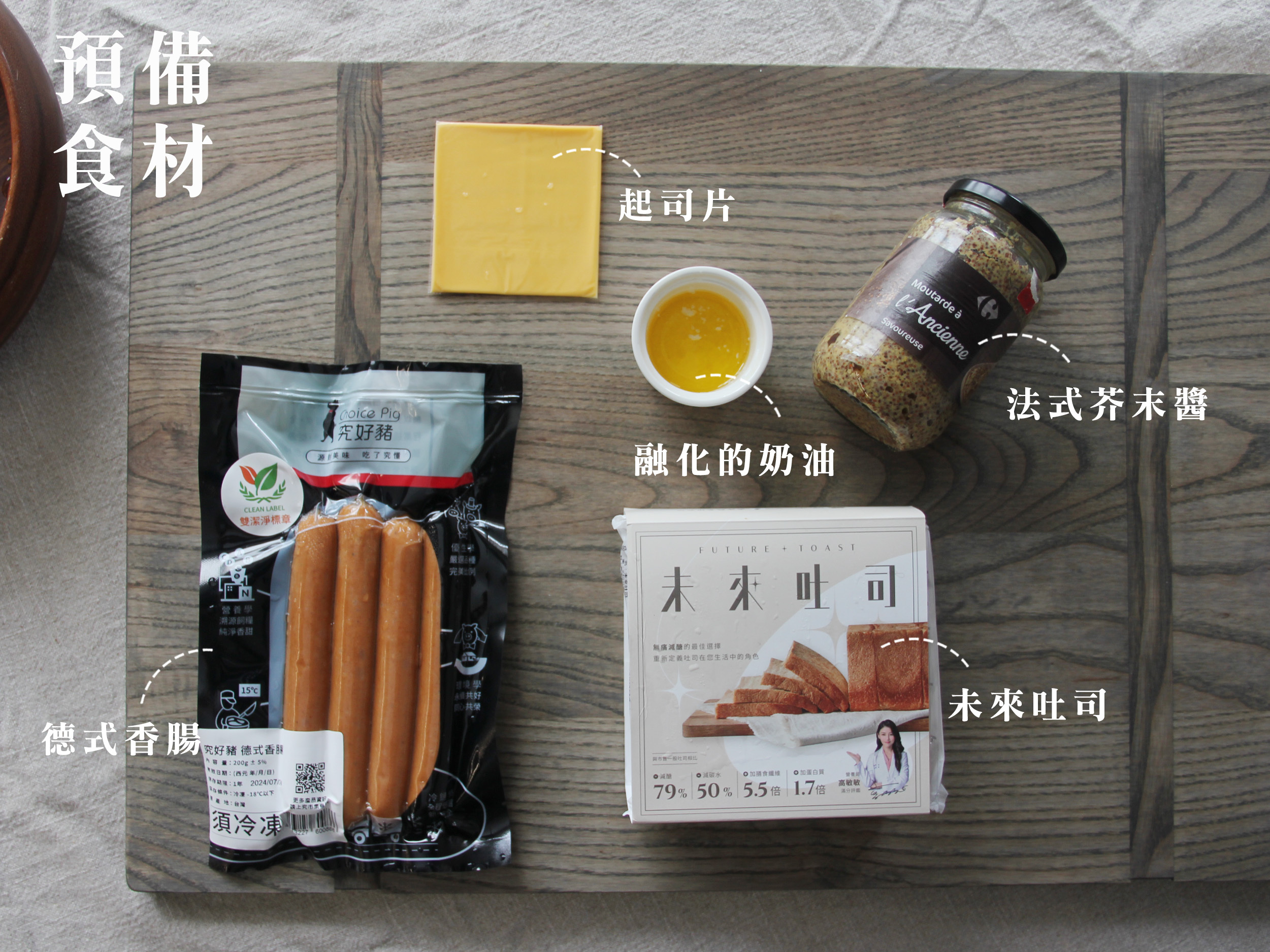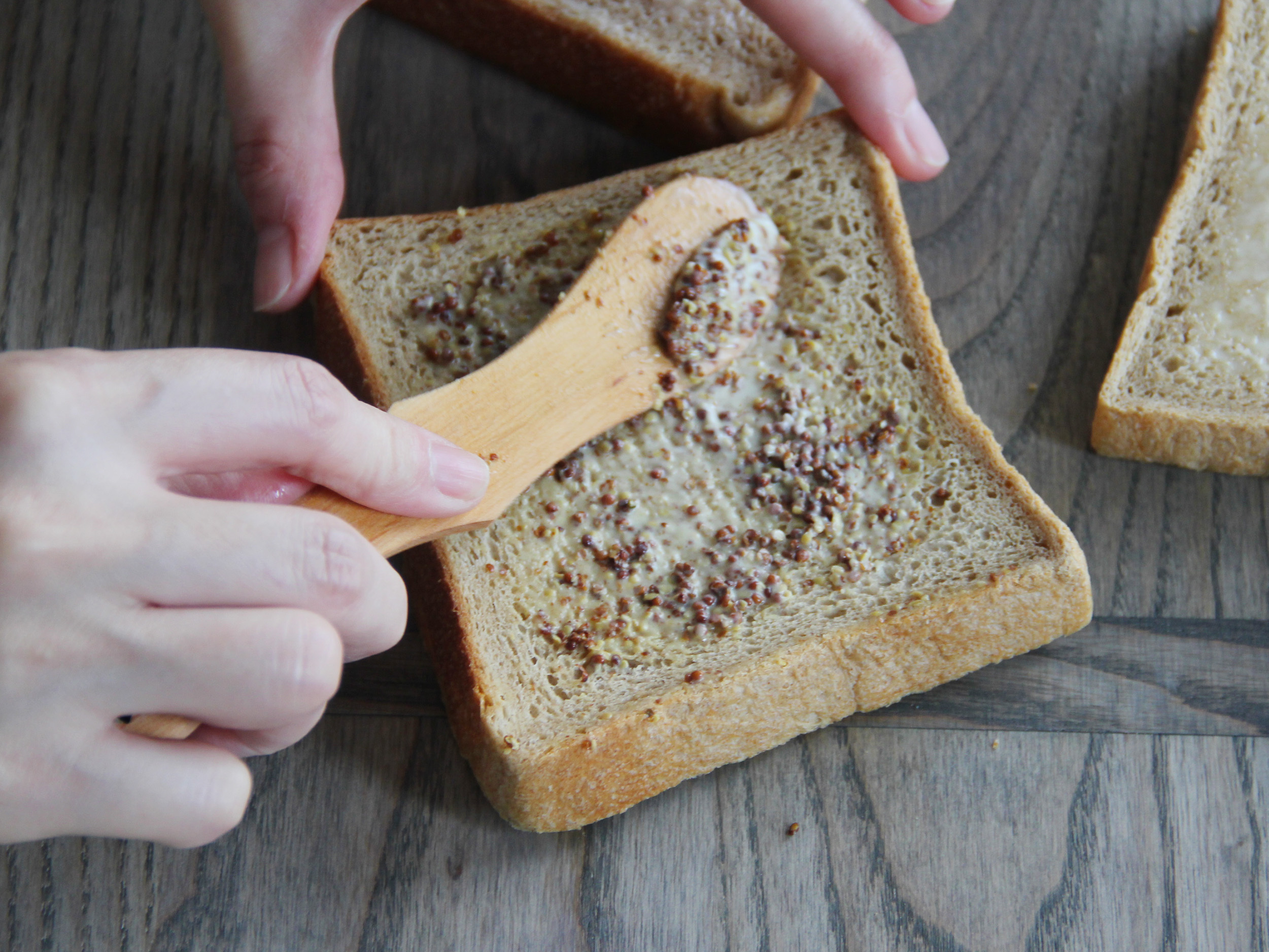依照未來吐司的食用方式加熱吐司,再塗上法式芥末醬(或美乃滋)