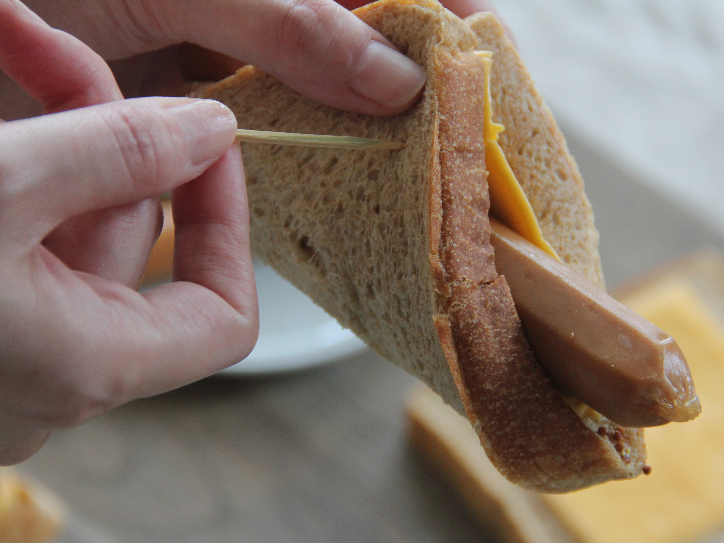 Step 4:再用牙籤固定成三角形,外層塗上融化的奶油