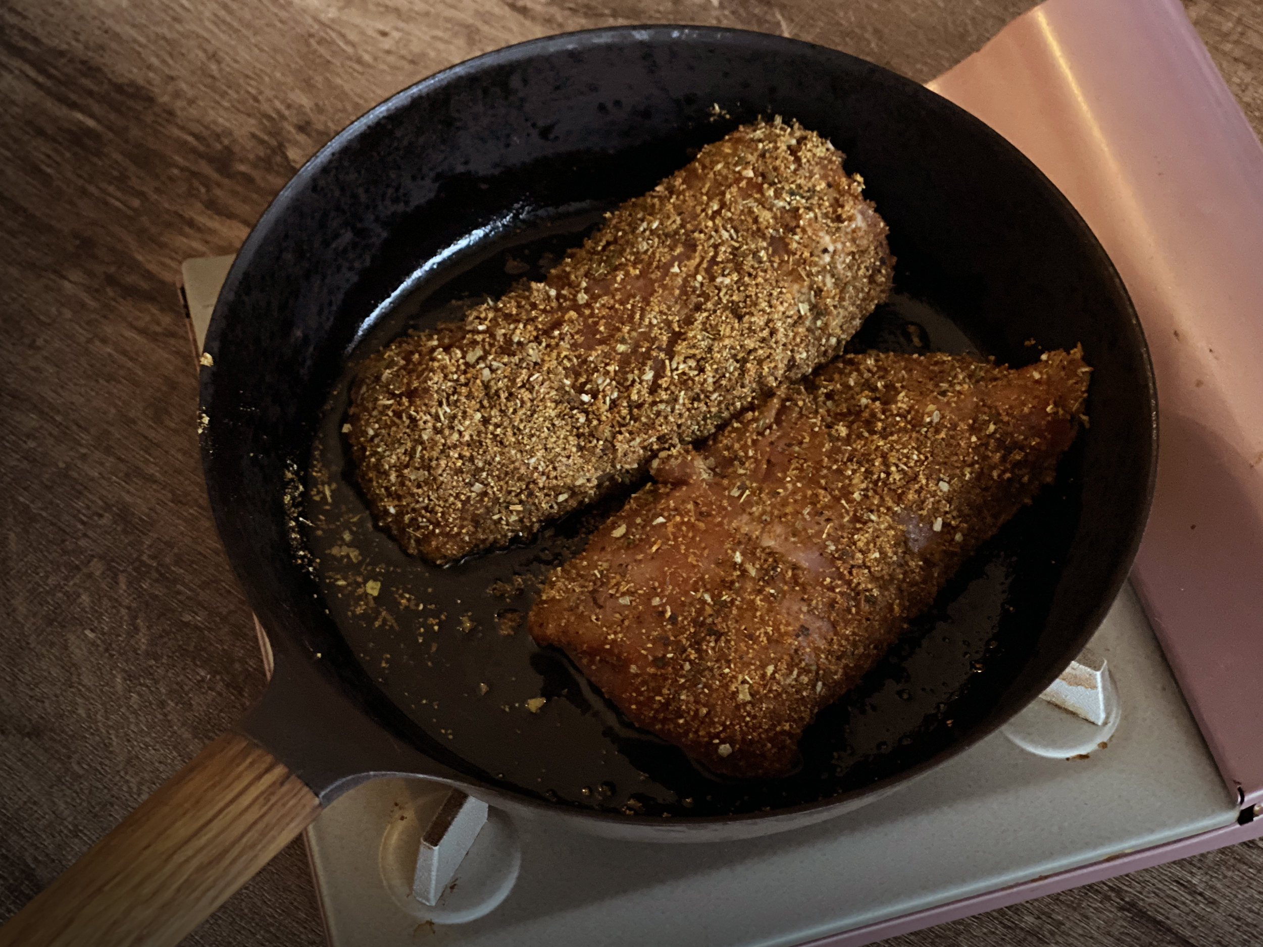 3.中大火熱鍋,待油熱後放上小里肌翻動兩面煎上色 約5-6分鐘