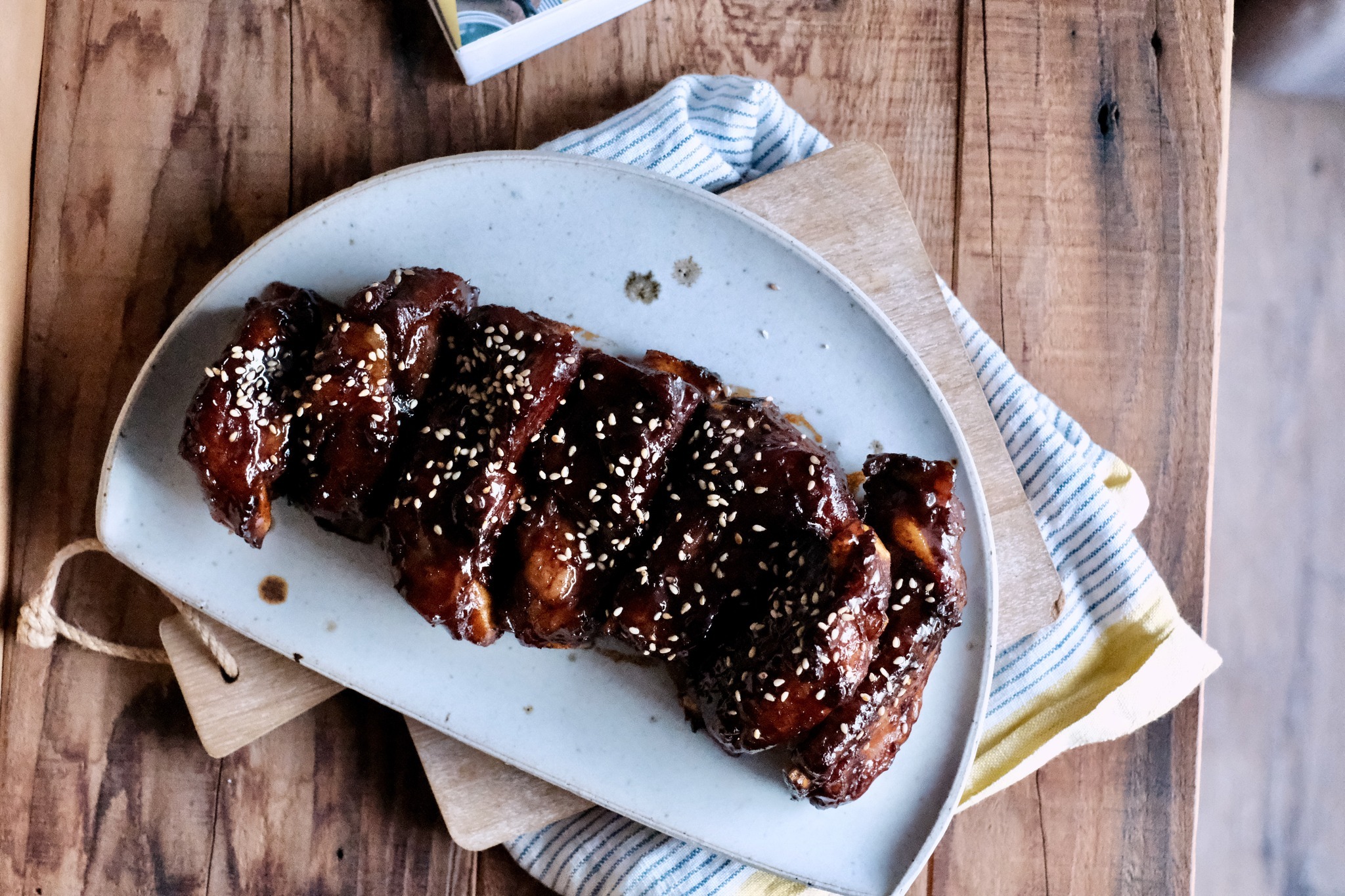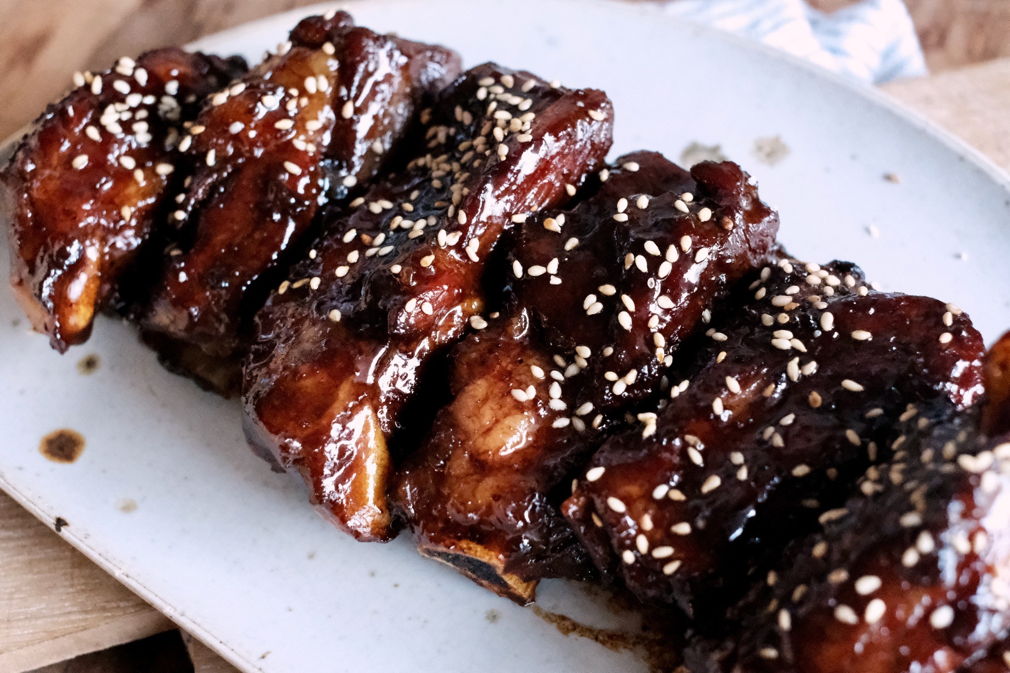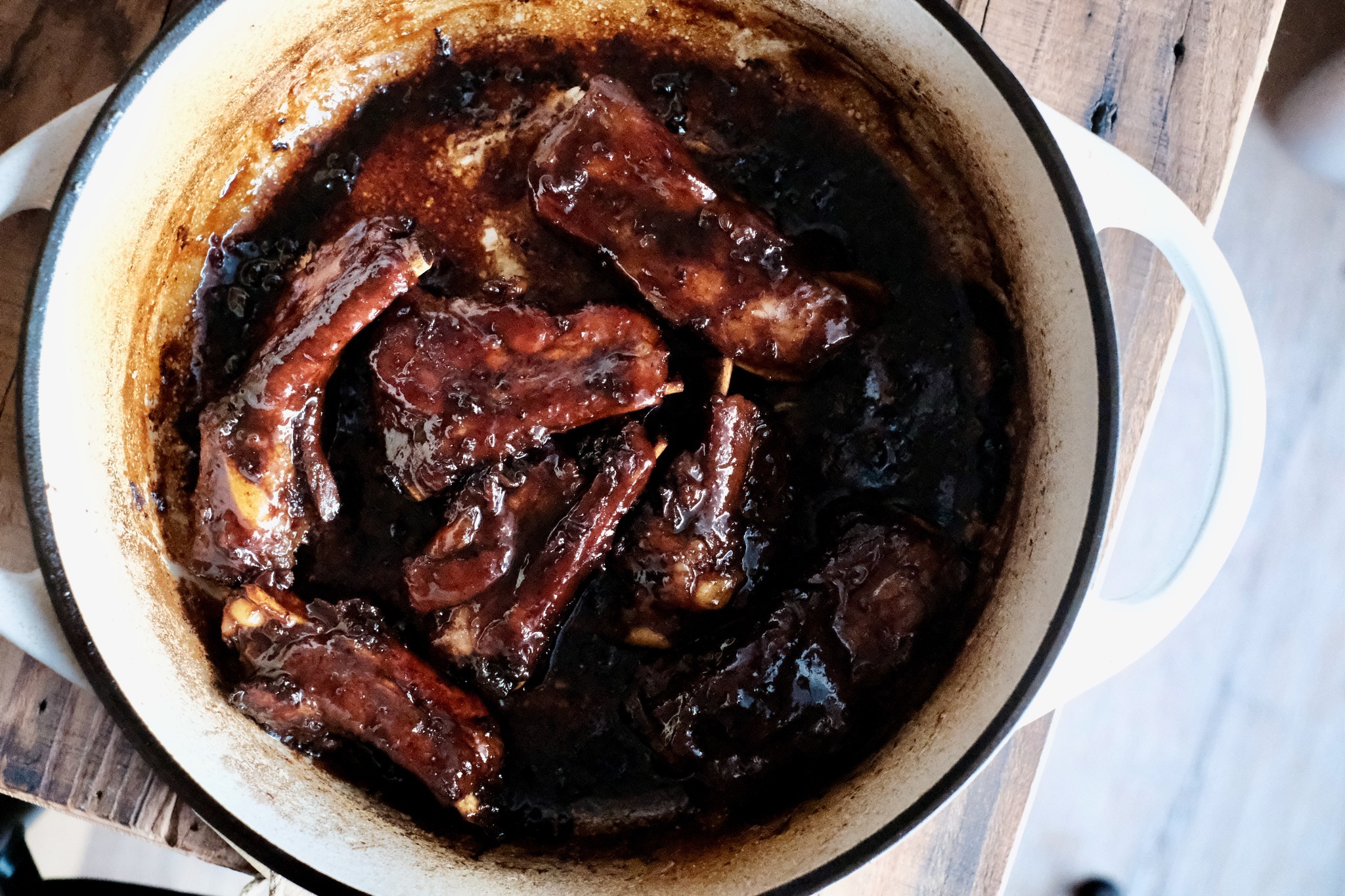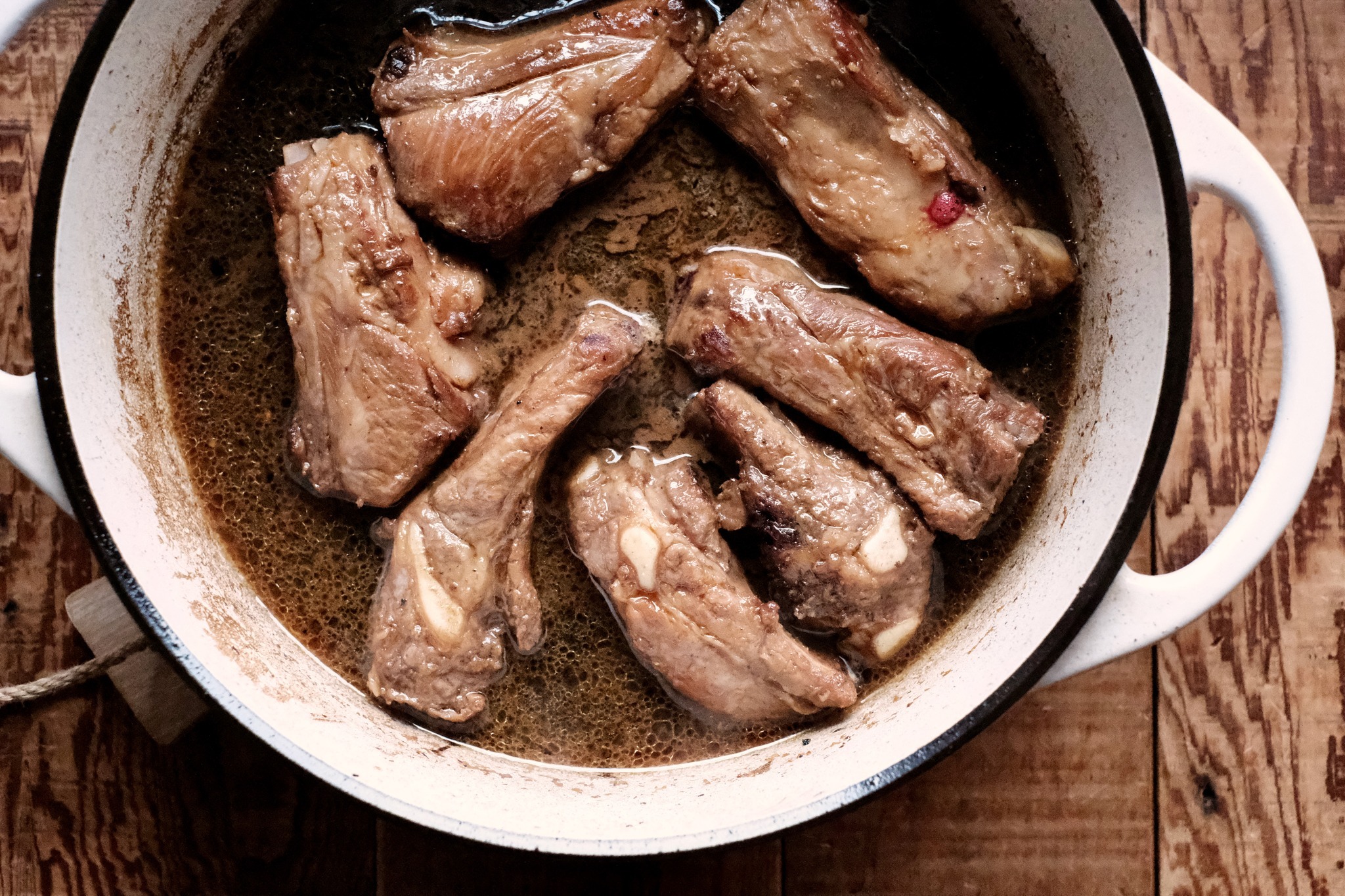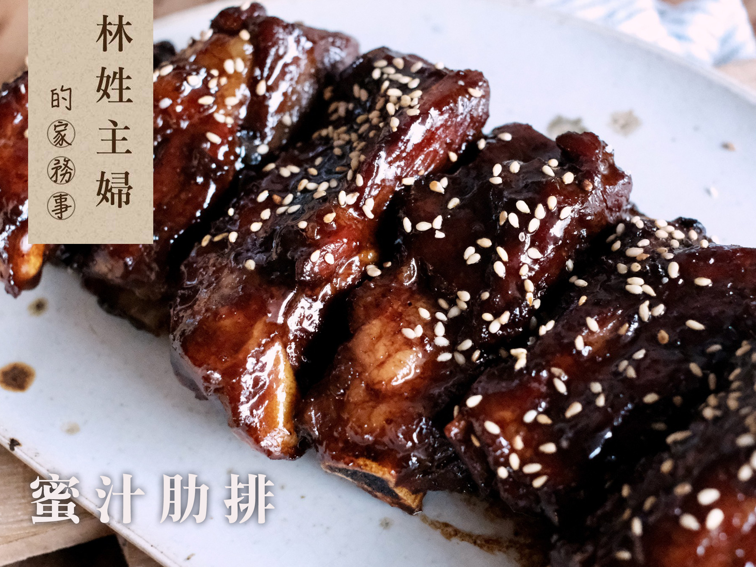 4. 燉煮讓肉軟嫩入味的同時,醬汁也會慢慢收乾,最後會轉濃稠、微冒泡,屆時再淋一小匙蜂蜜,將肋排均勻沾上醬汁,撒上白芝麻裝點,即完成。