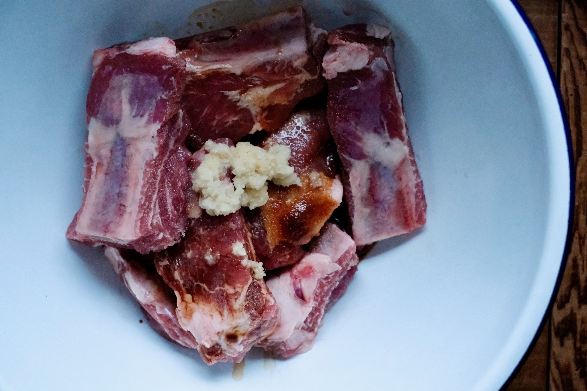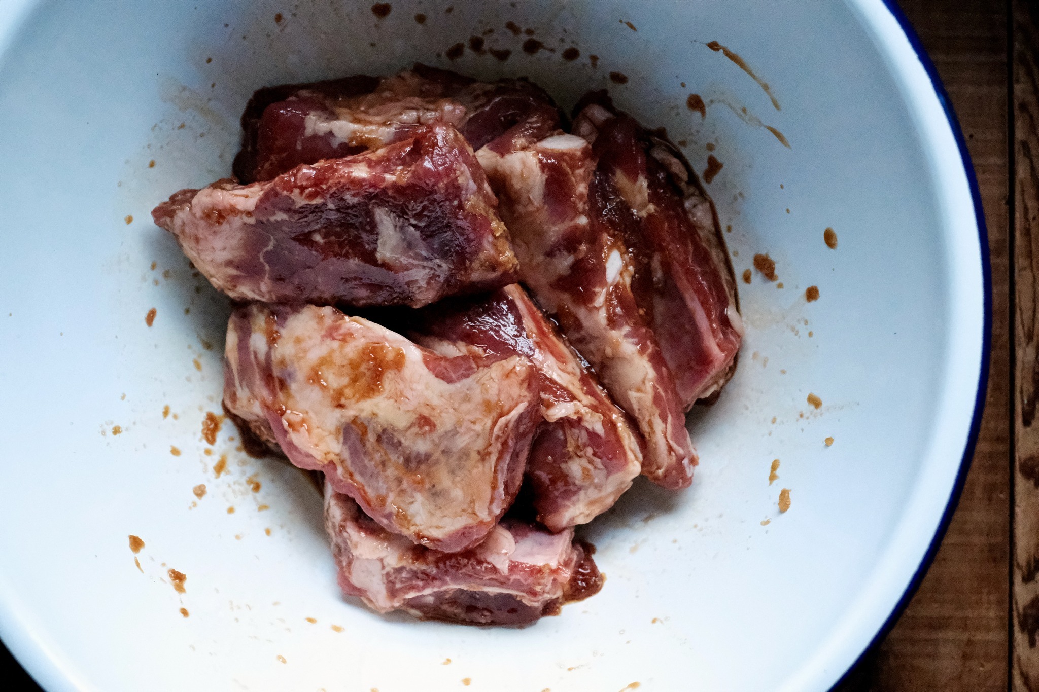 1. 究好豬肋排一包,冷藏退冰後,取出,用一大匙醬油、一大匙紹興酒(可省略)、一小匙白砂糖、一小匙薑末及一小匙蒜末