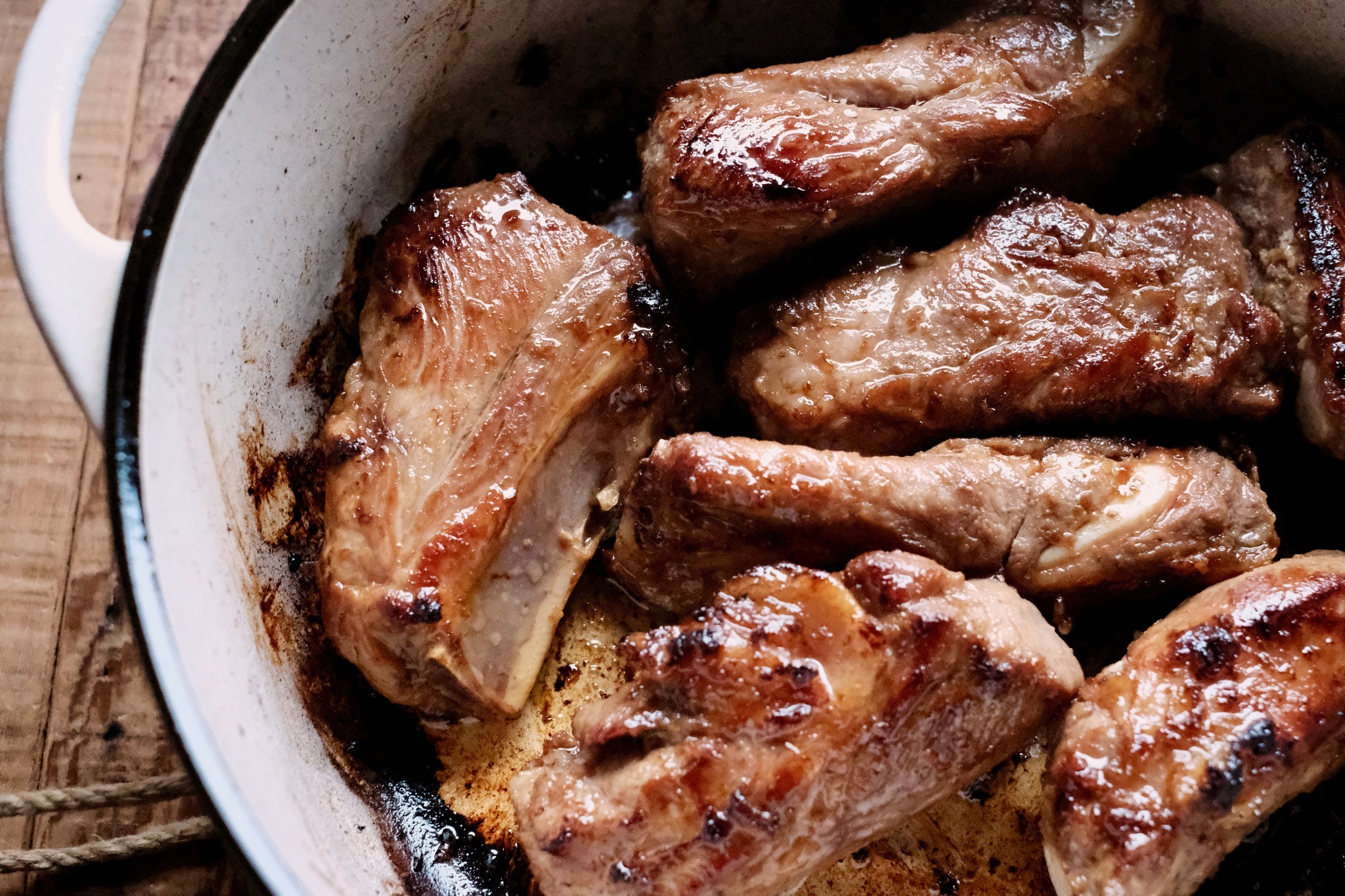 2. 以適量油熱鍋後,將肋排放入,煎至表層上色