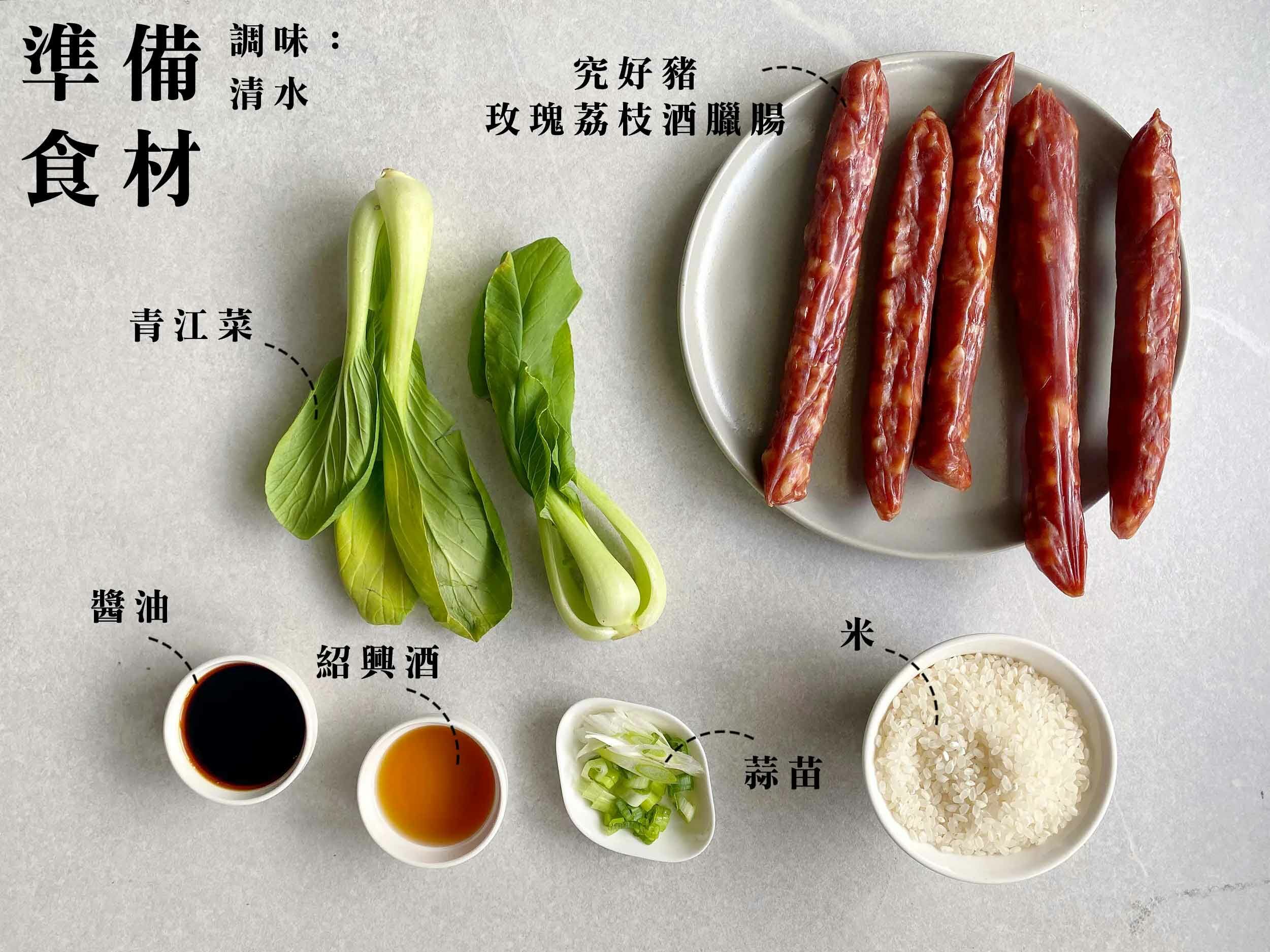 3.電鍋加入米1.5杯與1.5杯水,最後鋪上臘腸條