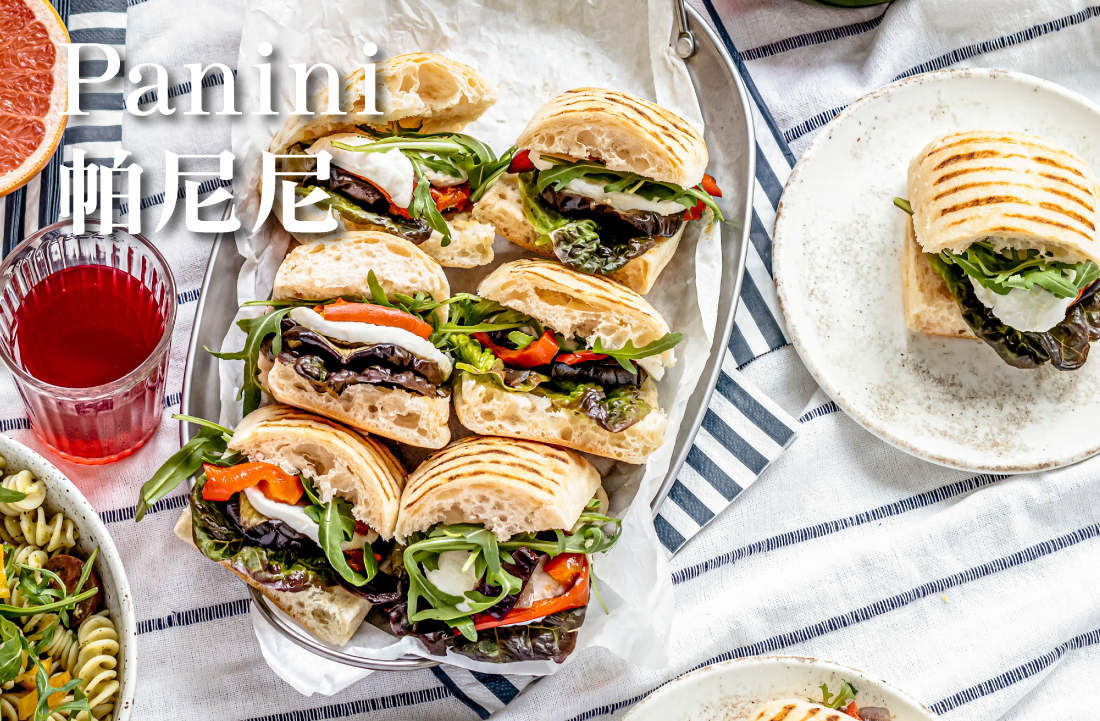 Panini麵包: 專為製作義大利風味三明治而設計的平坦小圓餐包,可在烤爐或平底鍋中壓烤。