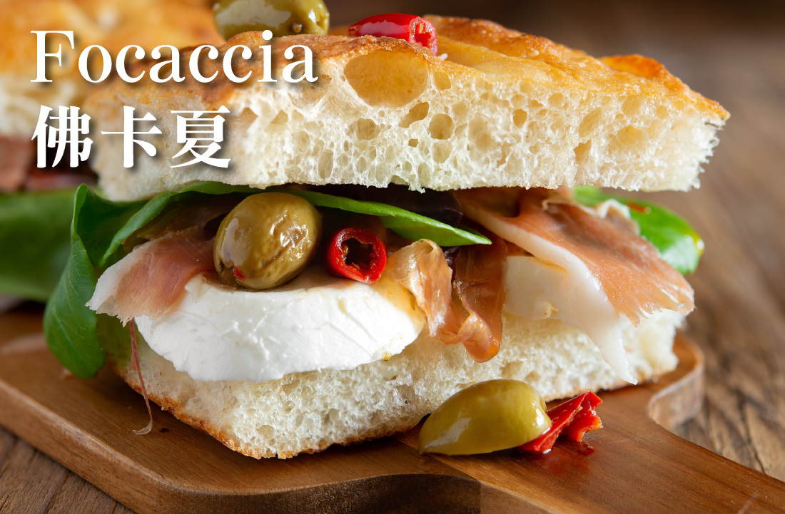 Focaccia(佛卡夏): 厚實且多孔的義大利平麵包,通常在表面灑上橄欖油和香料,提供獨特的口感。