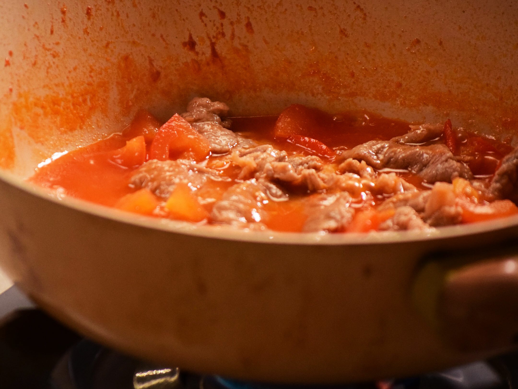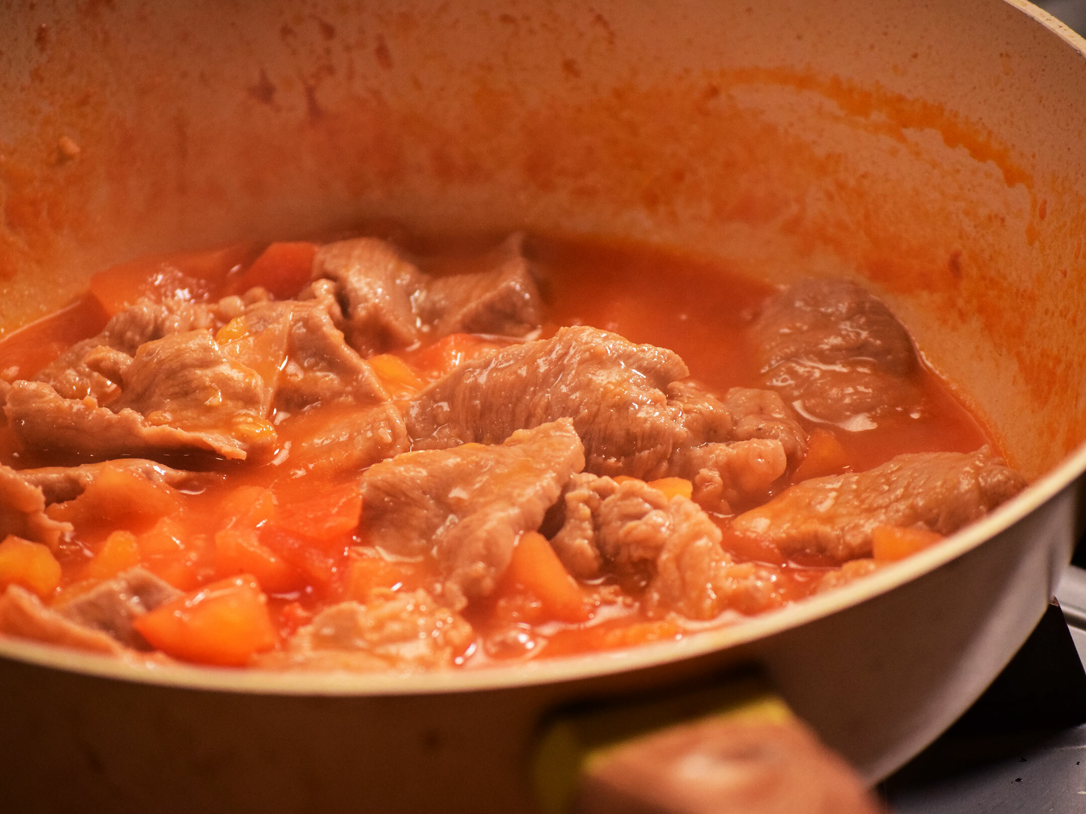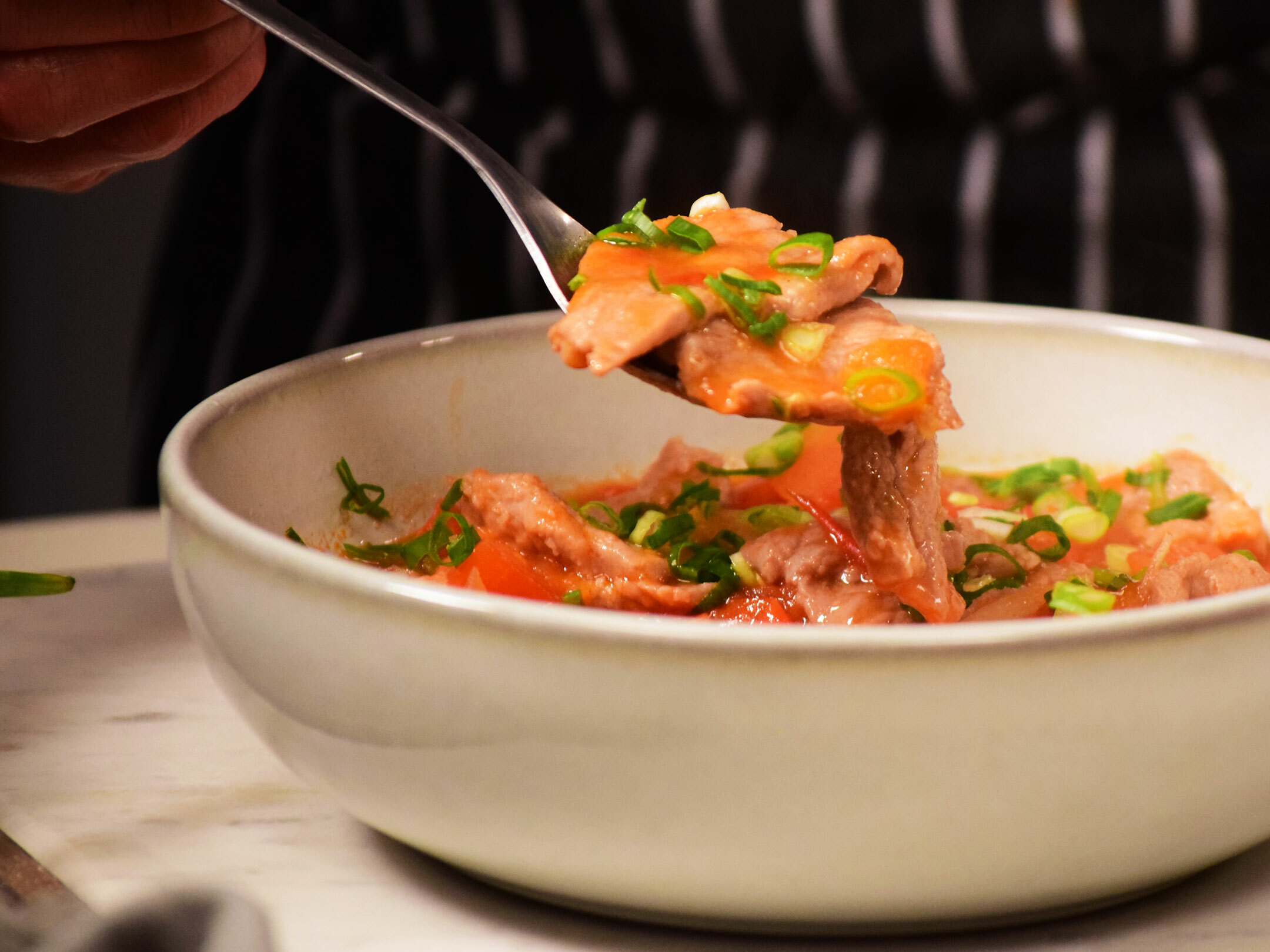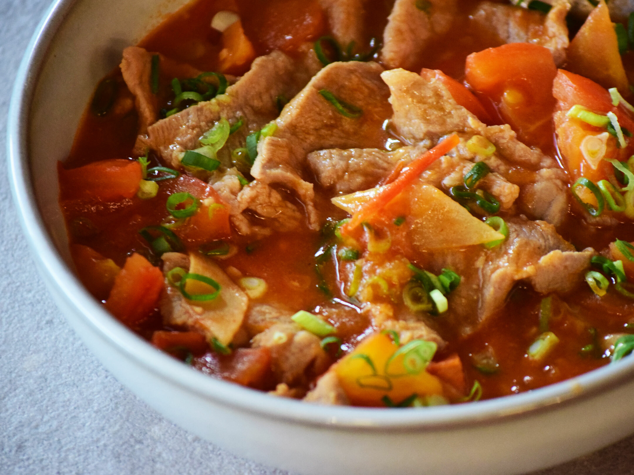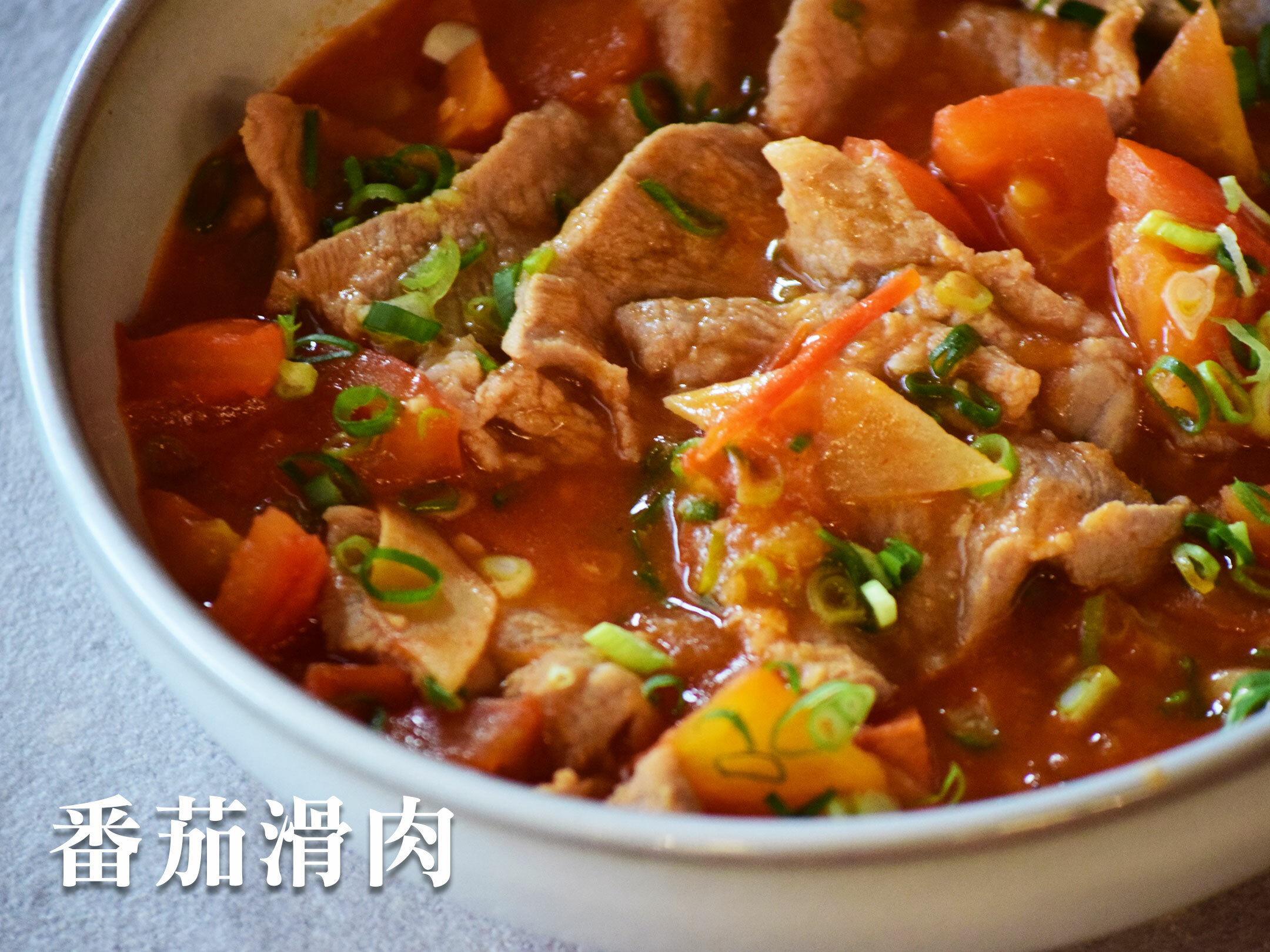 4.將醃製好的豬肉片加入蔥薑水川燙後,放入番茄湯中,輕輕攪拌,確保肉片均勻受熱,煮至熟透(約2-3分鐘)。