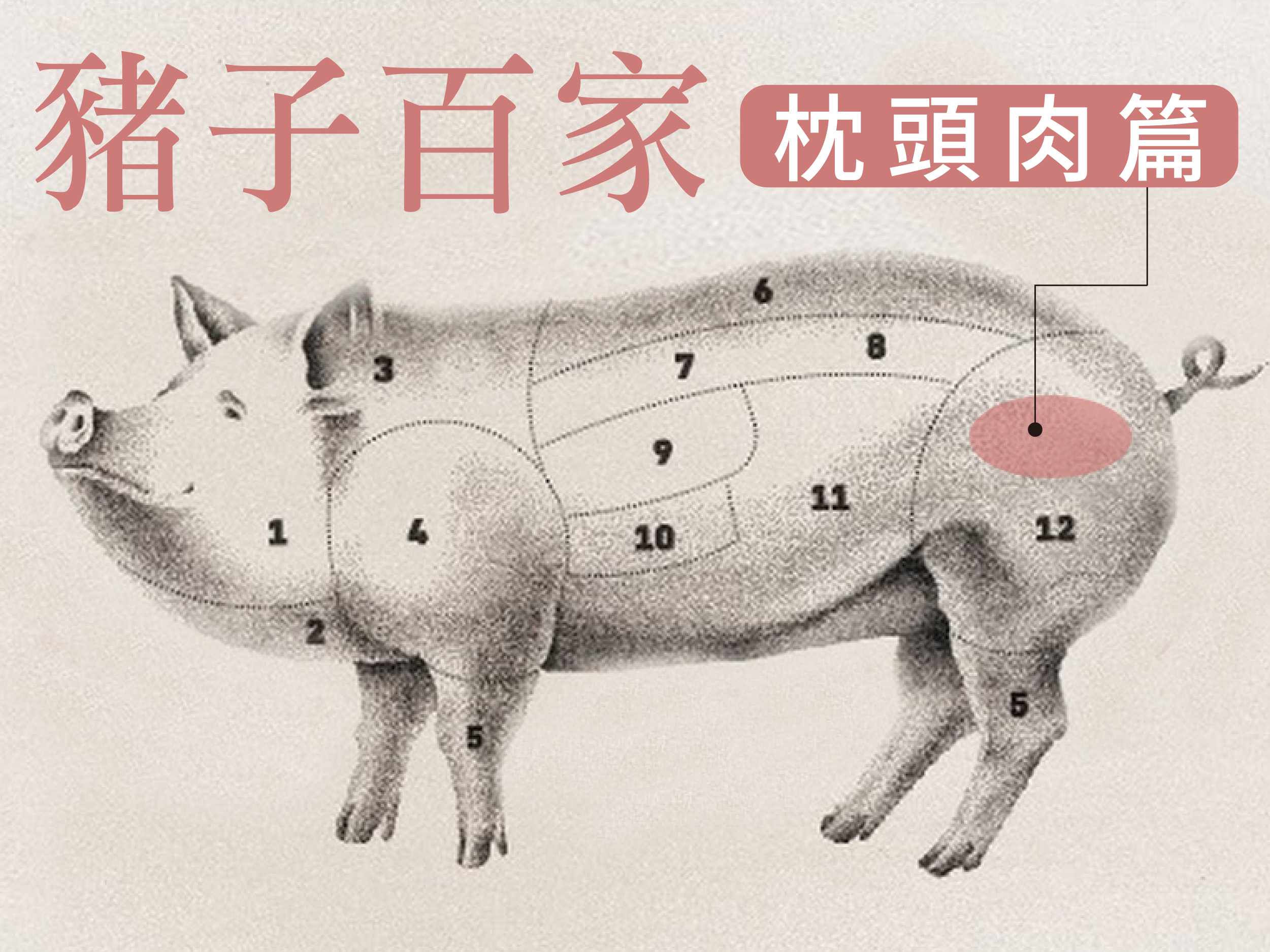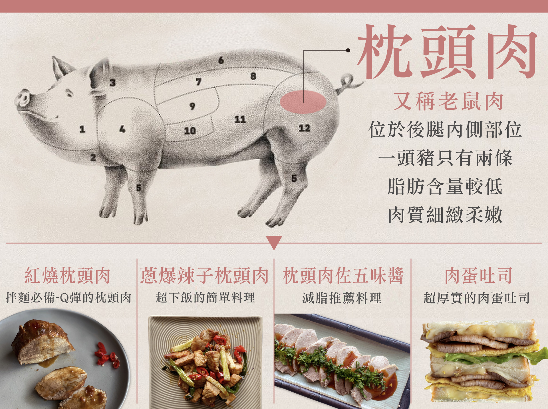 枕頭肉是一塊緊實的肉塊,位在後腿心,油脂含量小,一隻豬只有兩塊。它是豬隻經常活動的部位,口感有嚼度,卻不過硬,如果你怕肥肉,那這塊是 - 瘦肉愛好者的必選。