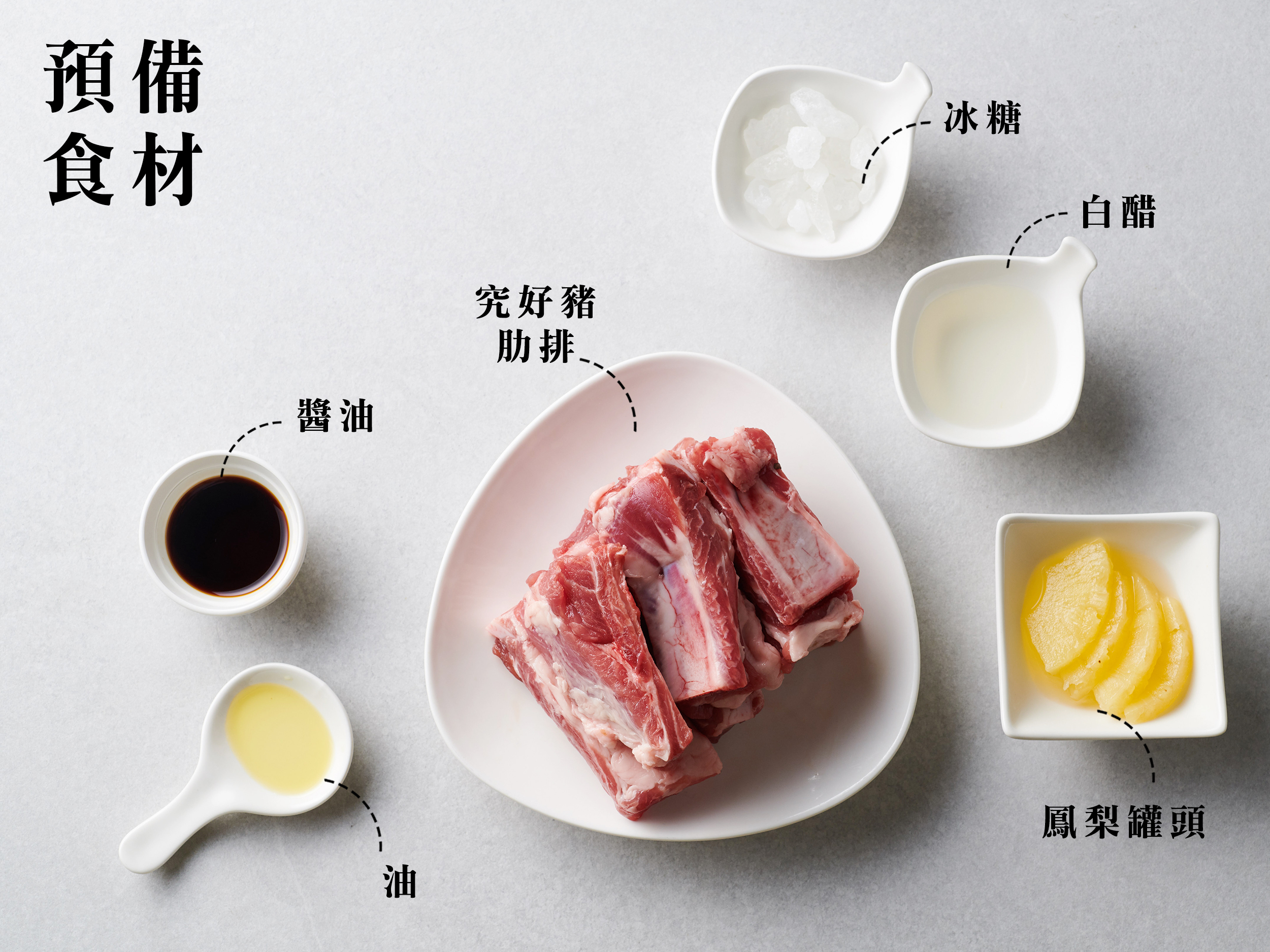 3.加入冰糖、醬油、白醋、鳳梨(含鳳梨汁)與水燉煮