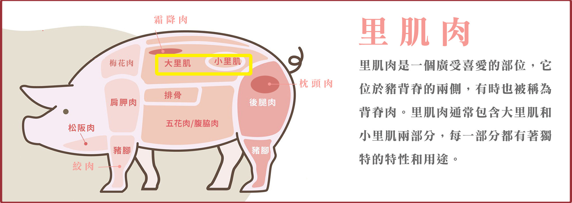 * 里肌肉位於豬的背脊兩側,有時也被稱為背脊肉。